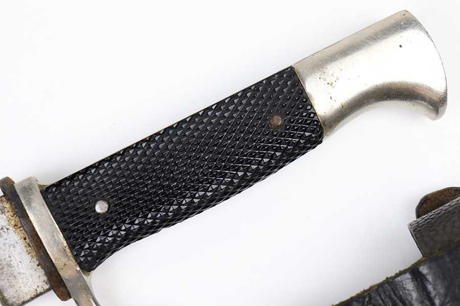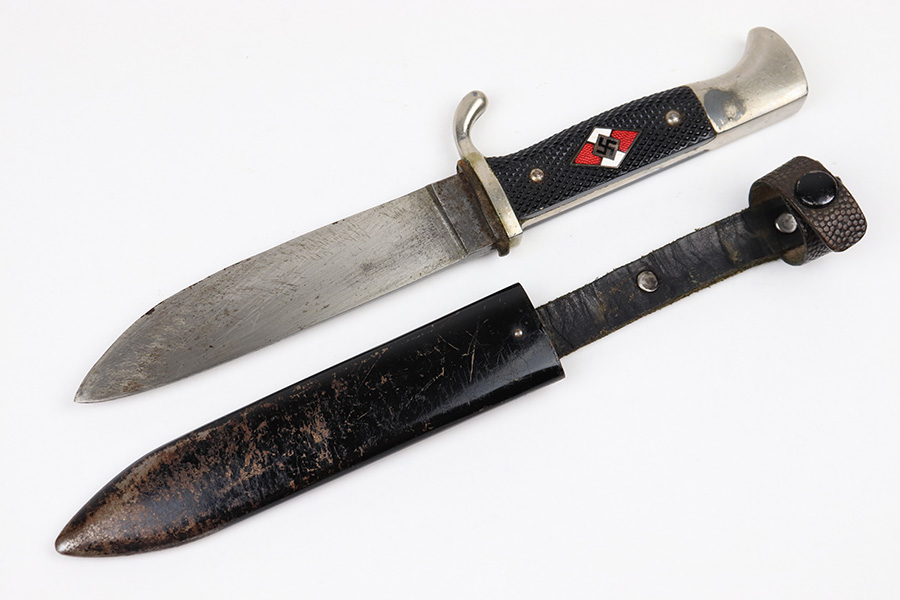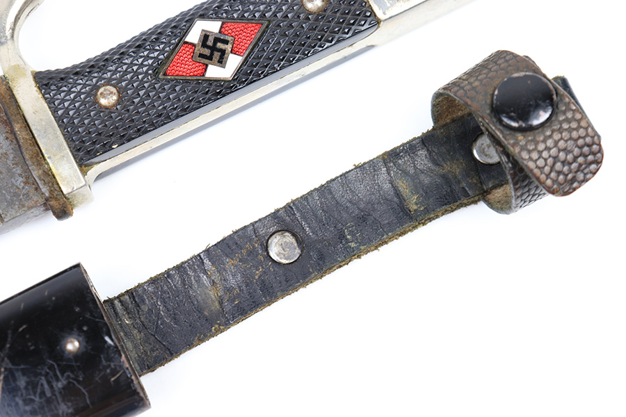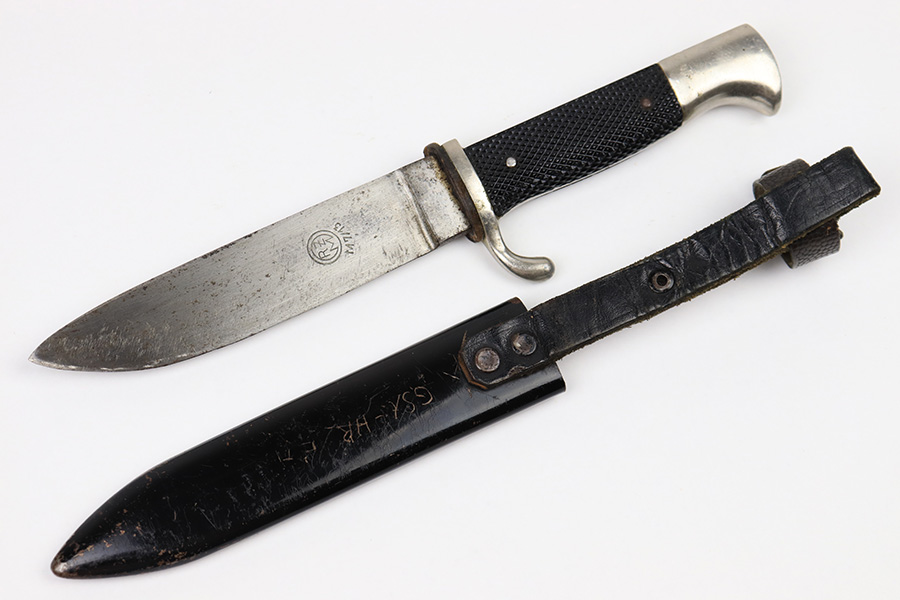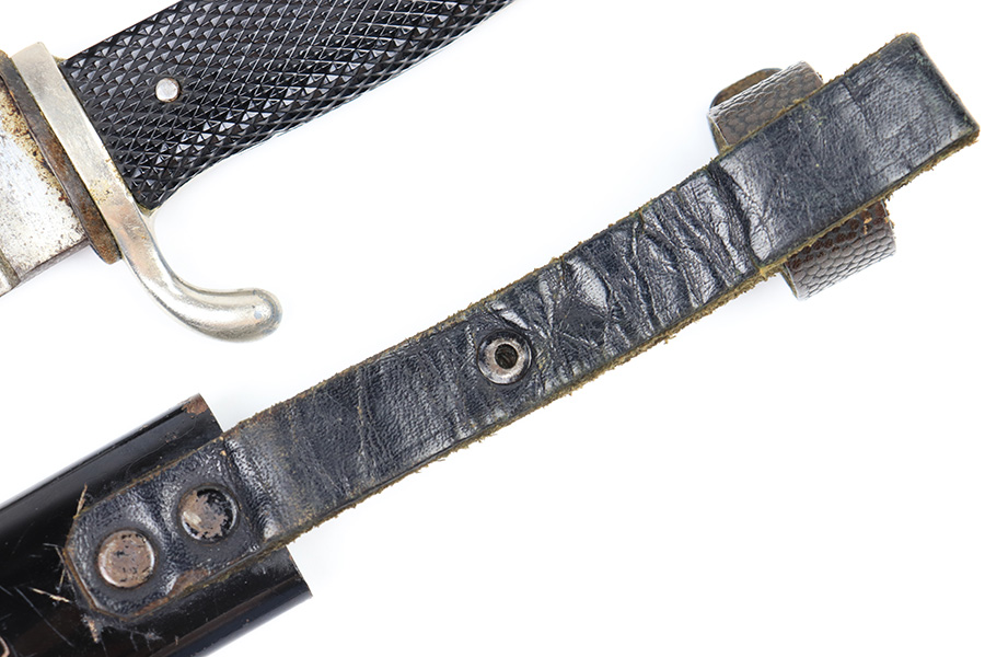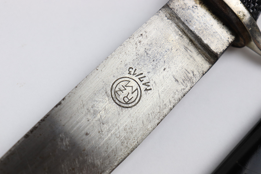 7/1/22 – This is an original RZM stamped Hitler Youth Knife. The knife is a wartime variation without the Blut und Ehre inscription. Instead, the blade is RZM maker stamped M7/13. The blade has spotty discoloration and light surface scratches throughout. There’s also mild signs of previous use and sharpening along the edge. The leather stopper is still in tact. The grip is in great condition with some mild patina on the metal hand guard and pommel. The scabbard has the original leather frog in great shape and the scabbard has some paint loss near the tip.