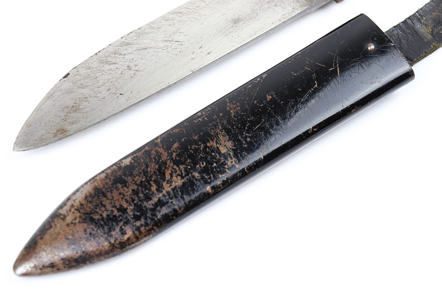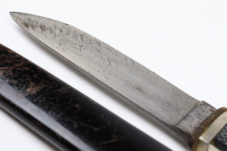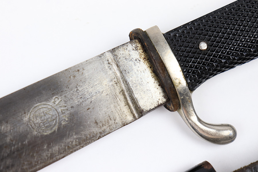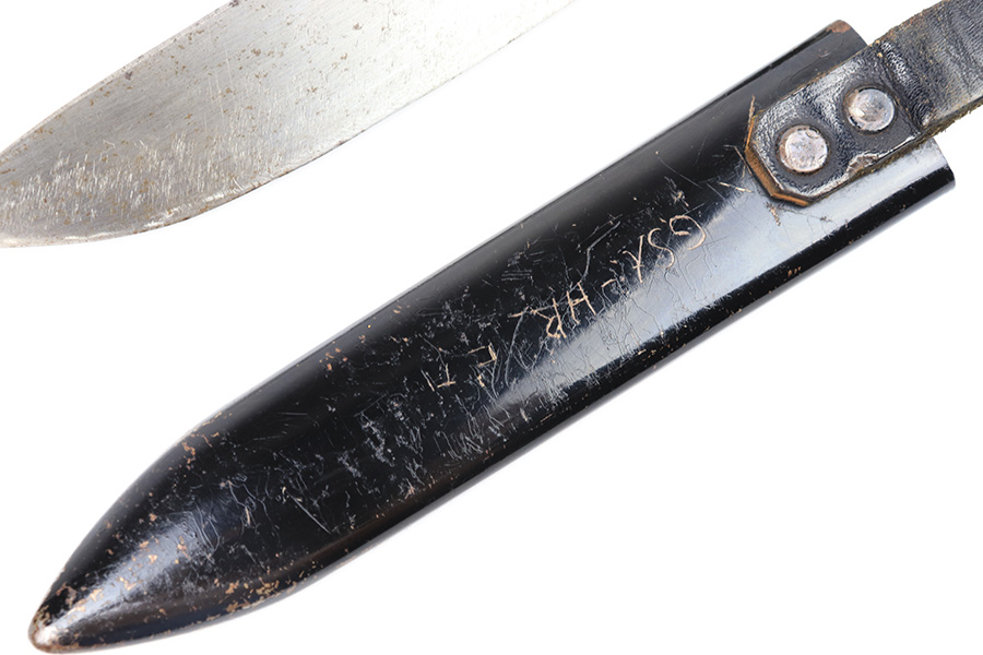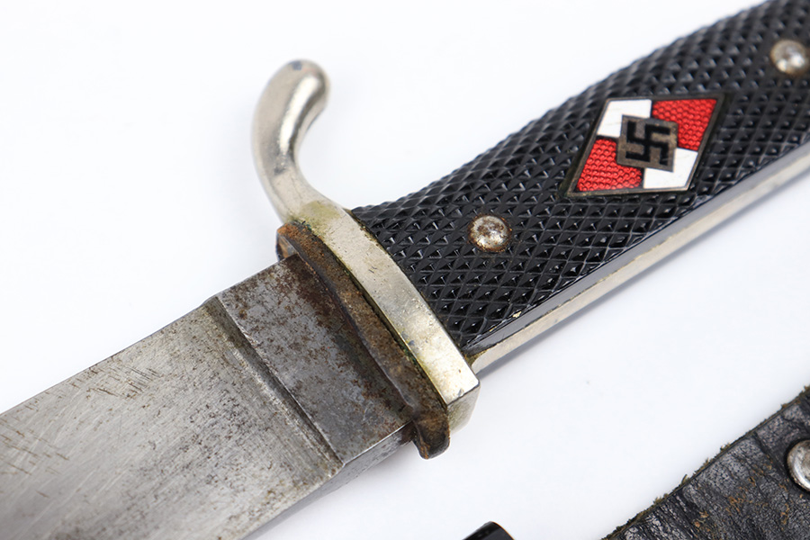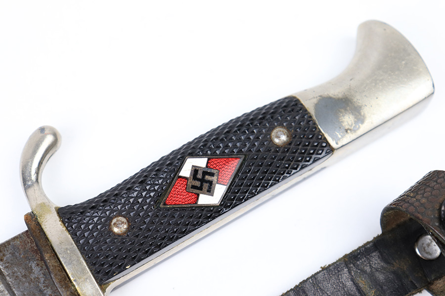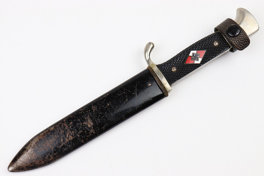 7/1/22 – This is an original RZM stamped Hitler Youth Knife. The knife is a wartime variation without the Blut und Ehre inscription. Instead, the blade is RZM maker stamped M7/13. The blade has spotty discoloration and light surface scratches throughout. There’s also mild signs of previous use and sharpening along the edge. The leather stopper is still in tact. The grip is in great condition with some mild patina on the metal hand guard and pommel. The scabbard has the original leather frog in great shape and the scabbard has some paint loss near the tip.