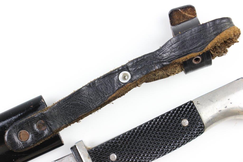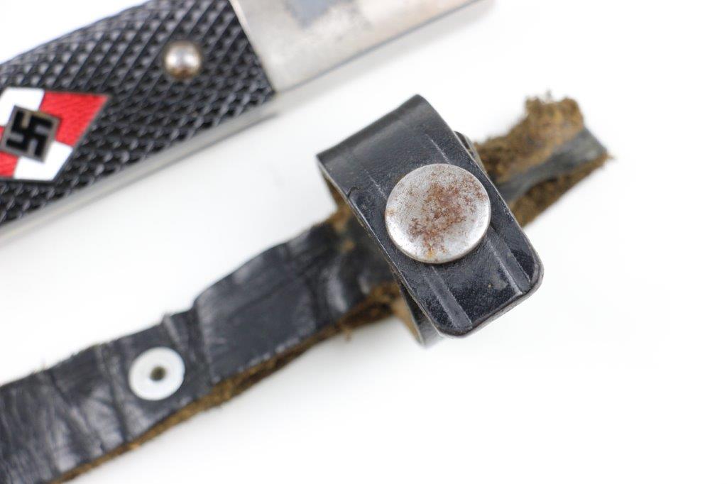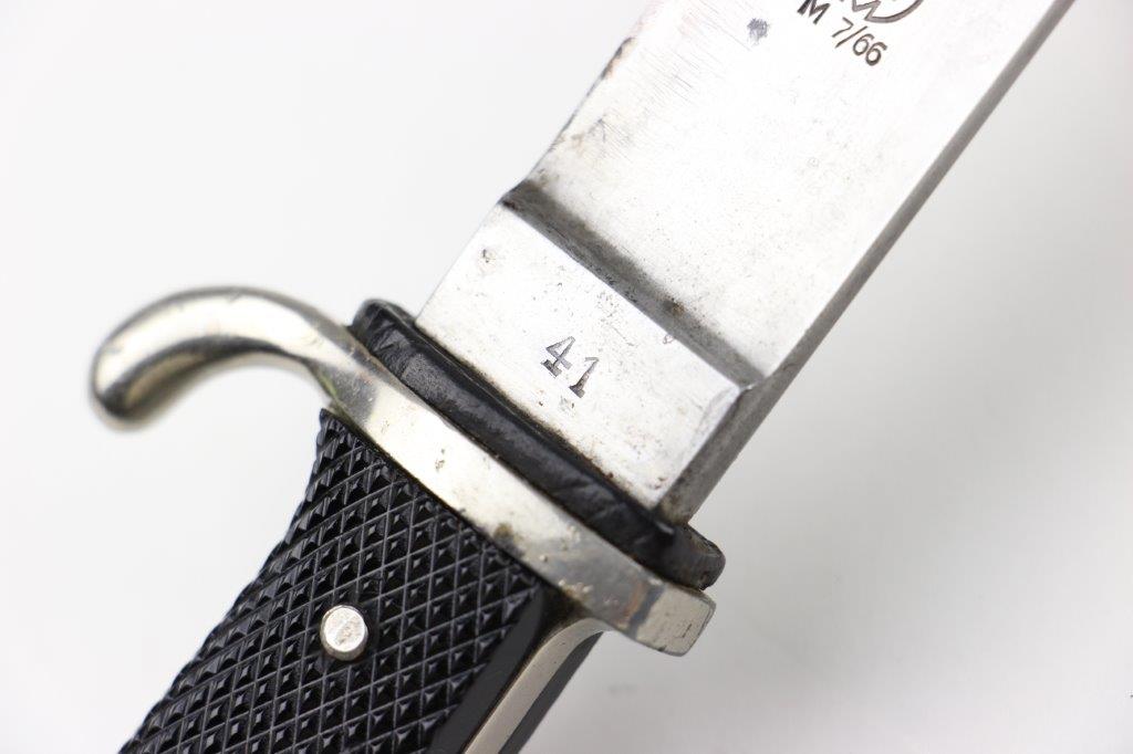 2/28/24 – This is a WW2 original RZM Hitler Youth Knife with an original scabbard and attached leather frog. The dagger is a wartime production example with a larger ricasso and maker marked blade. One side of the blade is stamped with an Eickhorn logo and “RZM M7/66” underneath. The base of the blade is dated “41” as well. The blade has some light surface scratches and mild patina throughout but is in very good overall condition. The edge shows light sharpening and use (these were often heavily used by the DJ during WW2). The leather stopper is original and intact. Very nice original grips and clean emblem embedded on one side. The hand guard and pommel show light patina and surface wear. The scabbard is in great condition with some minor dents along the top / mouth. The toe of the scabbard has light finish loss. Original leather frog is still in great shape and attached as shown.