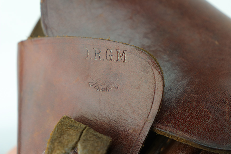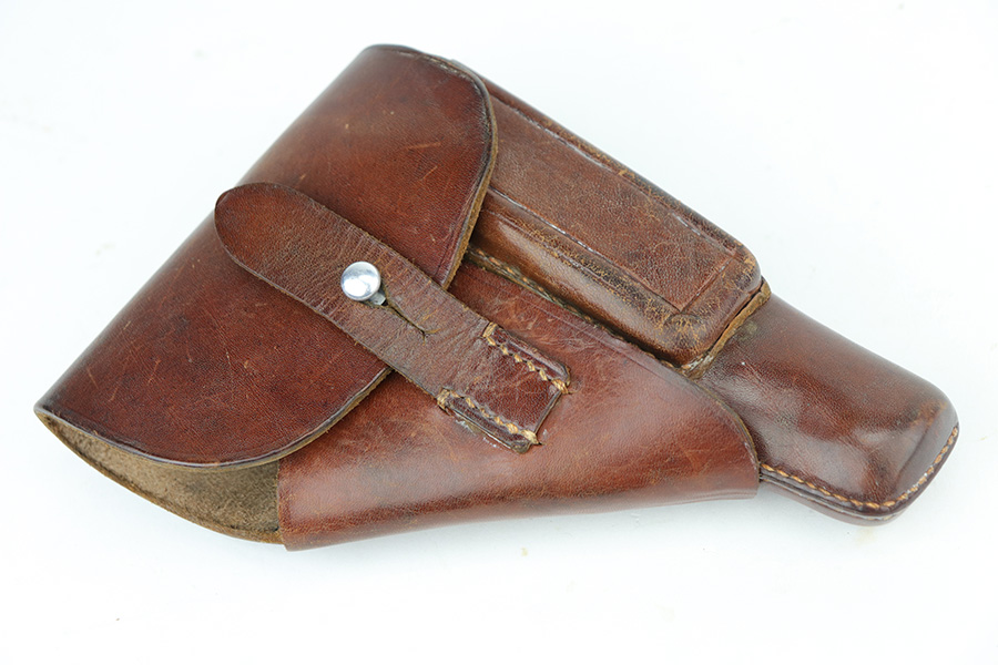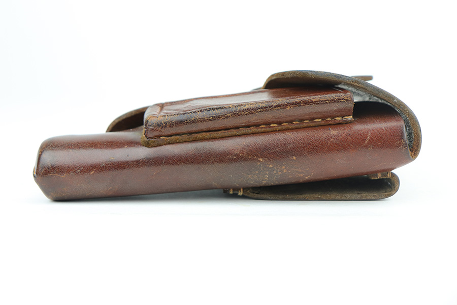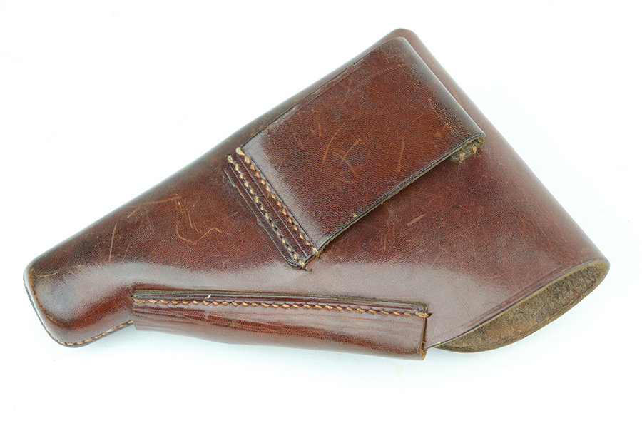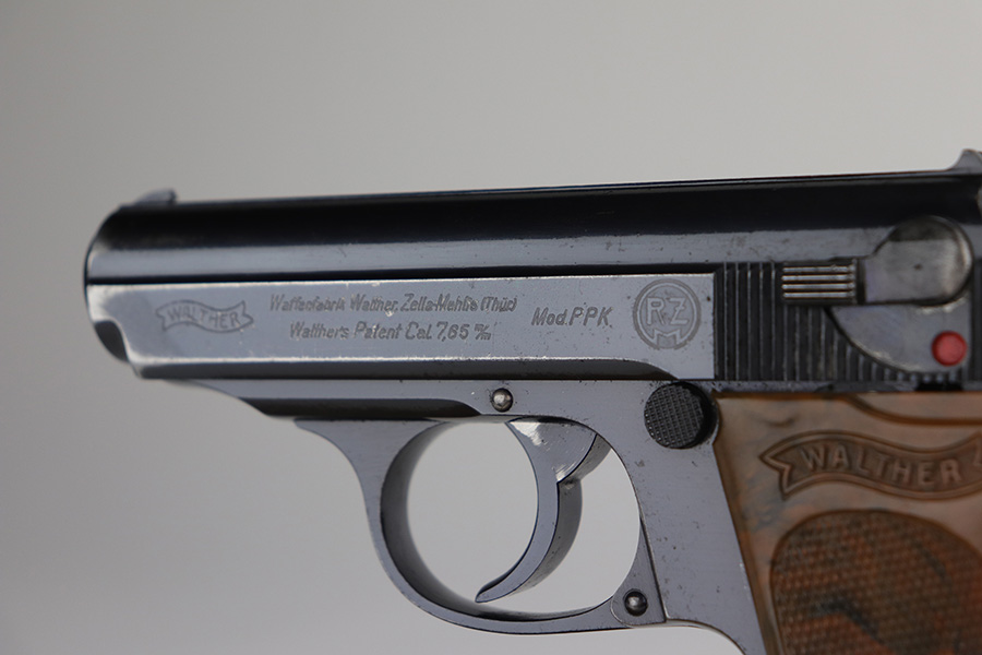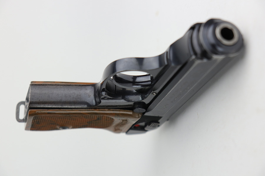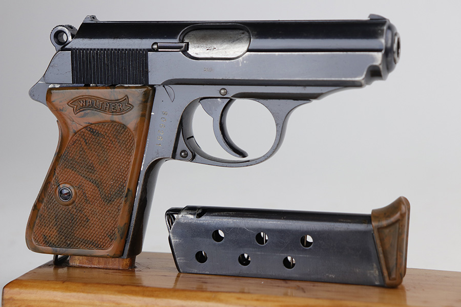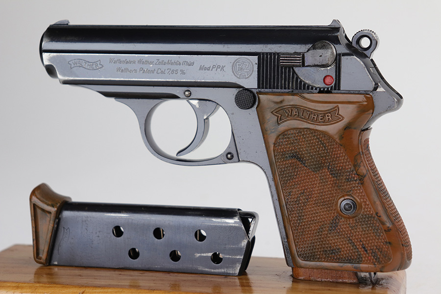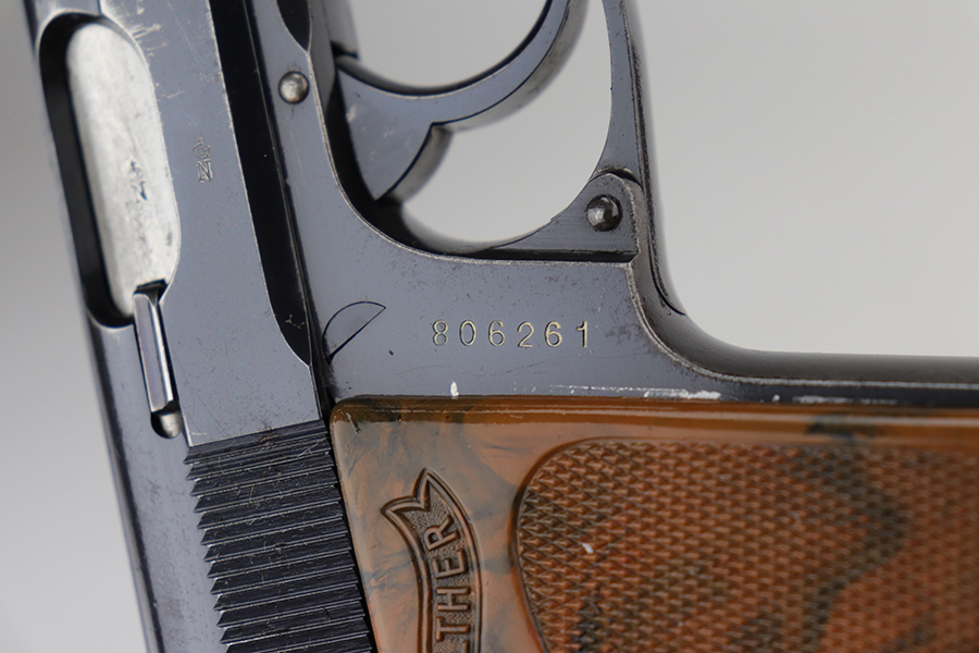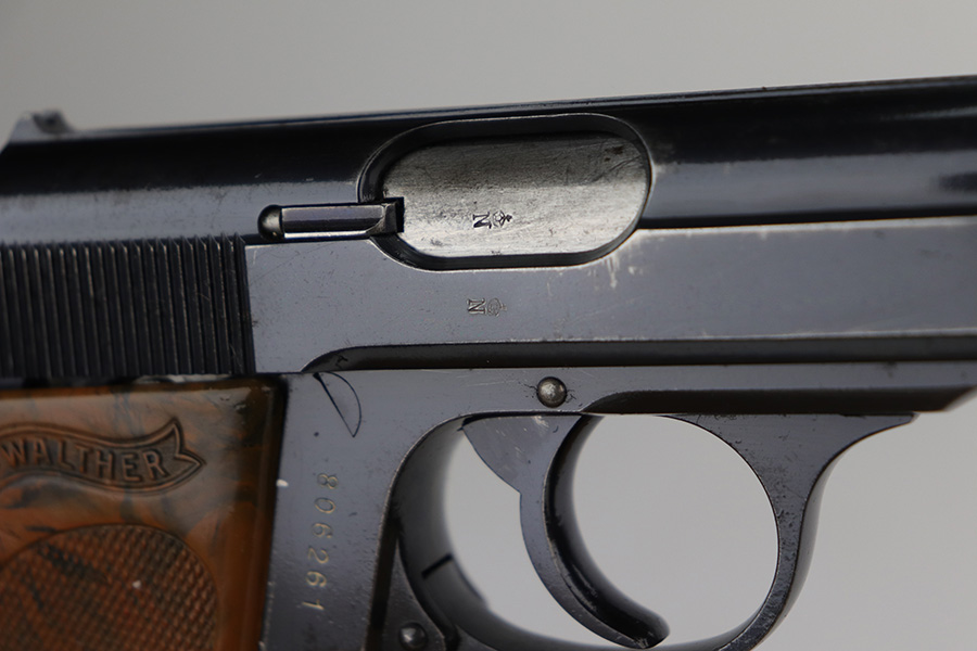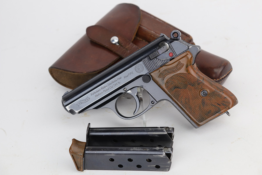 9/1/21 – This is a very nice example of an RZM-marked Walther PPK manufactured in 1934. It is all matching, has the proper “Crown N” commercial proofs, and has the proper “RZM” marking on the left side of the slide. The rig comes with an excellent Akah brown leather holster, one Walther banner flat bottom magazine, and a Walther banner brown finger extension magazine. The gun has retained about 93% of its bluing. There is wear concentrated on the high edges of the slide and around the muzzle. Some spotty, scratchy wear on the right side of the slide. Spotty oxidation on the front strap. Excellent brown grip with just one hairline crack on the right side – barely noticeable. Minty bore.