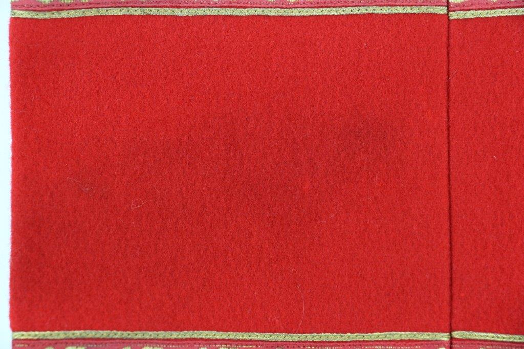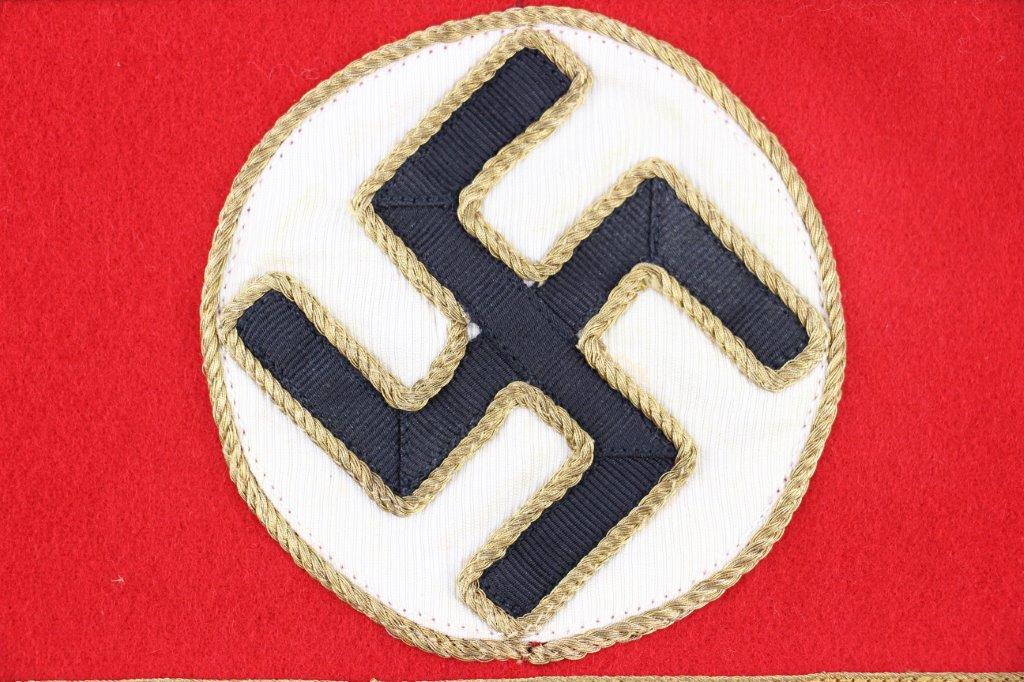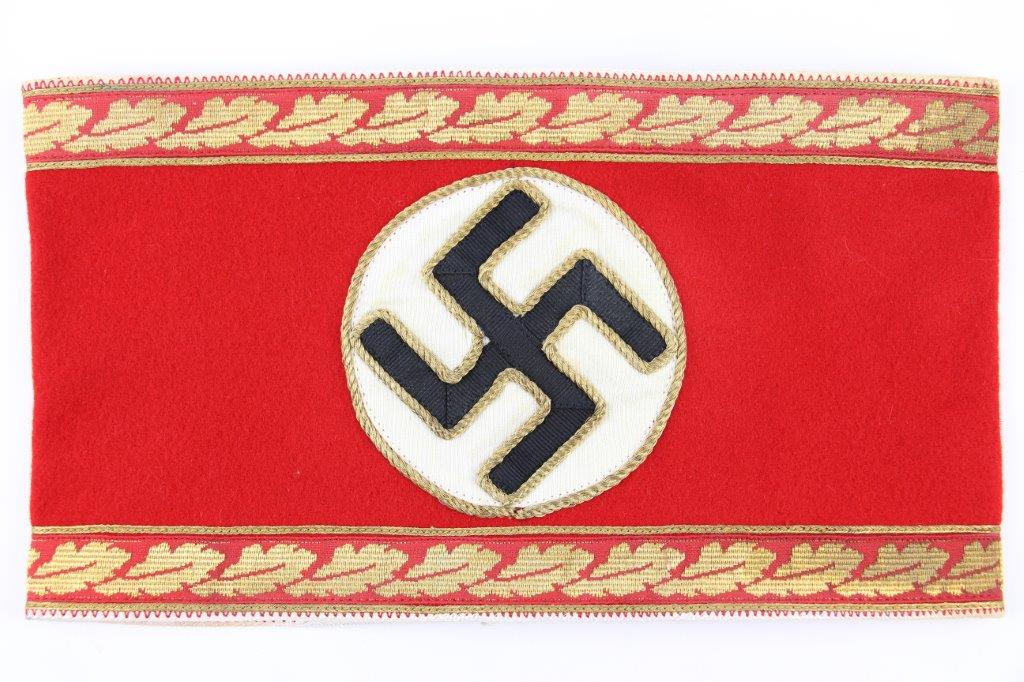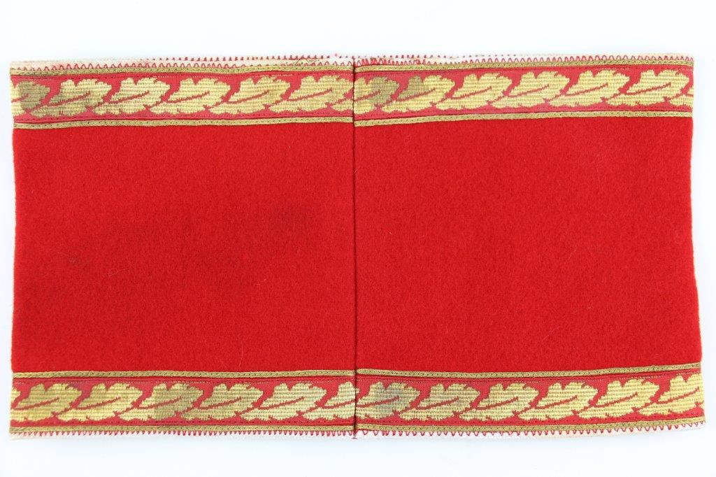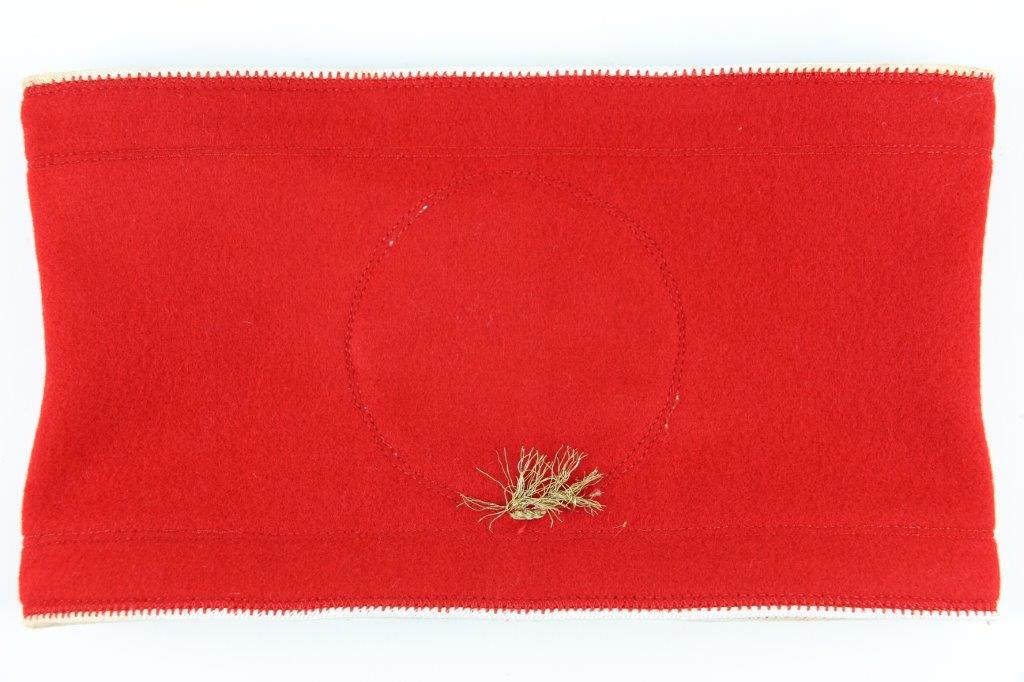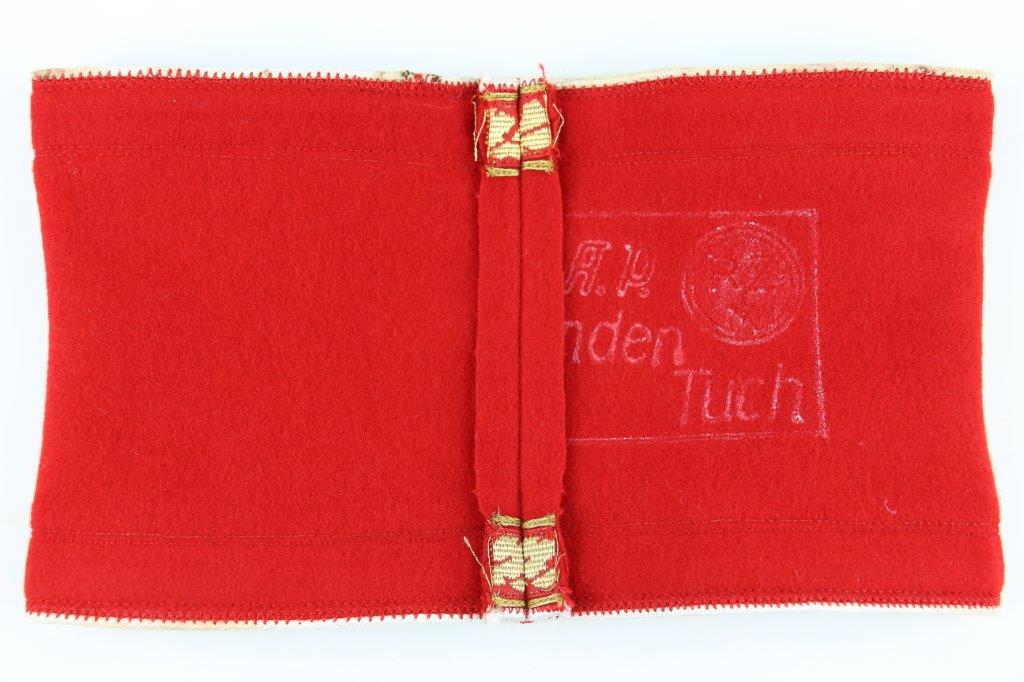6/24/24 – This is an original, rare variation WW2 German Party Leader Uniform Armband. The armband is all original with gold bullion edging around the swastika, central white circle, and oak-leaf borders of the edge pattern. The top and bottom of the armband features white piping for “Kries” level / rank. The armband is wool construction with vibrant red that has no staining or holes of note. There is some mild staining and light age wear on the central white circle, and along the oak-leaf edge of the armband. The interior of the armband has a faint RZM maker marking, with other faint white colored writing from the manufacturer. All stitching is excellent and original, passing a black light inspection for synthetic threads. The width is about 128mm, or 5 inches wide (wider than a typical Nazi armband).