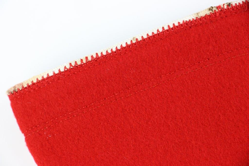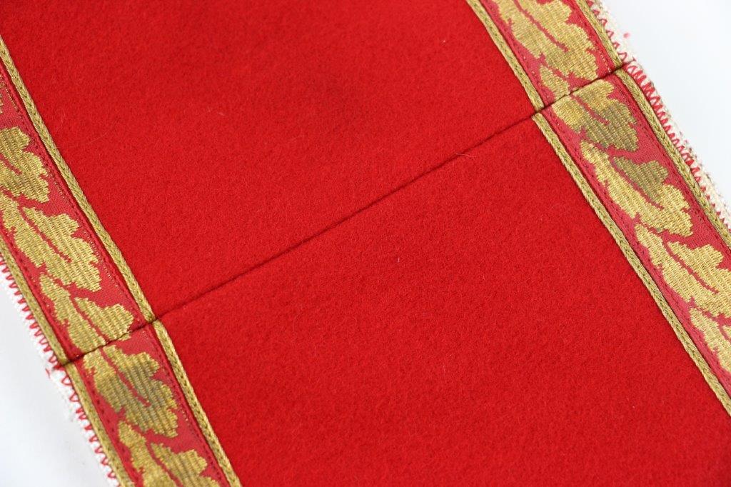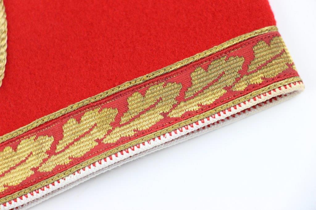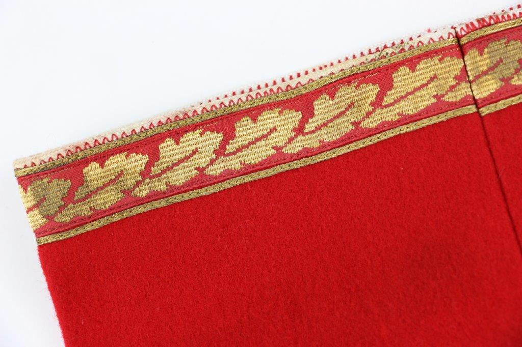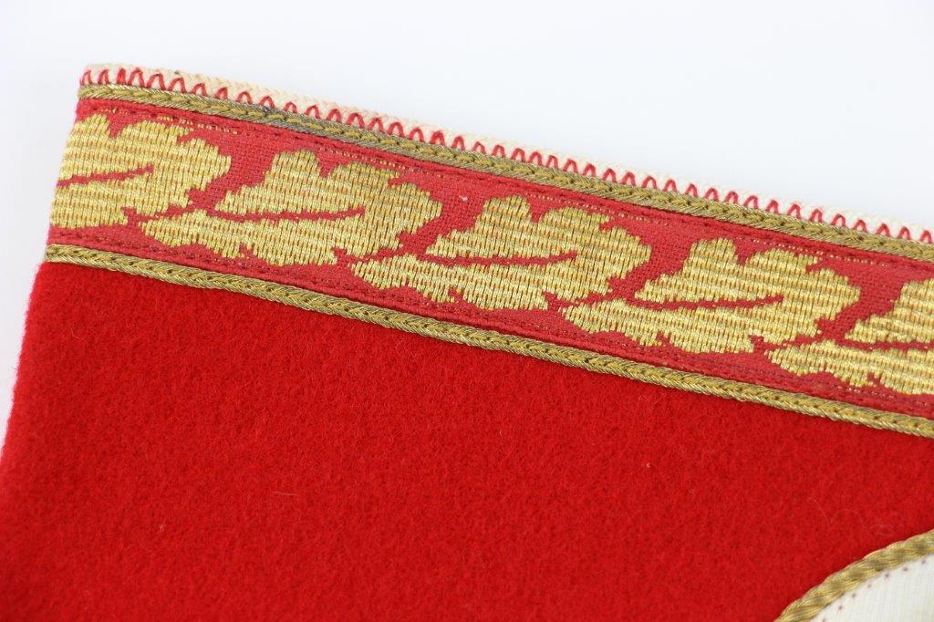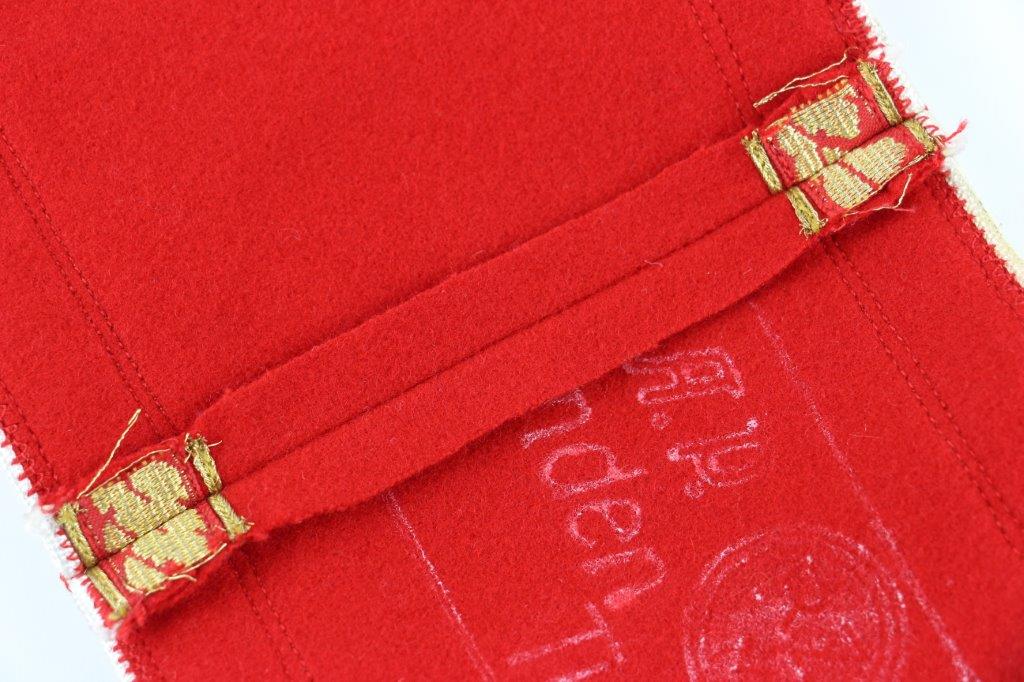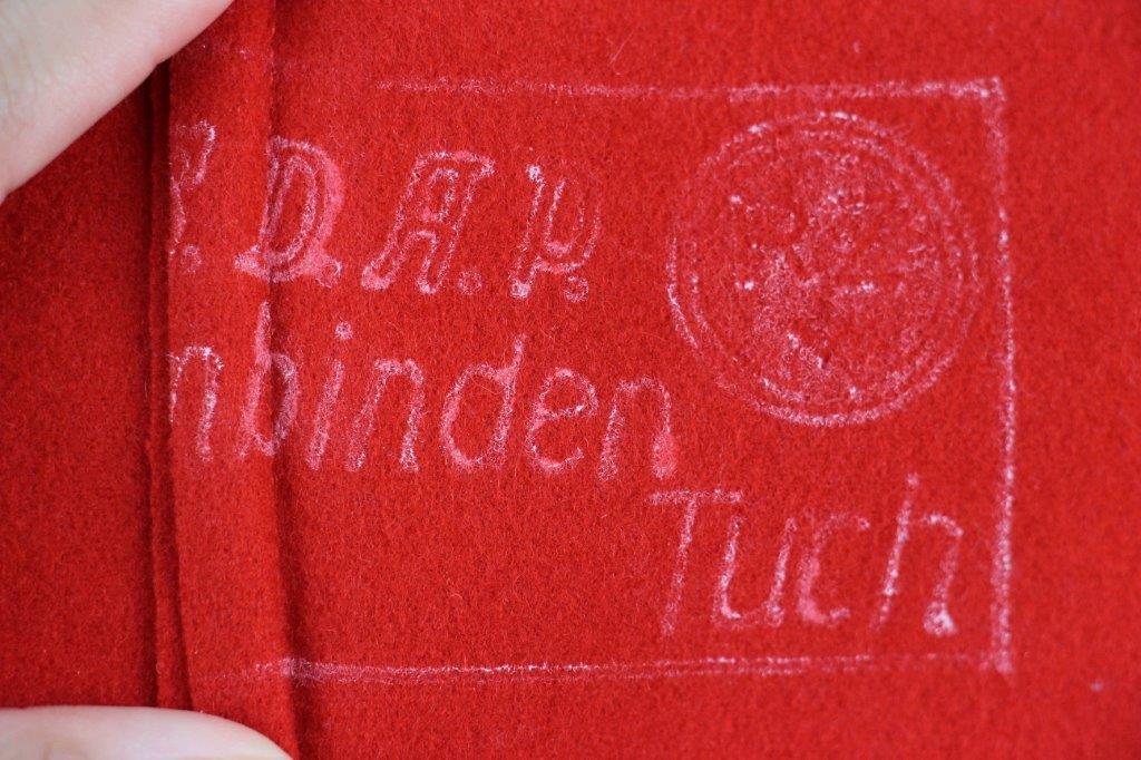 6/24/24 – This is an original, rare variation WW2 German Party Leader Uniform Armband. The armband is all original with gold bullion edging around the swastika, central white circle, and oak-leaf borders of the edge pattern. The top and bottom of the armband features white piping for “Kries” level / rank. The armband is wool construction with vibrant red that has no staining or holes of note. There is some mild staining and light age wear on the central white circle, and along the oak-leaf edge of the armband. The interior of the armband has a faint RZM maker marking, with other faint white colored writing from the manufacturer. All stitching is excellent and original, passing a black light inspection for synthetic threads. The width is about 128mm, or 5 inches wide (wider than a typical Nazi armband).