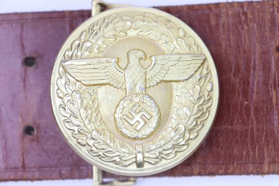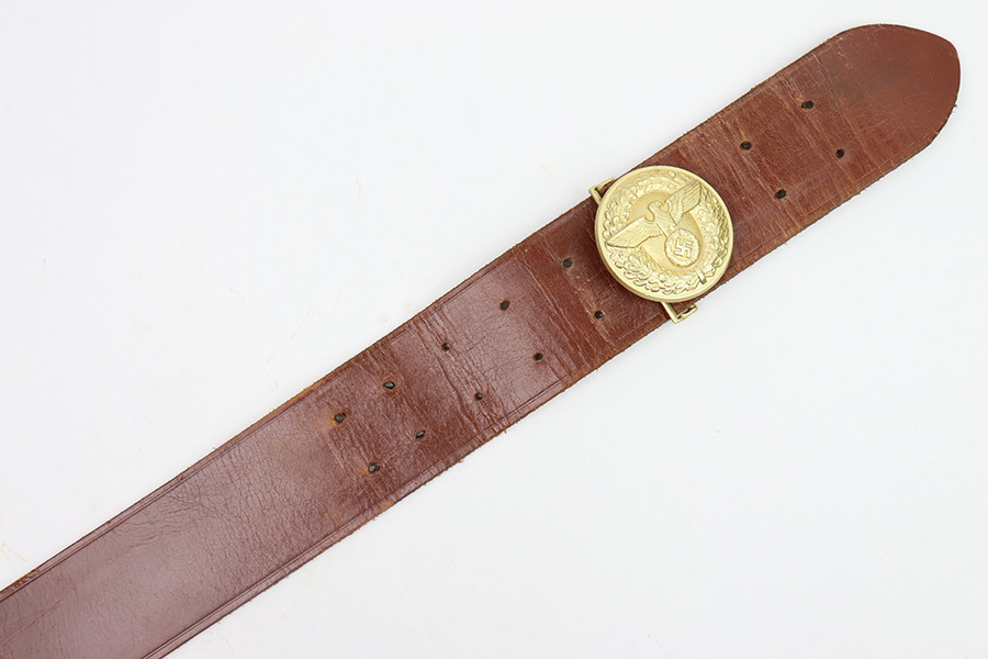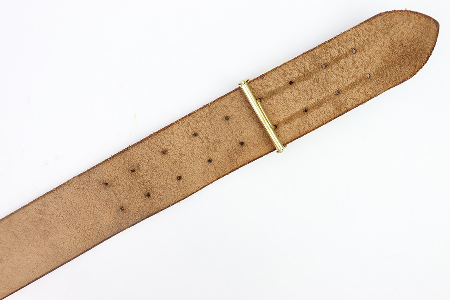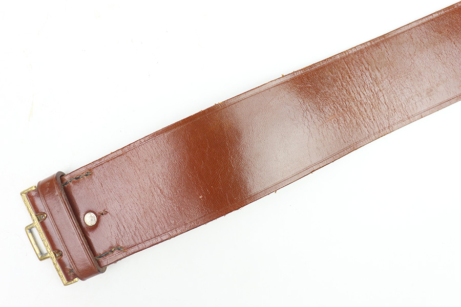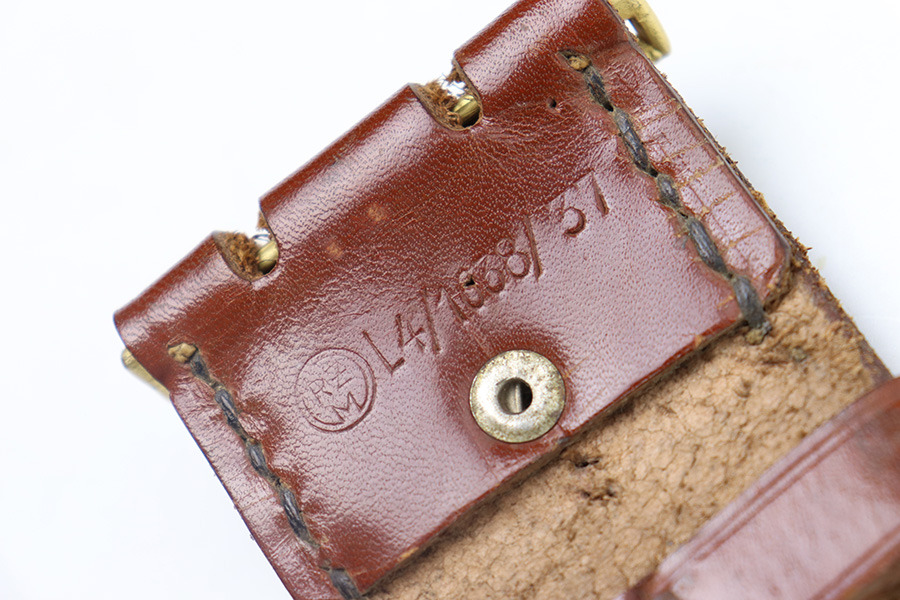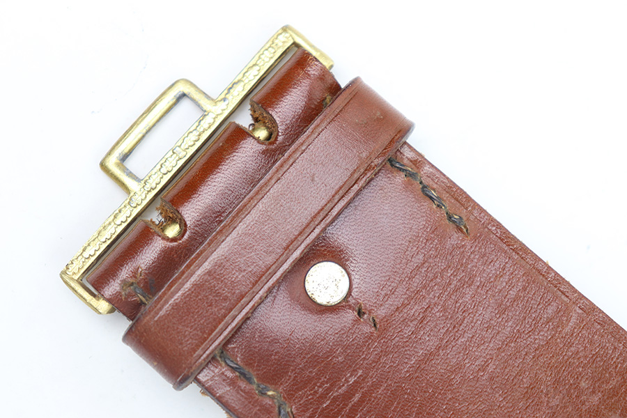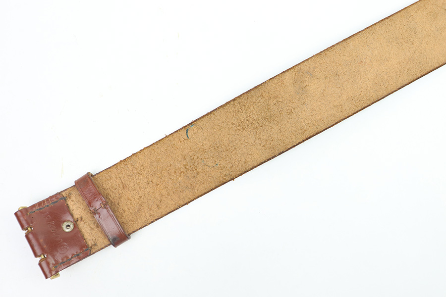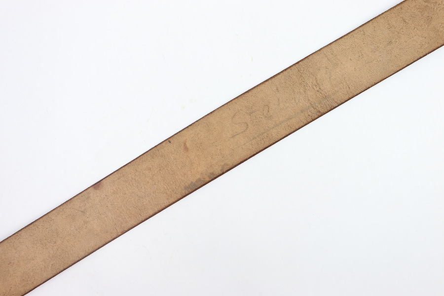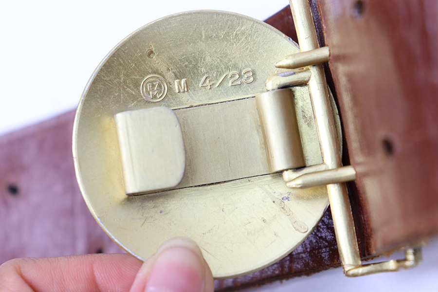 9/23/22 – This is an original RZM stamped Party Leader belt and buckle. The buckle is in excellent condition with very clean gold washed finish throughout. The exterior has very minimal edge wear and no notable flaws. The interior is RZM M4/23 maker stamped by Franke & Co. The leather belt fastening hook-end is also maker stamped “RZM M4/23” as shown. The leather belt has some mild surface wrinkling and light signs of previous use but no major issues or significant damage. The leather is clean with normal pliability. An excellent example.