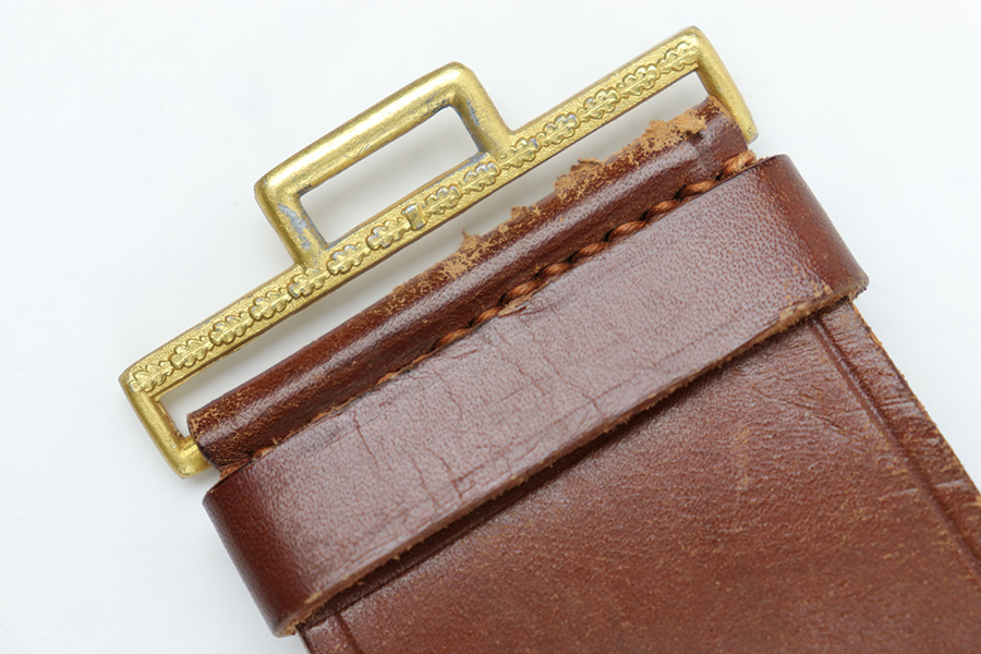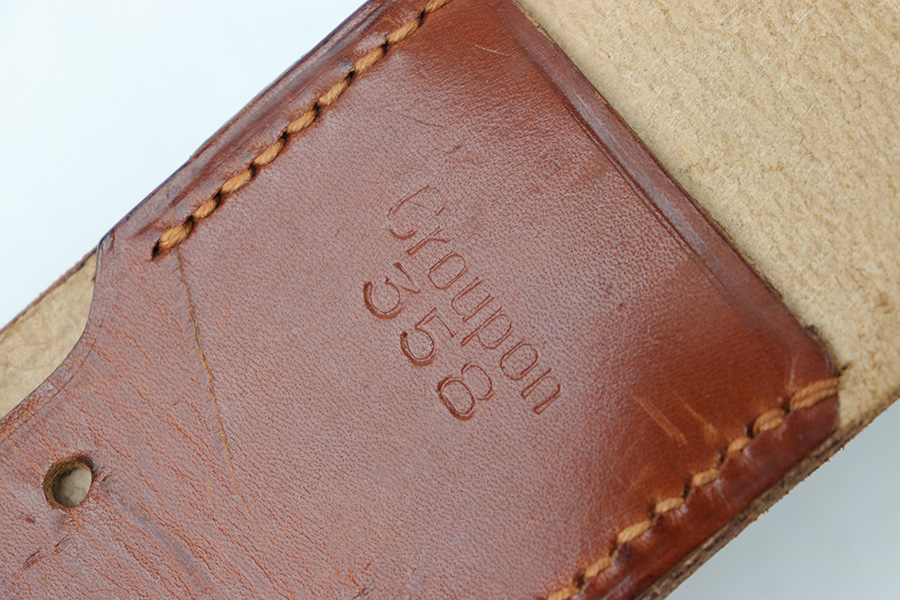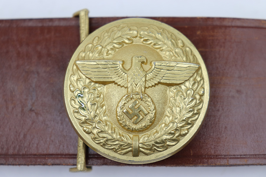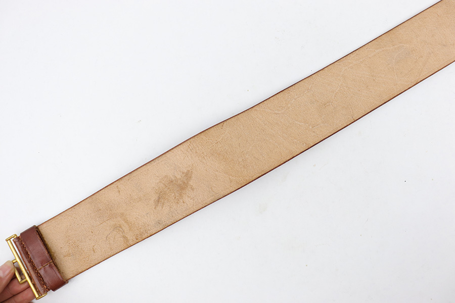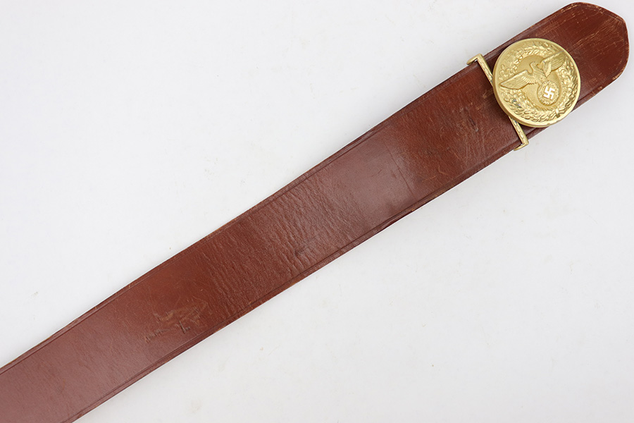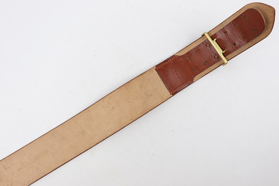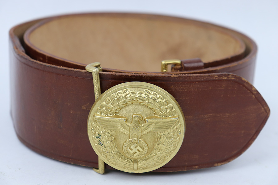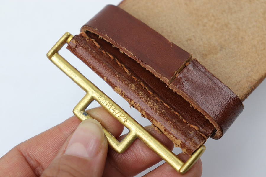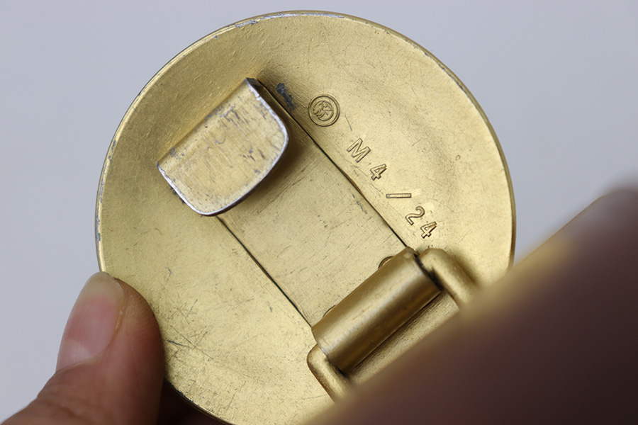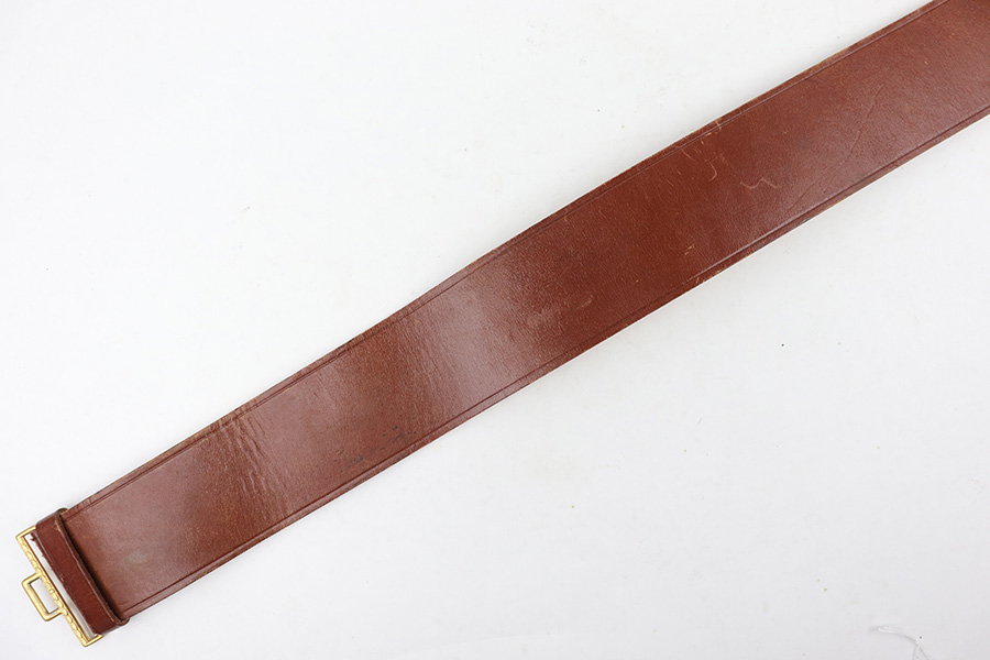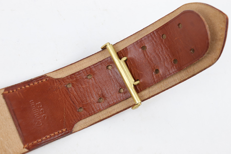 4/19/23 – This is an original Party Leader belt and buckle from WW2. The buckle is in great condition with an excellent gold gilded finish. There’s some very minor high edge patina and some spots of discoloration along the outer wreath. The interior of the buckle is RZM stamped with “M4/24” maker code for Friedrich Linden. This same marking is found on the metal hooked-end of the belt. The leather belt is excellent with clean interior and some mild wrinkling on the exterior. There’s also some normal aging / scuffing along the outer edges of the belt, but no major issues. The interior leather adjustment tab of the belt is stamped “Croupon 358”. An excellent example overall.