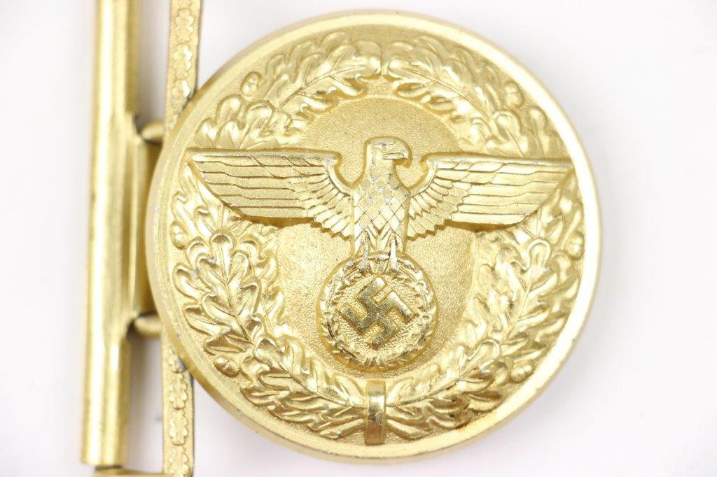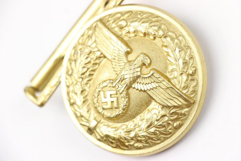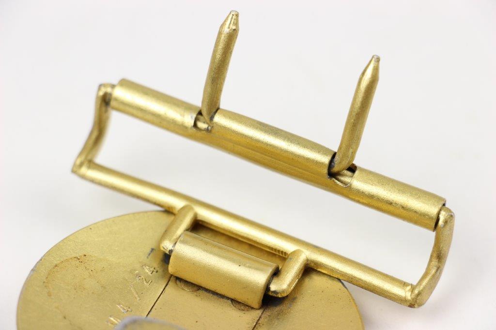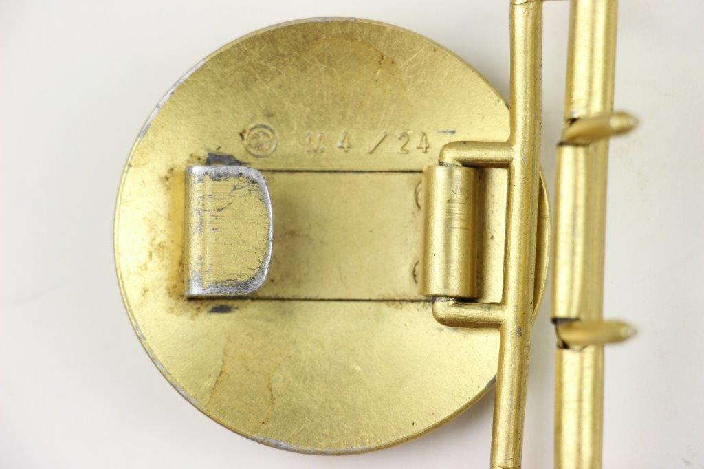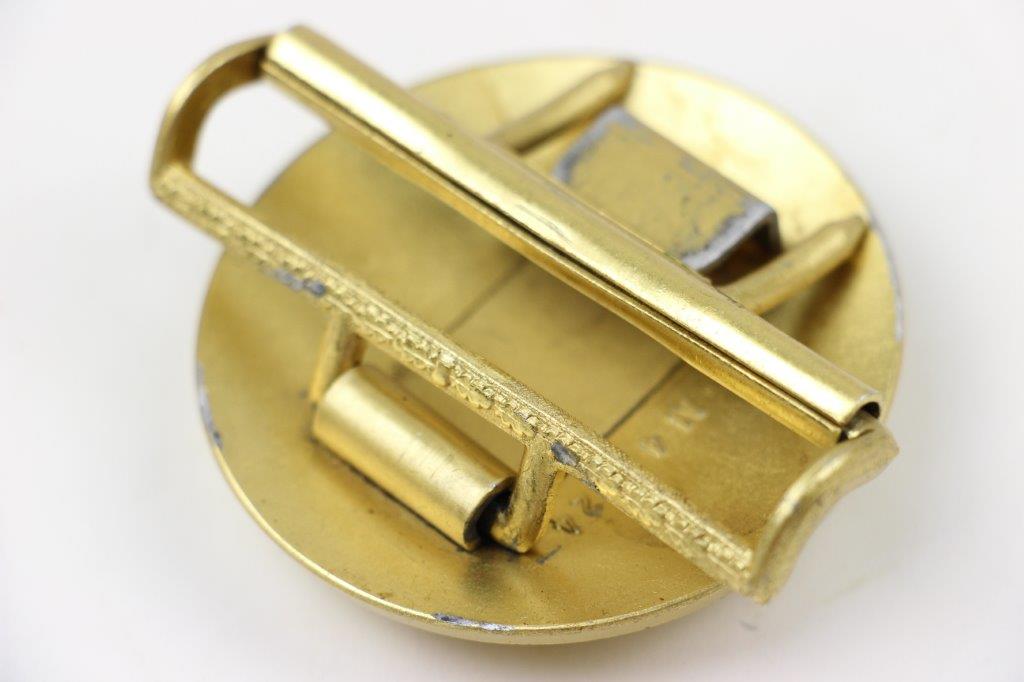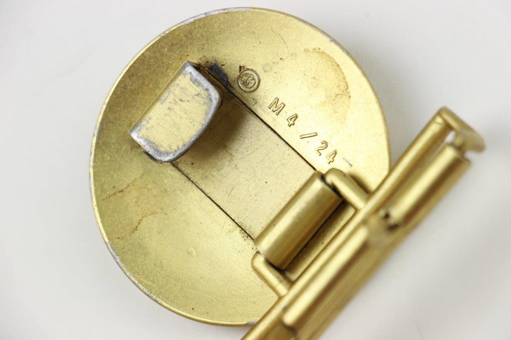 4/17/24 – This is an original WW2 German Party Leader Belt Buckle. The buckle is in near-excellent condition with beautiful gold gilded finish throughout. The front-facing side of the buckle has minimal high edge wear and the finish is clean throughout. Minty condition overall on the front. The reverse has some finish loss and mild discoloration. Maker stamped “RZM M4/24” for Friedrich Linden.