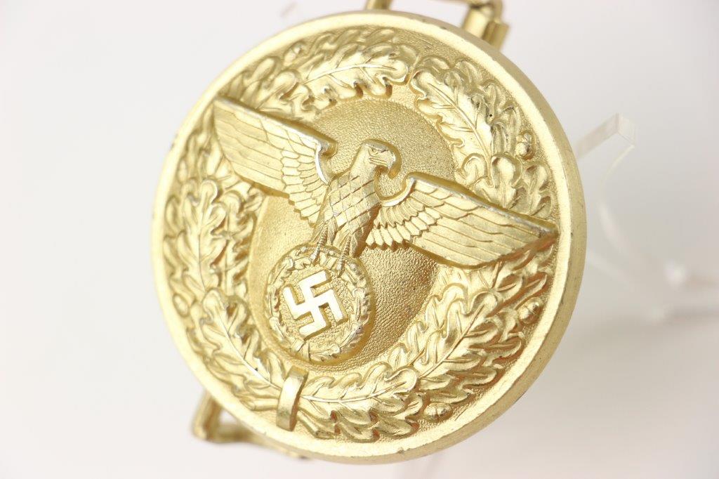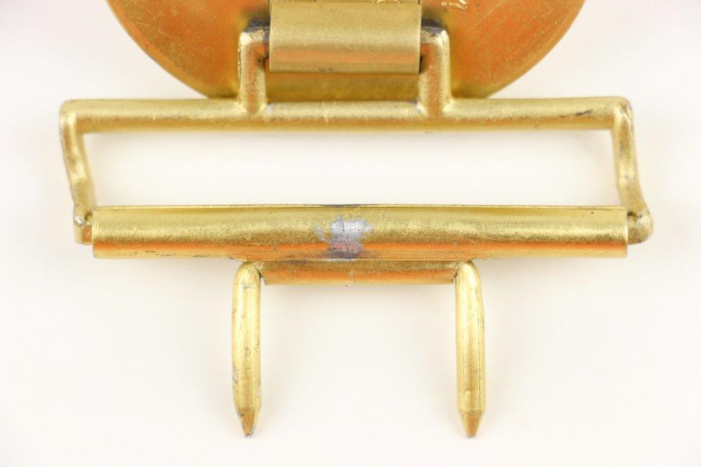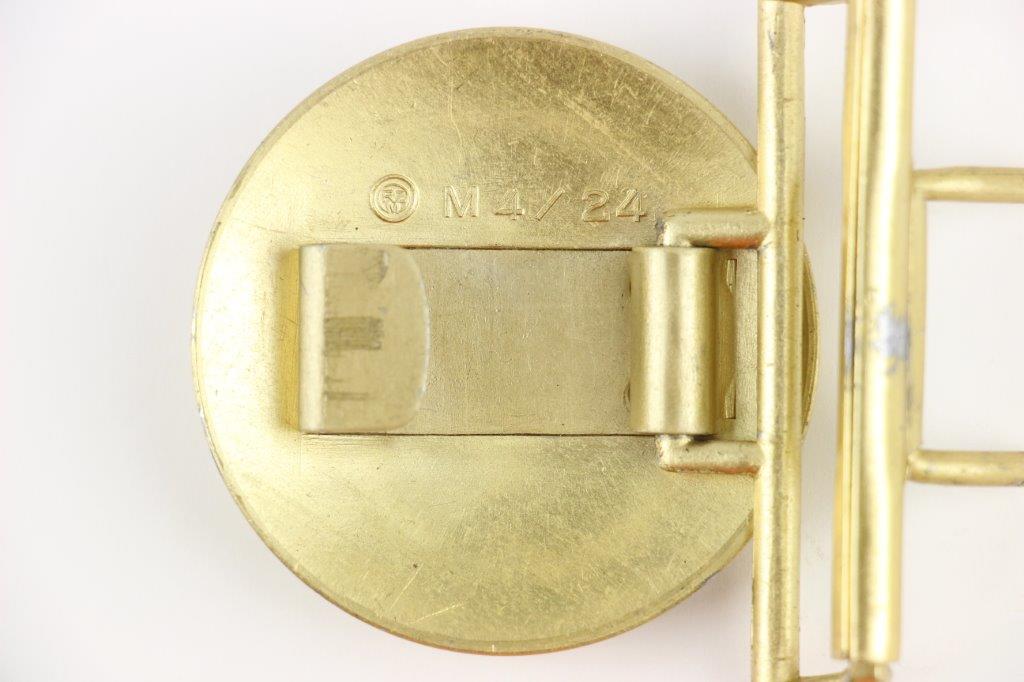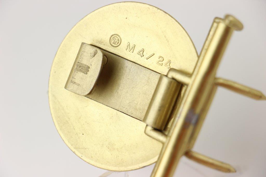 8/2/24 – This is an excellent condition example WW2 German Party Leader belt buckle. The buckle has beautiful gold gilded aluminum and excellent engraved detail throughout the front-facing side. The exterior rim of the buckle has a few very small imperfections, and there’s minimal high edge wear on the top of the eagle’s wings (this is very minimal, and shown accurately in photos). The reverse is stamped, “RZM M4/24” for Friedrich Linden. Minimal rub / use wear found on the hinge.