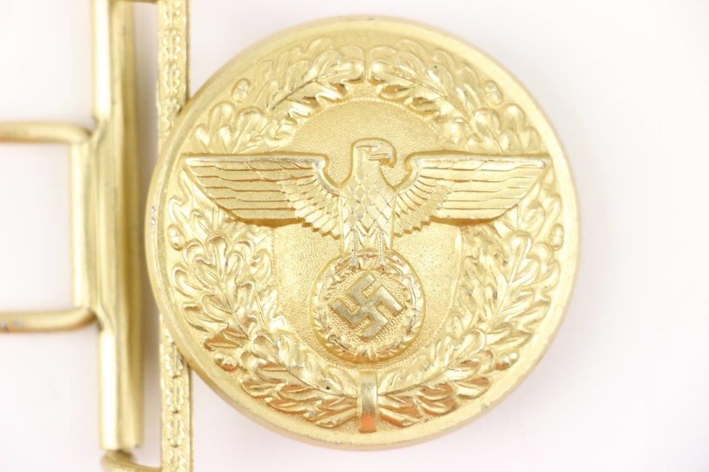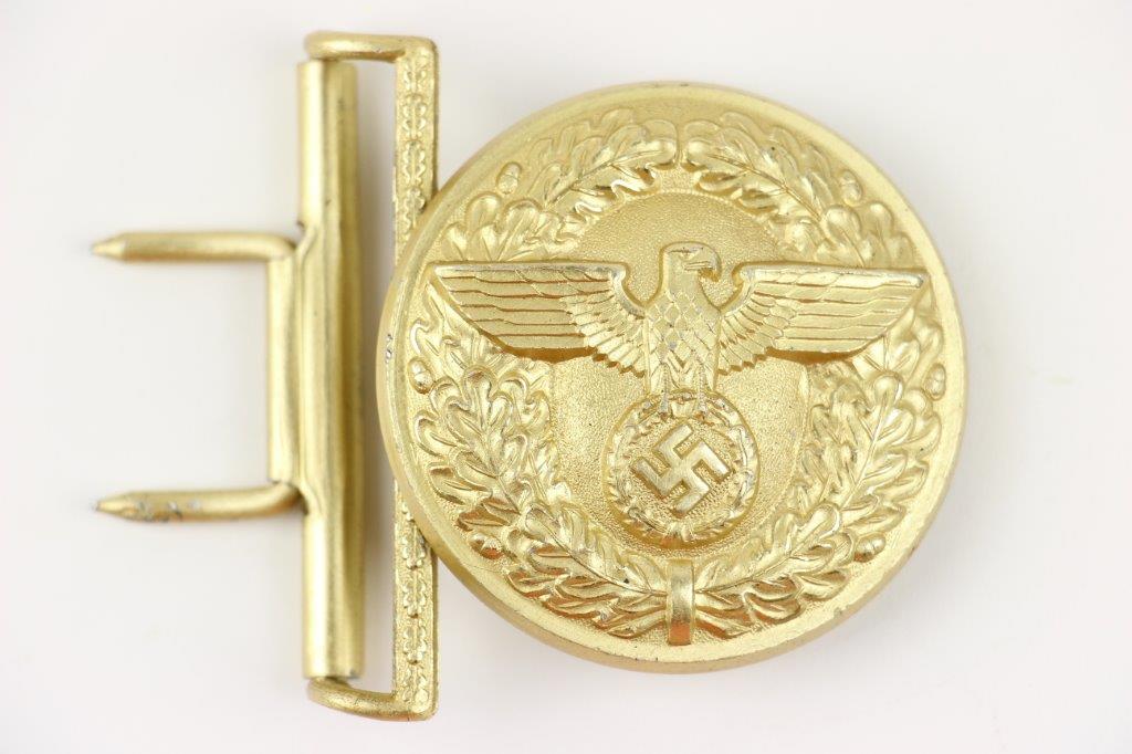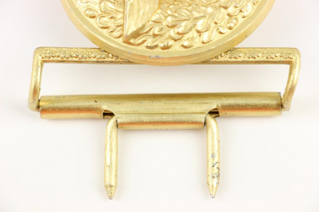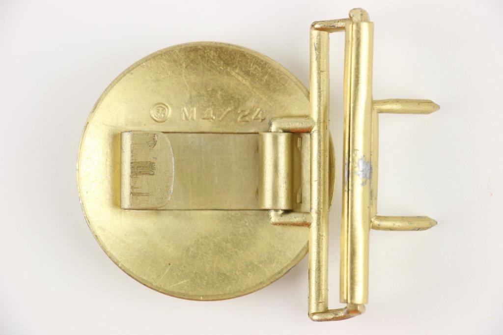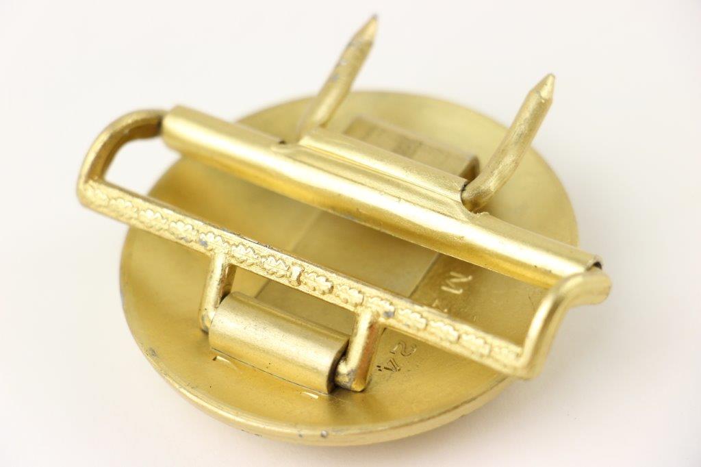 8/2/24 – This is an excellent condition example WW2 German Party Leader belt buckle. The buckle has beautiful gold gilded aluminum and excellent engraved detail throughout the front-facing side. The exterior rim of the buckle has a few very small imperfections, and there’s minimal high edge wear on the top of the eagle’s wings (this is very minimal, and shown accurately in photos). The reverse is stamped, “RZM M4/24” for Friedrich Linden. Minimal rub / use wear found on the hinge.