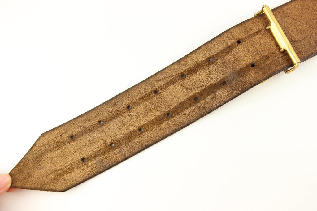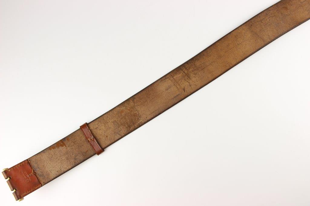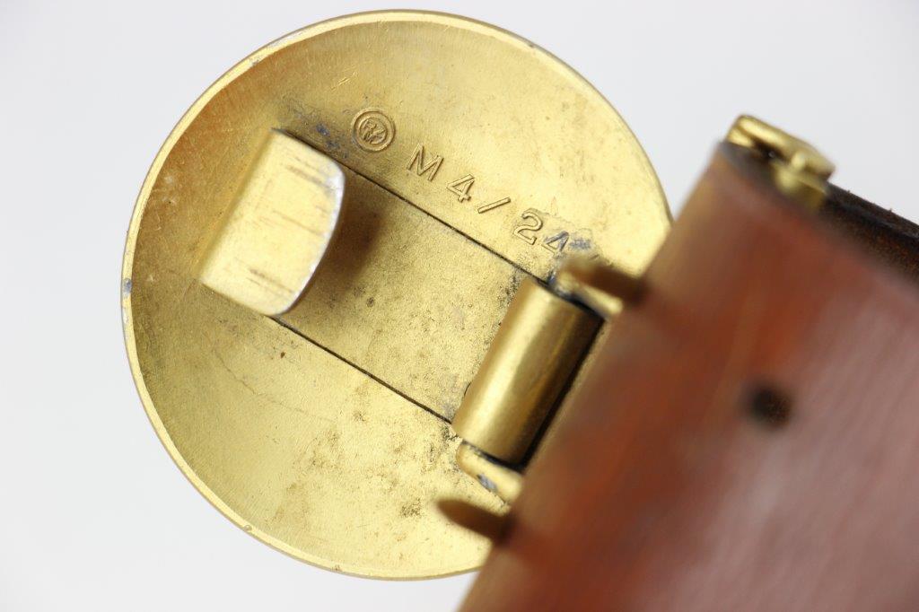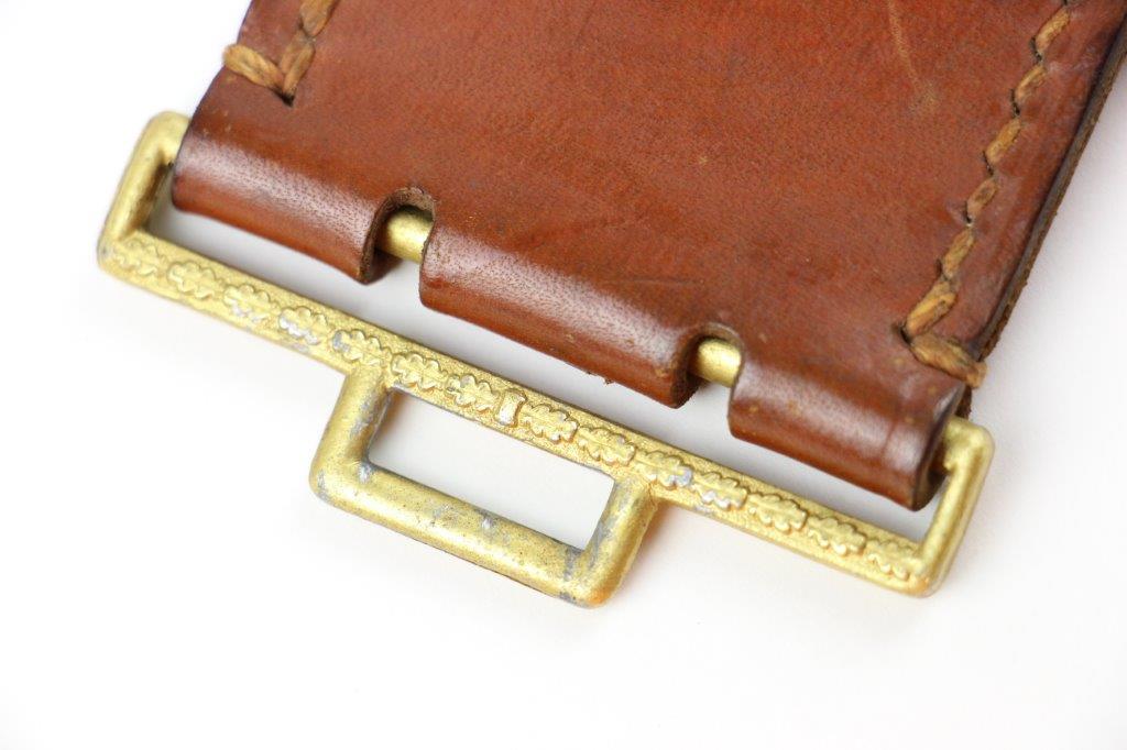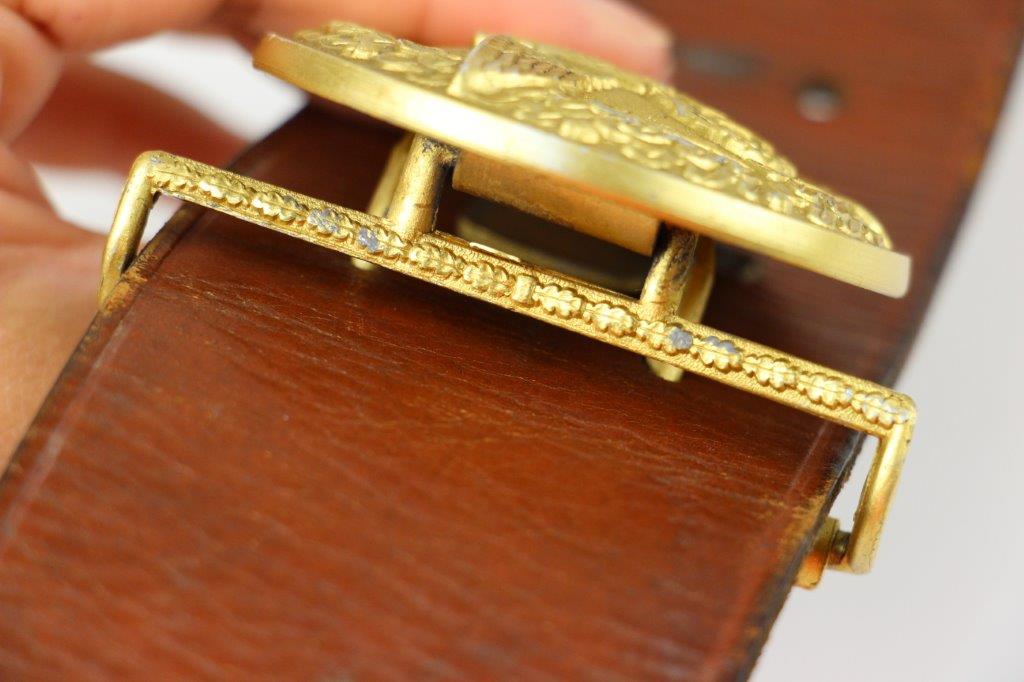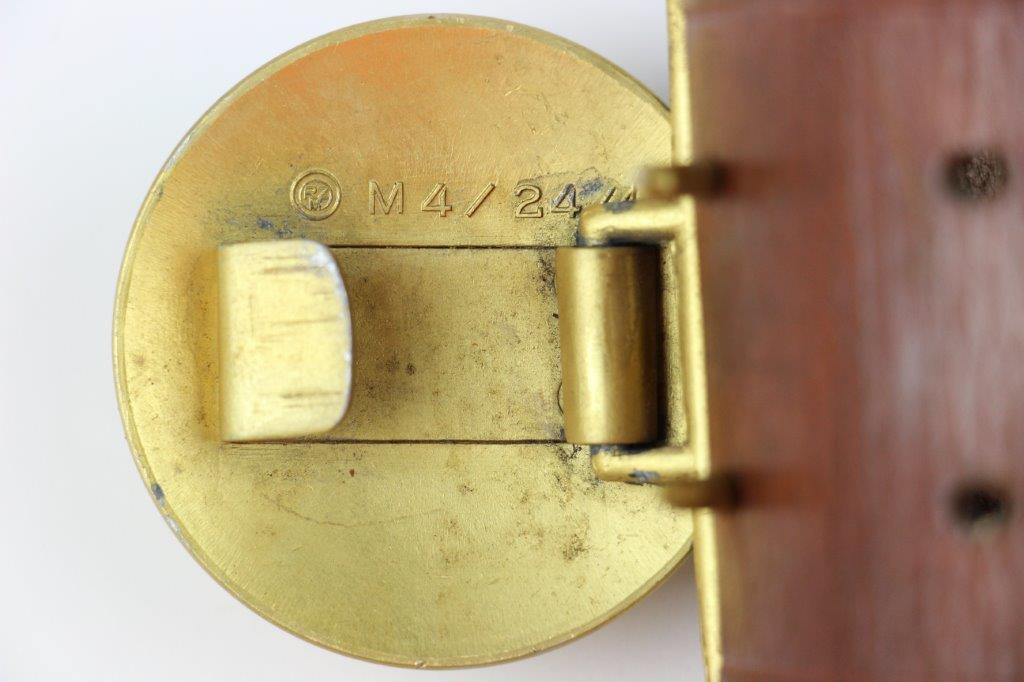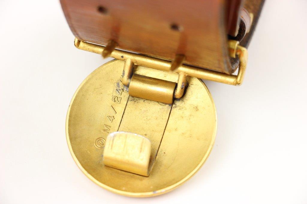 8/20/24 – This is a rare WW2 German Party Leader Uniform belt and buckle. The buckle is gold gilded aluminum with excellent detail and minimal high edge wear and light rub wear from age and use. The interior of the buckle is maker stamped, “RZM M4/24/4” by Friedrich Linden and retains almost all of the original finish. Some mild tarnishing along the hook and attached belt hanger / clip. The leather belt is in excellent condition; clean and strong with minimal wrinkling and a few mild surface stains on the exterior. A few scuffs and mild surface age on the interior. The original leather adjustment loop is still intact as well. The hooked closure end of the belt is maker stamped on the interior, “RZM Kernstuck L2/6/3”. Mild surface wear on the aluminum engraved tab end. A very nice example overall.