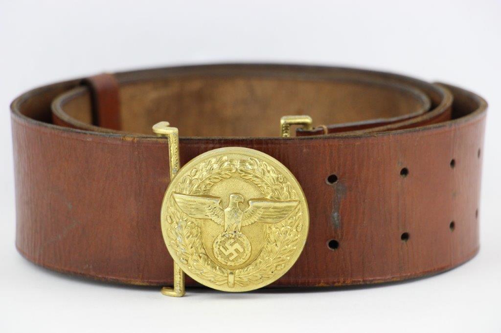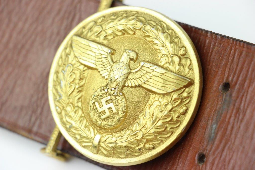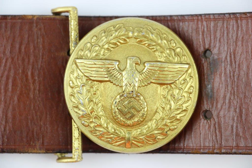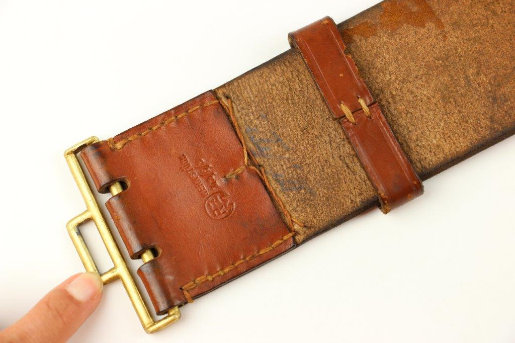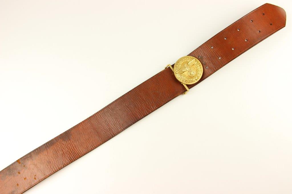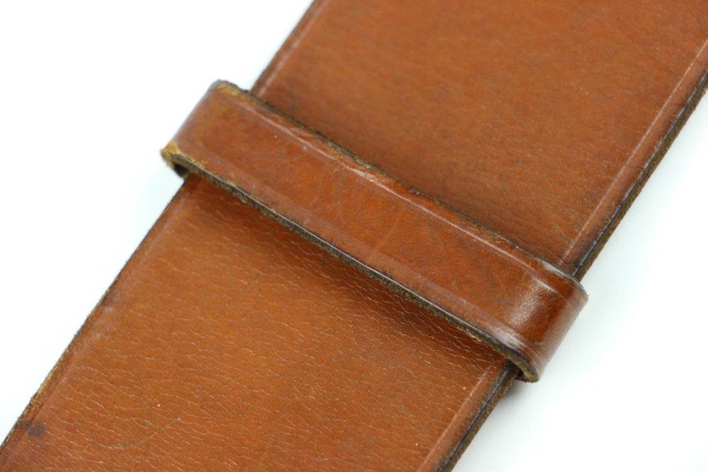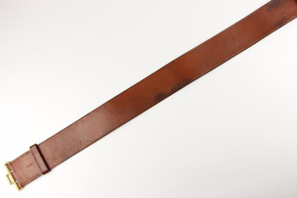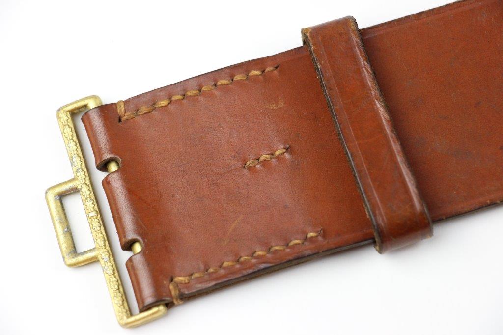 8/20/24 – This is a rare WW2 German Party Leader Uniform belt and buckle. The buckle is gold gilded aluminum with excellent detail and minimal high edge wear and light rub wear from age and use. The interior of the buckle is maker stamped, “RZM M4/24/4” by Friedrich Linden and retains almost all of the original finish. Some mild tarnishing along the hook and attached belt hanger / clip. The leather belt is in excellent condition; clean and strong with minimal wrinkling and a few mild surface stains on the exterior. A few scuffs and mild surface age on the interior. The original leather adjustment loop is still intact as well. The hooked closure end of the belt is maker stamped on the interior, “RZM Kernstuck L2/6/3”. Mild surface wear on the aluminum engraved tab end. A very nice example overall.