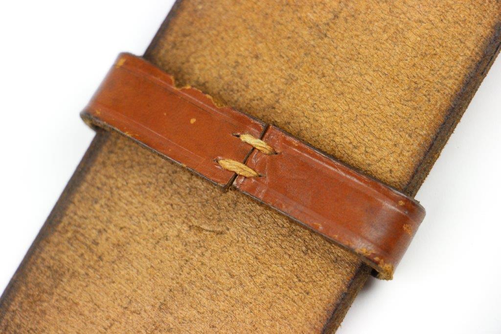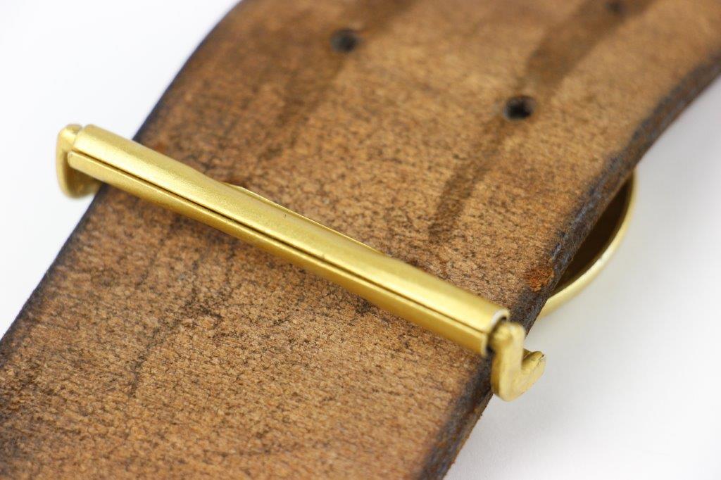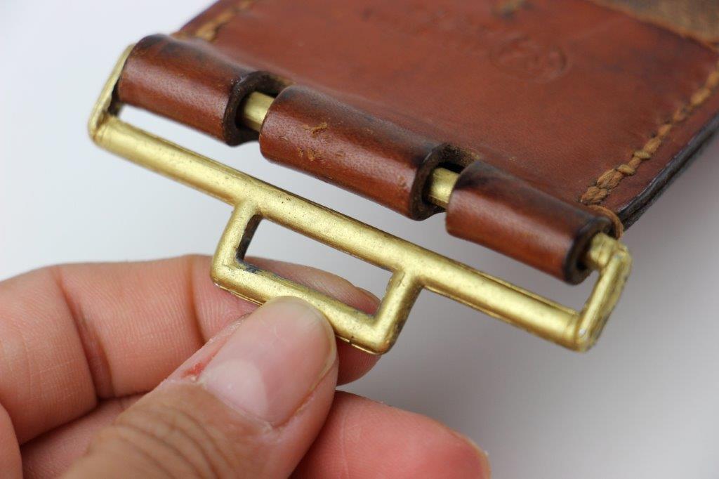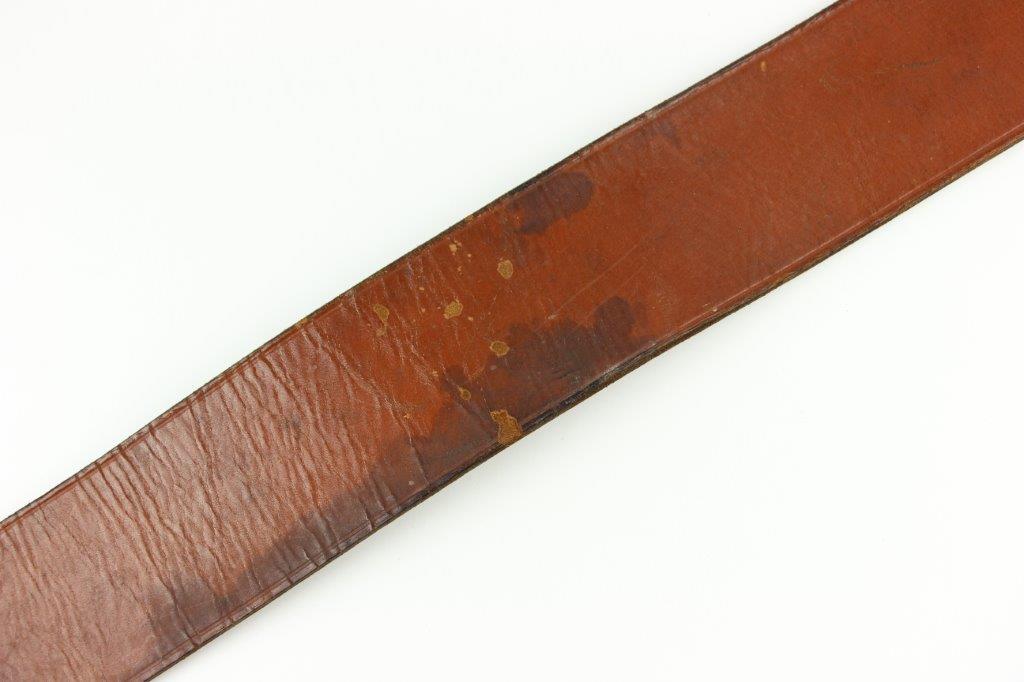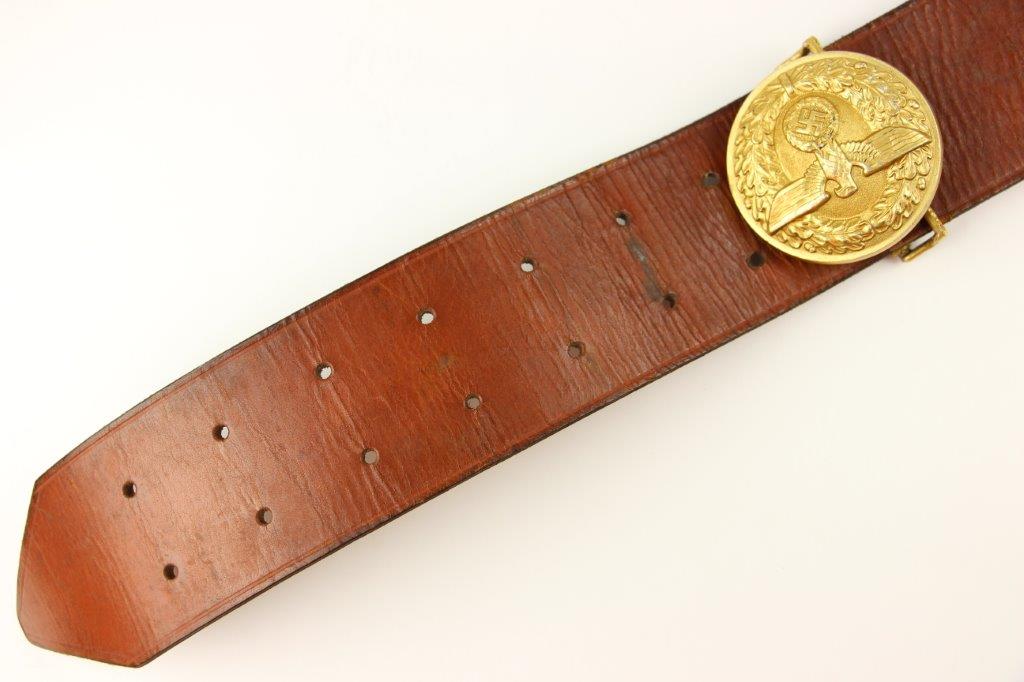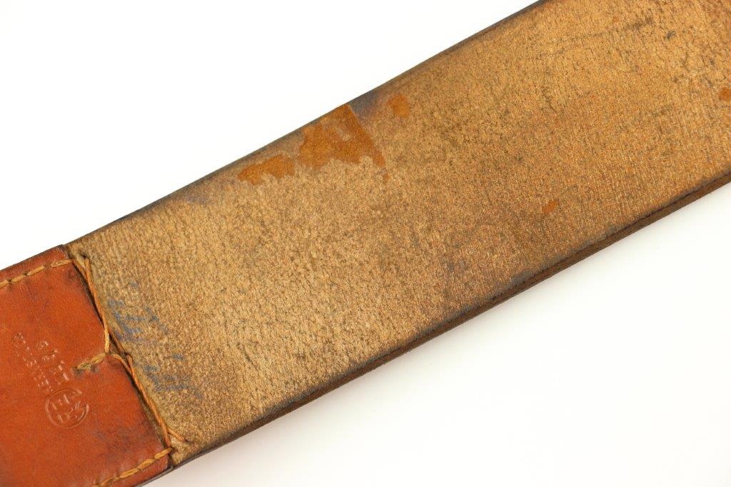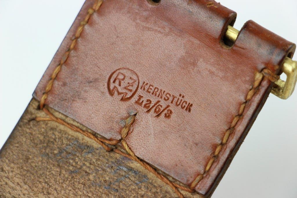 8/20/24 – This is a rare WW2 German Party Leader Uniform belt and buckle. The buckle is gold gilded aluminum with excellent detail and minimal high edge wear and light rub wear from age and use. The interior of the buckle is maker stamped, “RZM M4/24/4” by Friedrich Linden and retains almost all of the original finish. Some mild tarnishing along the hook and attached belt hanger / clip. The leather belt is in excellent condition; clean and strong with minimal wrinkling and a few mild surface stains on the exterior. A few scuffs and mild surface age on the interior. The original leather adjustment loop is still intact as well. The hooked closure end of the belt is maker stamped on the interior, “RZM Kernstuck L2/6/3”. Mild surface wear on the aluminum engraved tab end. A very nice example overall.