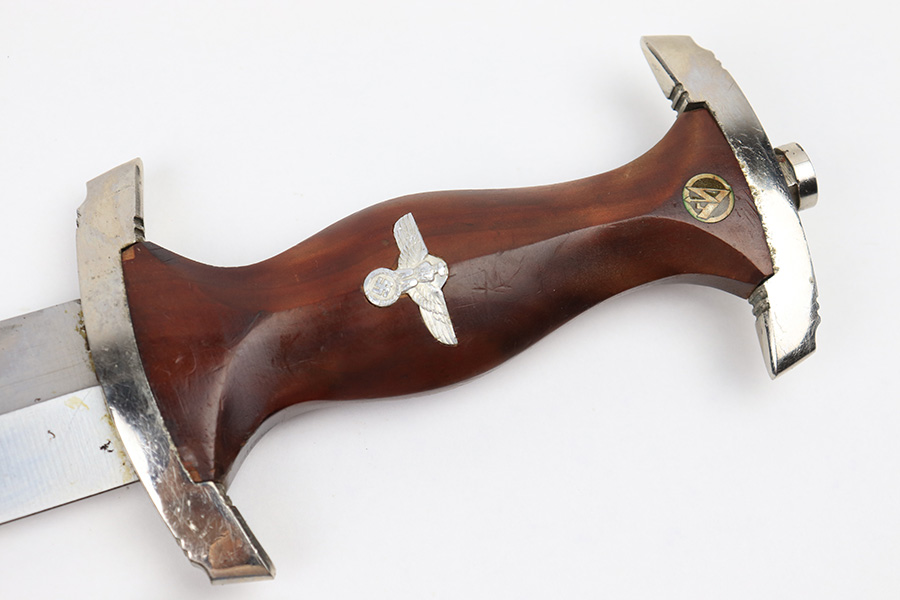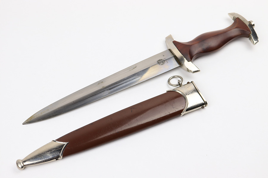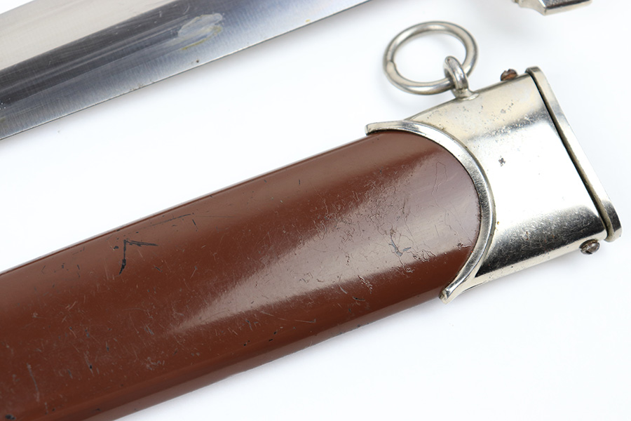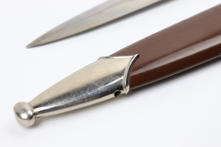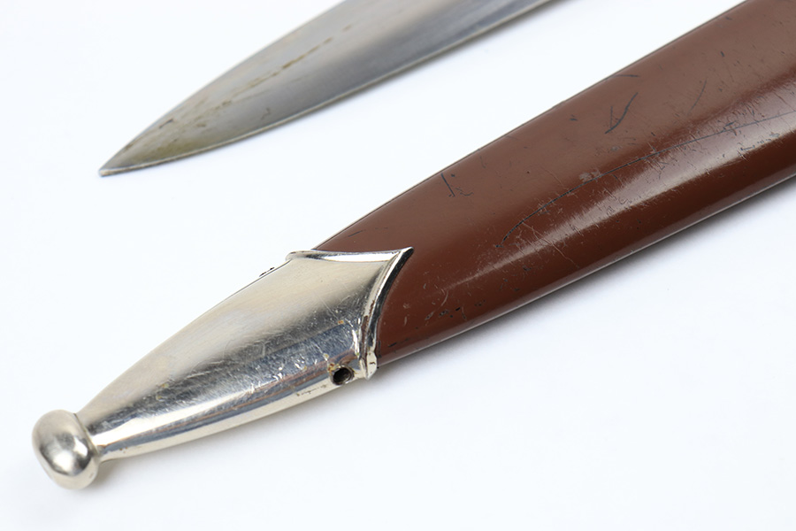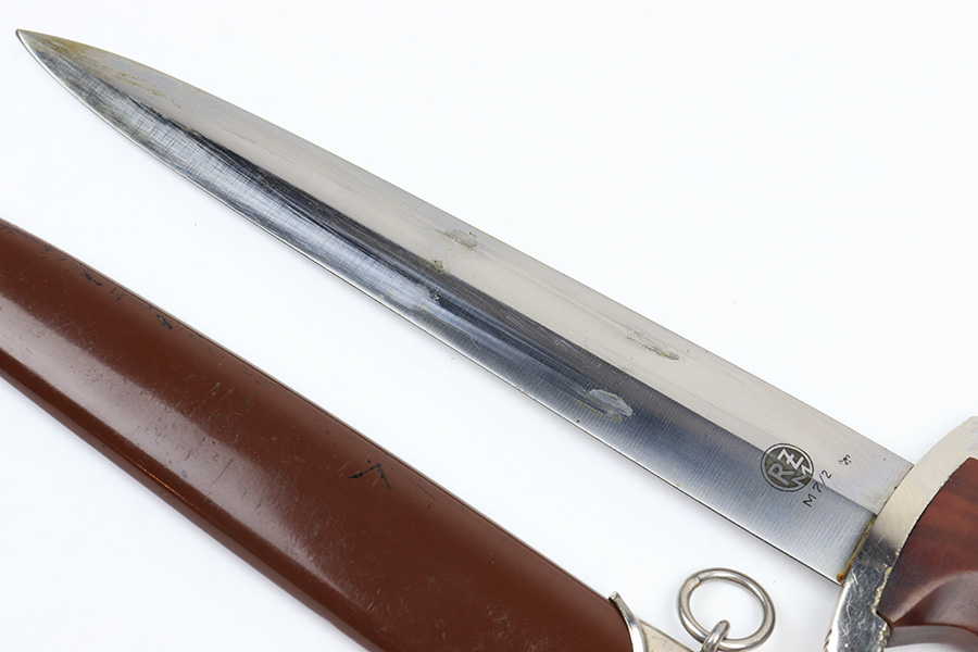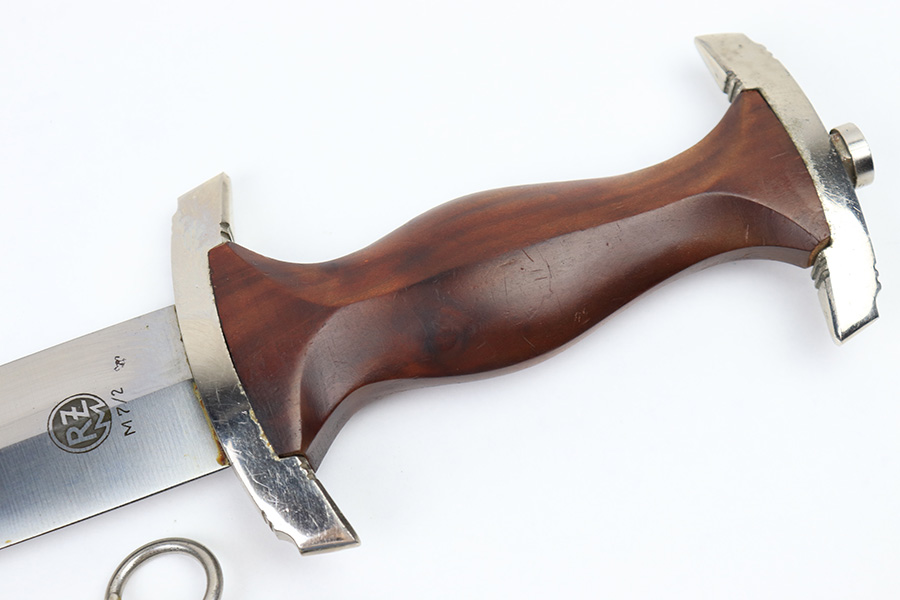 7/1/22 – This is an original RZM stamped SA Dagger. The dagger features an excellent blade with visible cross-graining on both sides. No signs of sharpening along the edges. There are a few small spots of oil discoloration and mild oxidation, mostly near the tip. There’s also some typical scabbard wear and mild surface scratches, but no excessive damage. RZM maker code stamped by Emil Voos. The wood handle is in great condition despite having a few very small chips in the wood near the hand guard / base of the grip. the hand guard and pommel have mild surface patina but no rust or pitting. The scabbard is in great shape but is missing the two screws near the tip.