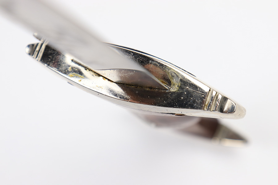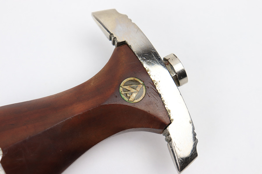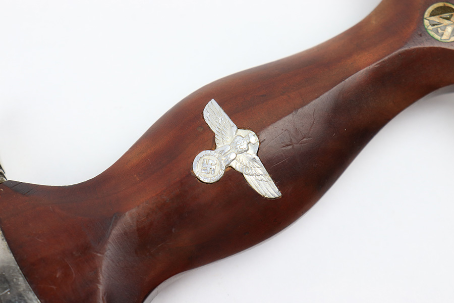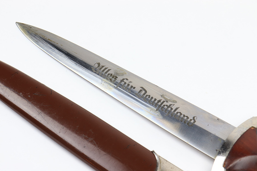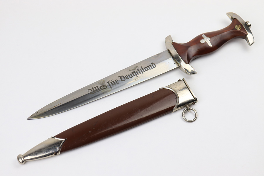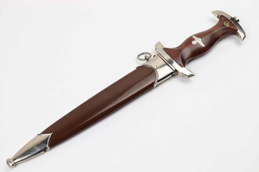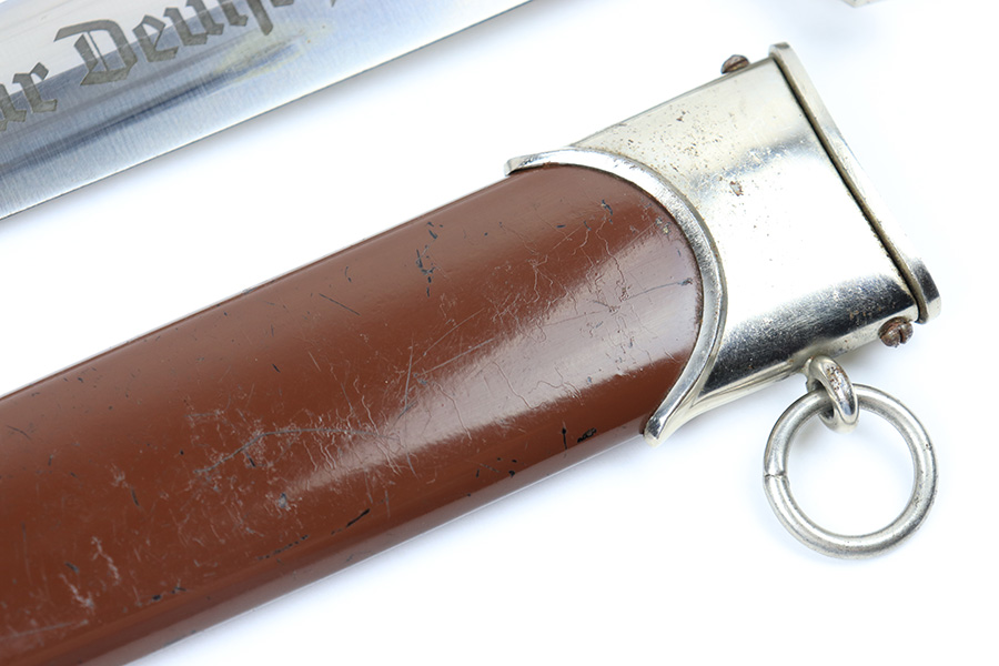 7/1/22 – This is an original RZM stamped SA Dagger. The dagger features an excellent blade with visible cross-graining on both sides. No signs of sharpening along the edges. There are a few small spots of oil discoloration and mild oxidation, mostly near the tip. There’s also some typical scabbard wear and mild surface scratches, but no excessive damage. RZM maker code stamped by Emil Voos. The wood handle is in great condition despite having a few very small chips in the wood near the hand guard / base of the grip. the hand guard and pommel have mild surface patina but no rust or pitting. The scabbard is in great shape but is missing the two screws near the tip.