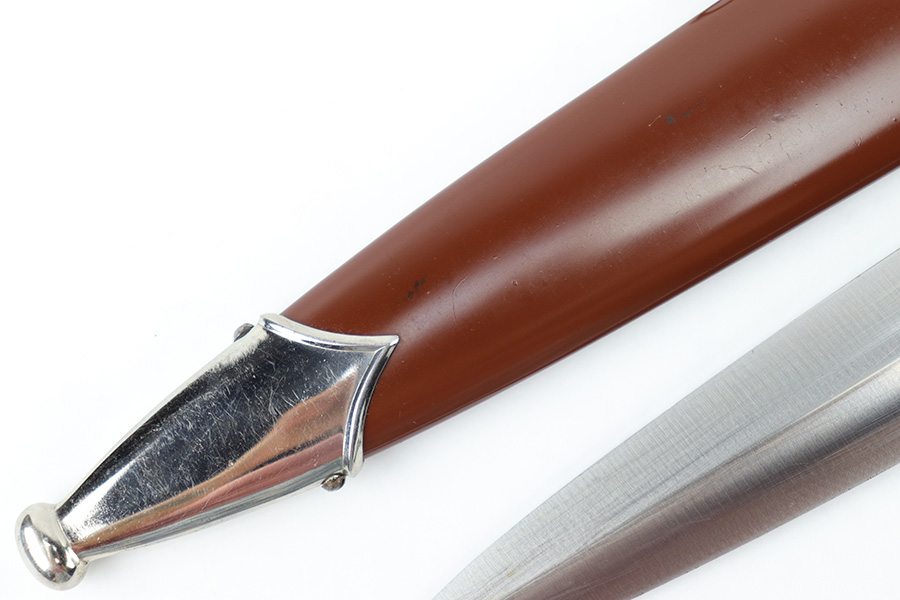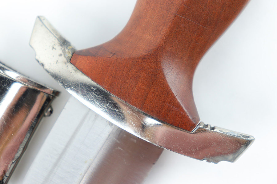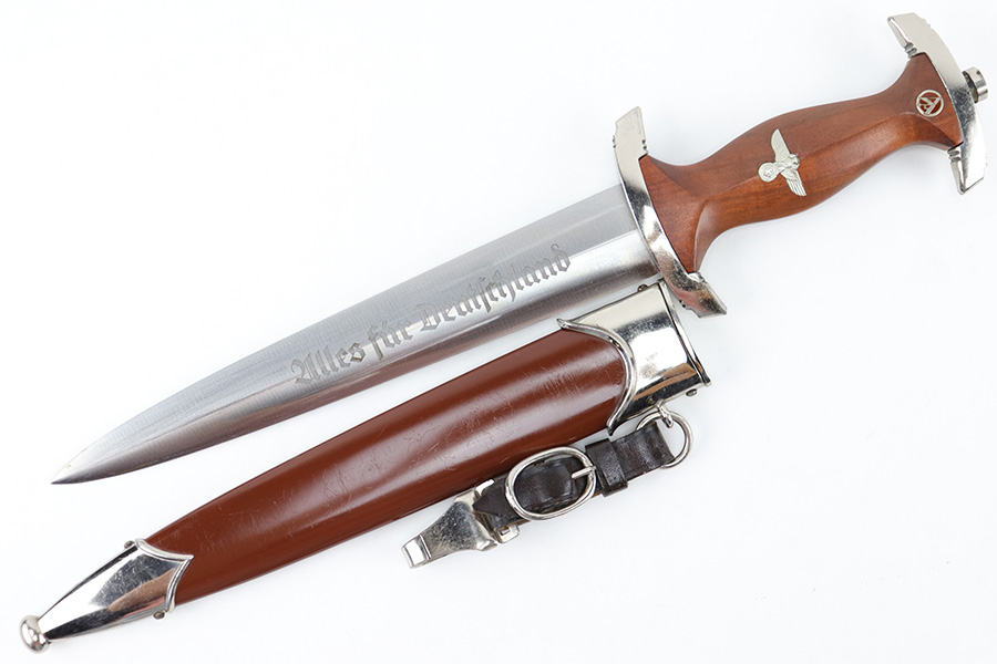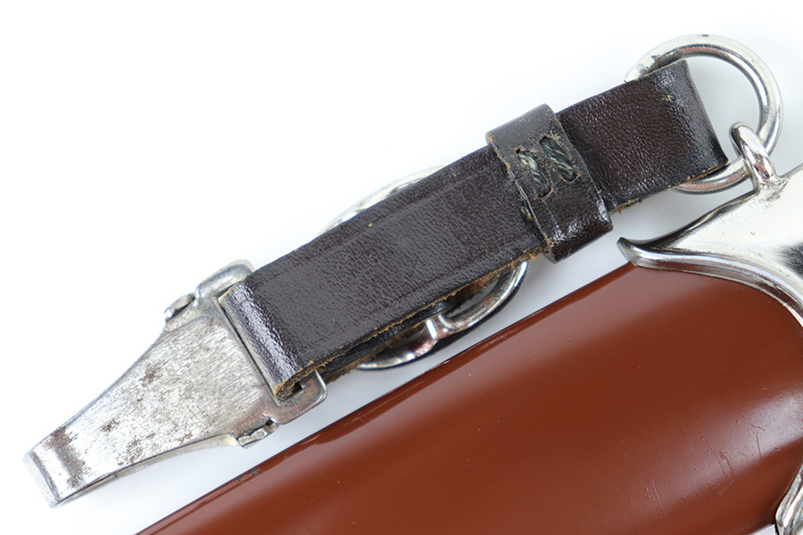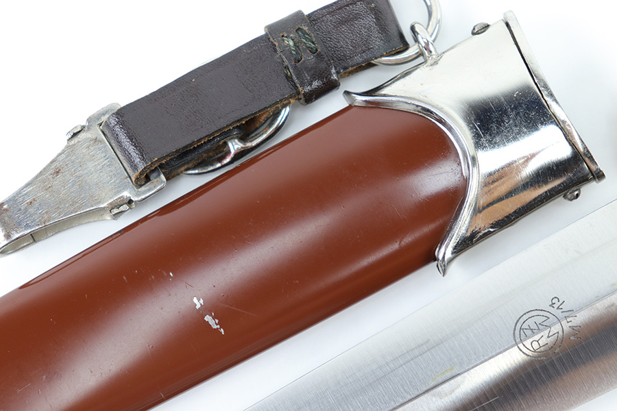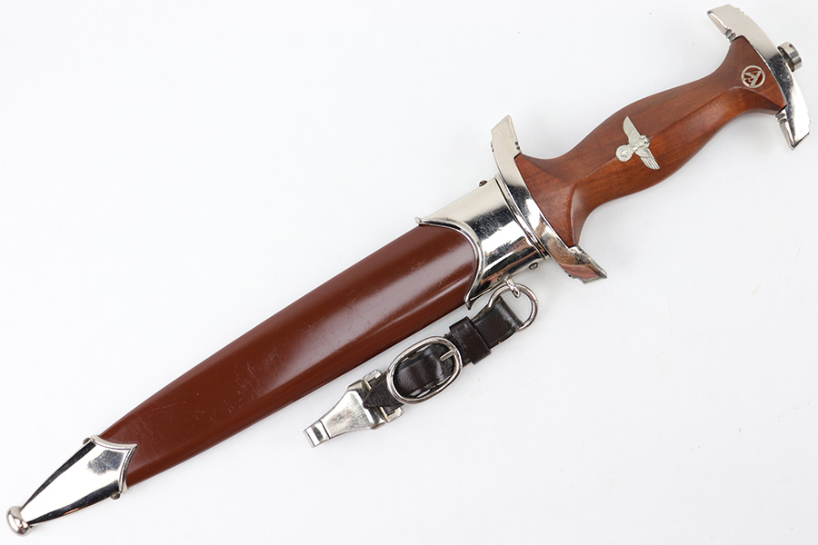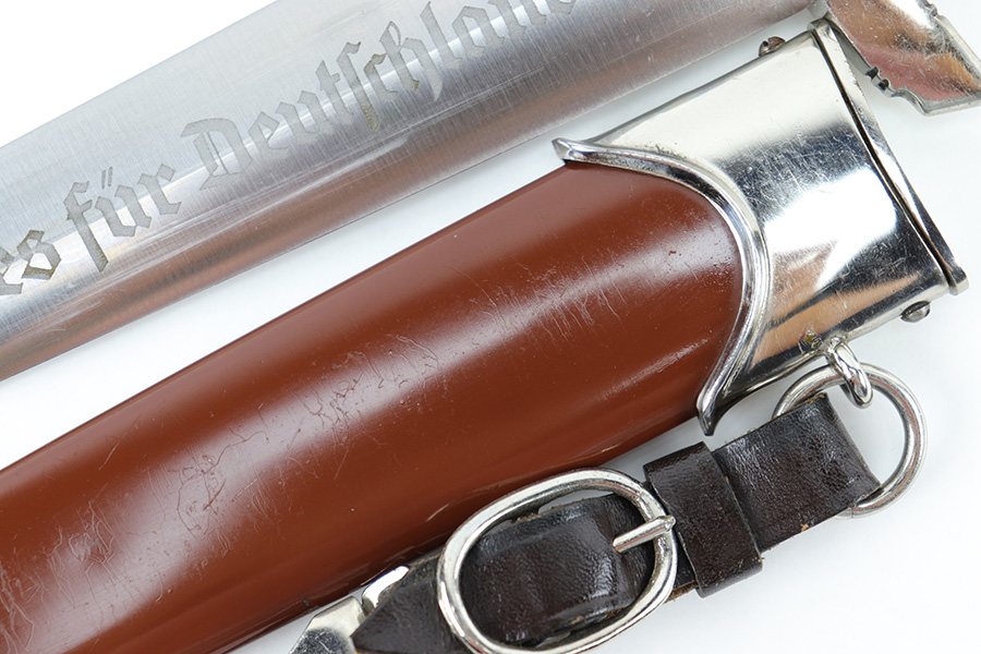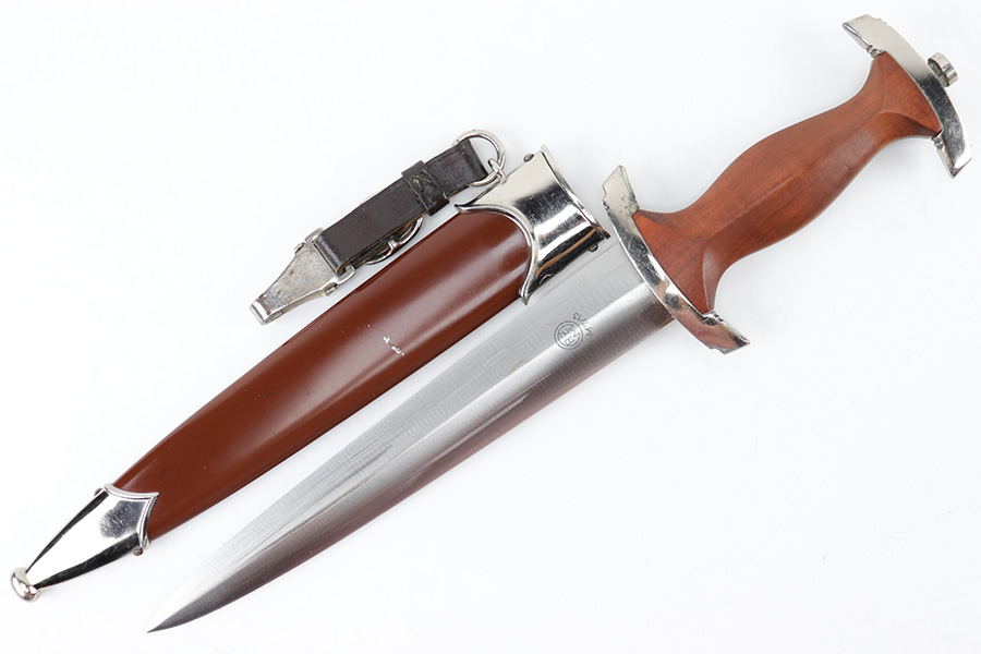 6/29/23 – This is an excellent condition, original wartime production SA Dagger, complete with an original scabbard and leather belt hanger. The dagger blade is RZM maker stamped with code M7/13 for Arthur Schuttelhofer. The blade is crisp and clean with the only wear being light scabbard rub wear. Visible cross graining throughout. The cross guards are nickel plated and show some light patina, surface scratches, and mild flaking near the edges. The wood handle has no cracks or chips but there are a few light blemishes in the wood. The scabbard is brown painted and excellent condition overall. The hanger is unmarked and has some mild patina on the clip, but the leather is excellent. A high-end example.