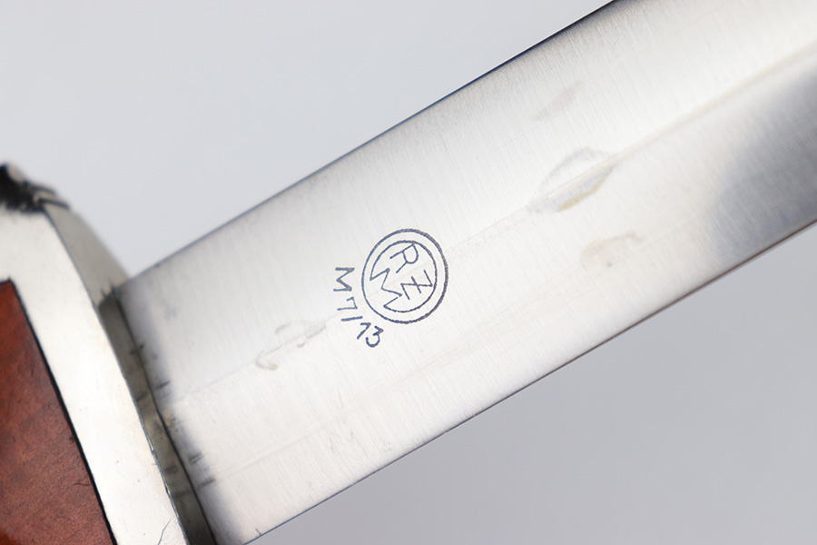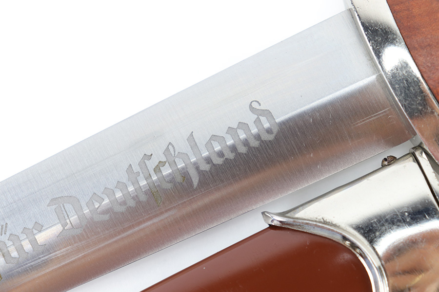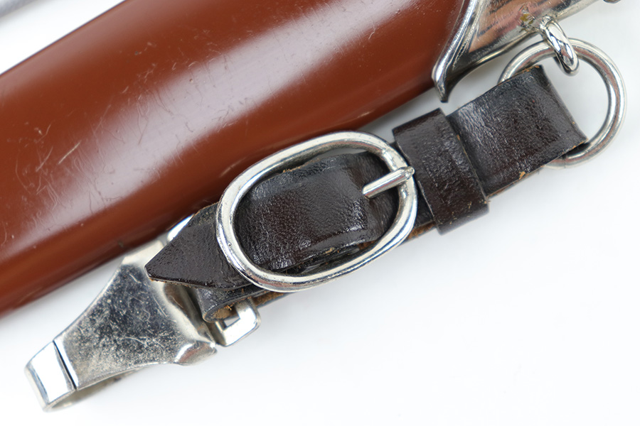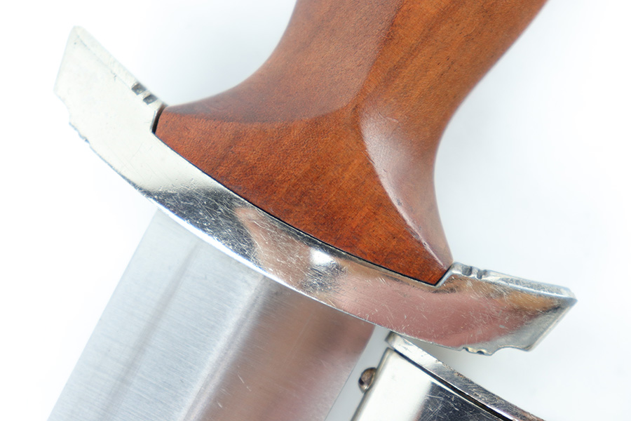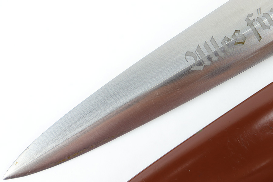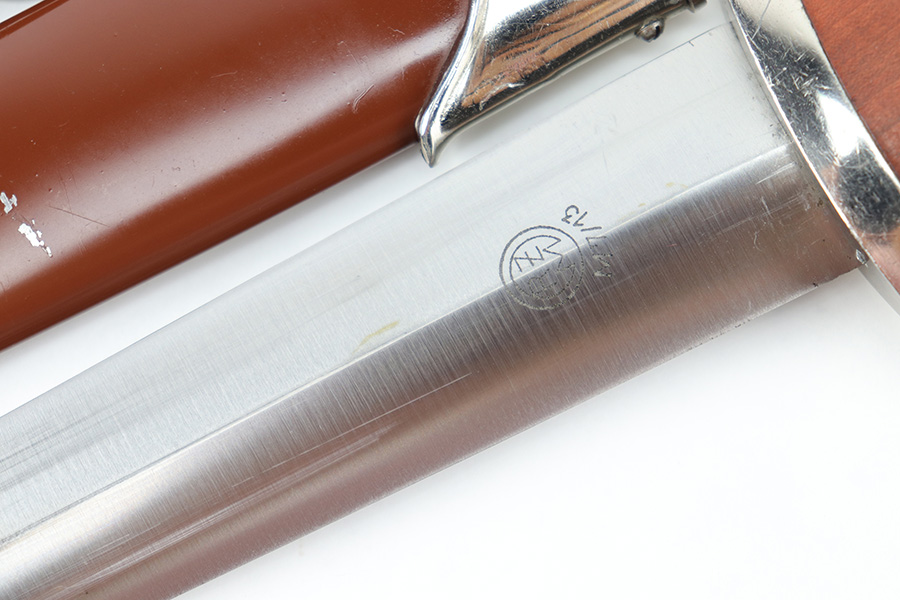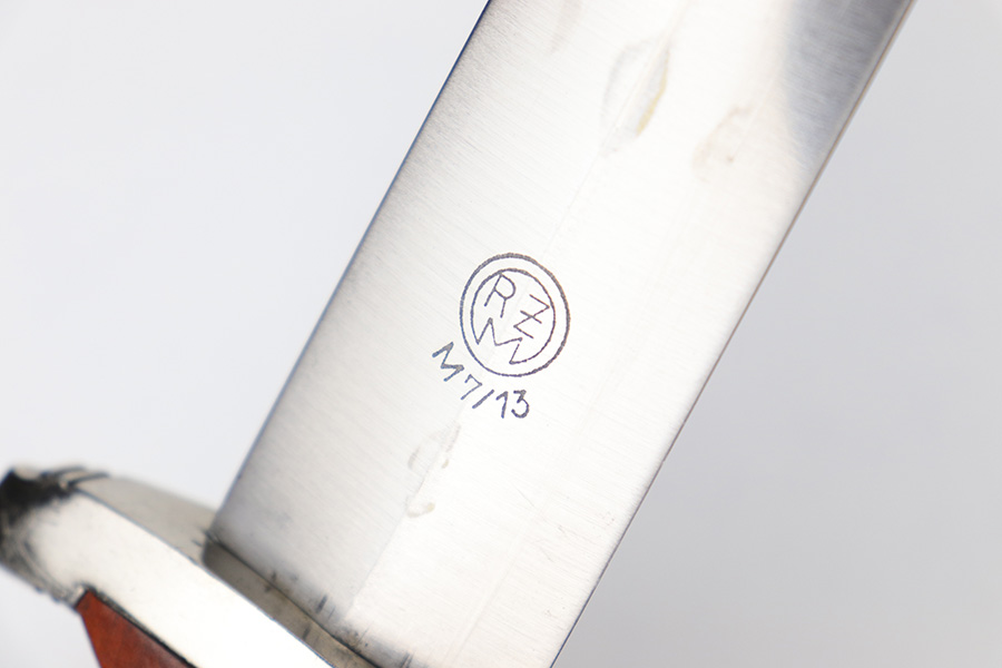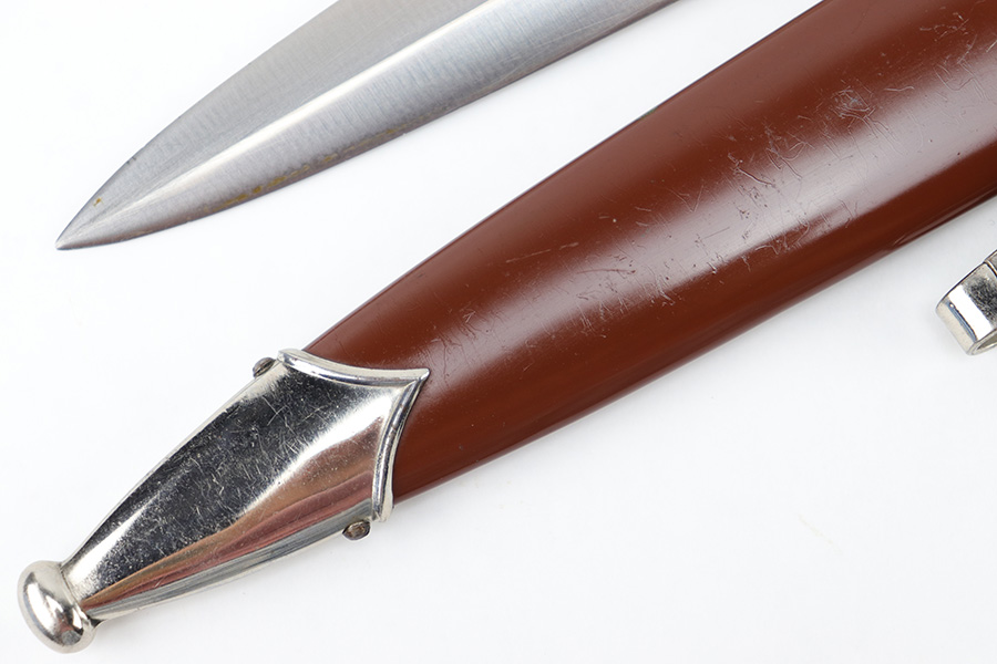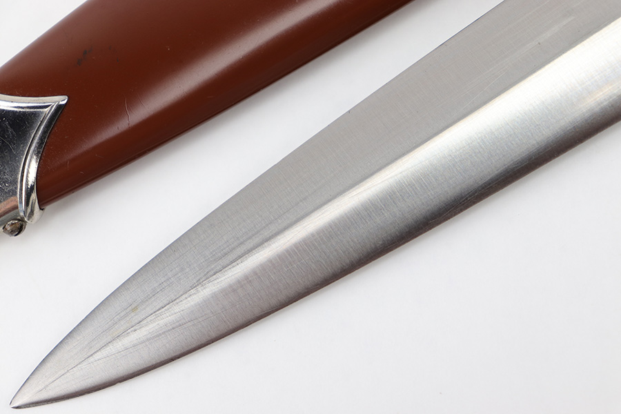 6/29/23 – This is an excellent condition, original wartime production SA Dagger, complete with an original scabbard and leather belt hanger. The dagger blade is RZM maker stamped with code M7/13 for Arthur Schuttelhofer. The blade is crisp and clean with the only wear being light scabbard rub wear. Visible cross graining throughout. The cross guards are nickel plated and show some light patina, surface scratches, and mild flaking near the edges. The wood handle has no cracks or chips but there are a few light blemishes in the wood. The scabbard is brown painted and excellent condition overall. The hanger is unmarked and has some mild patina on the clip, but the leather is excellent. A high-end example.