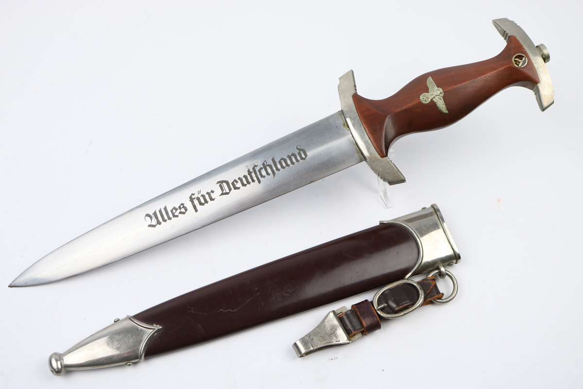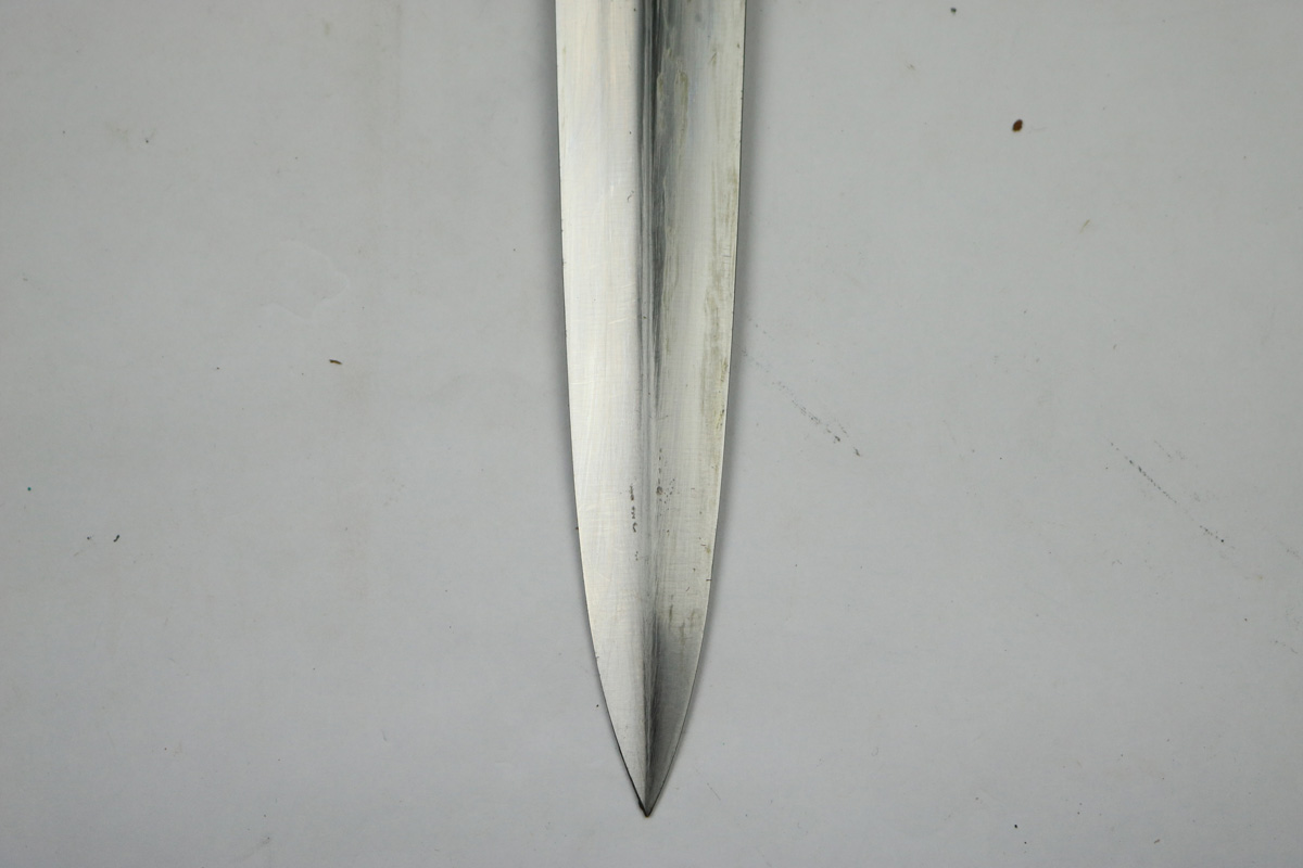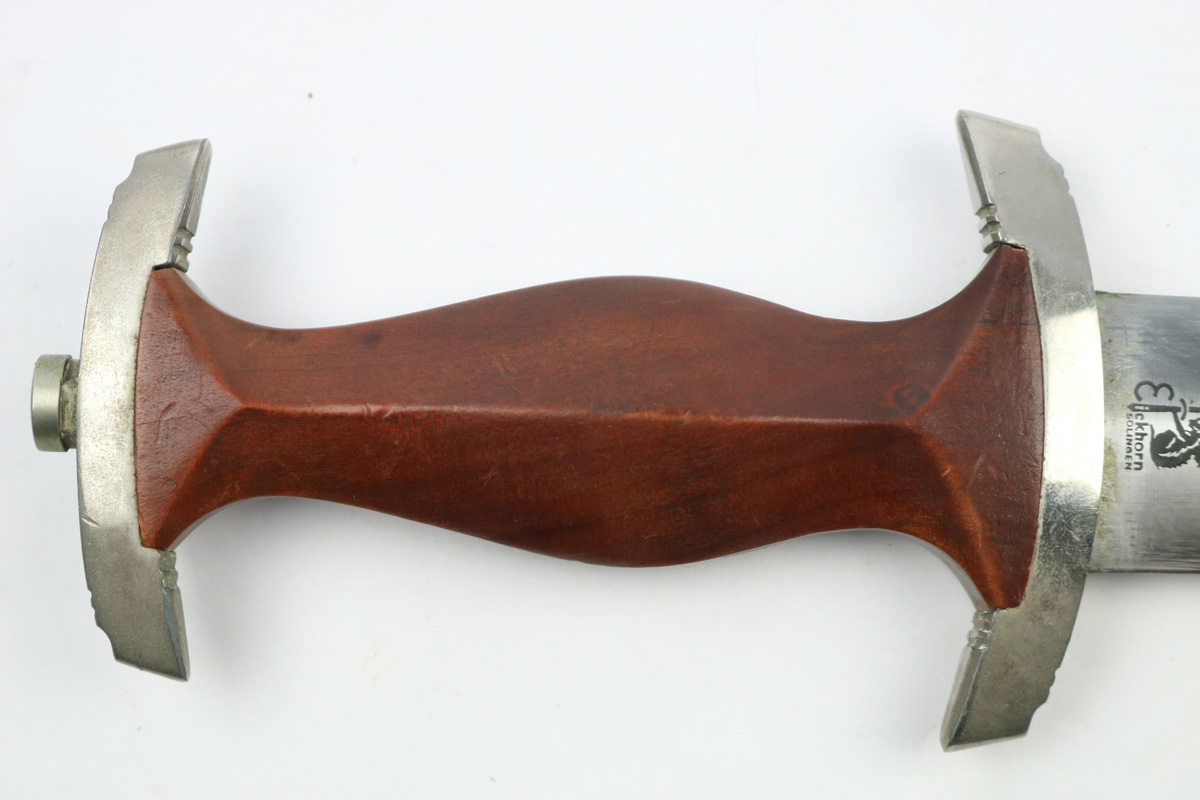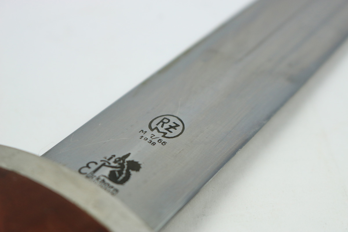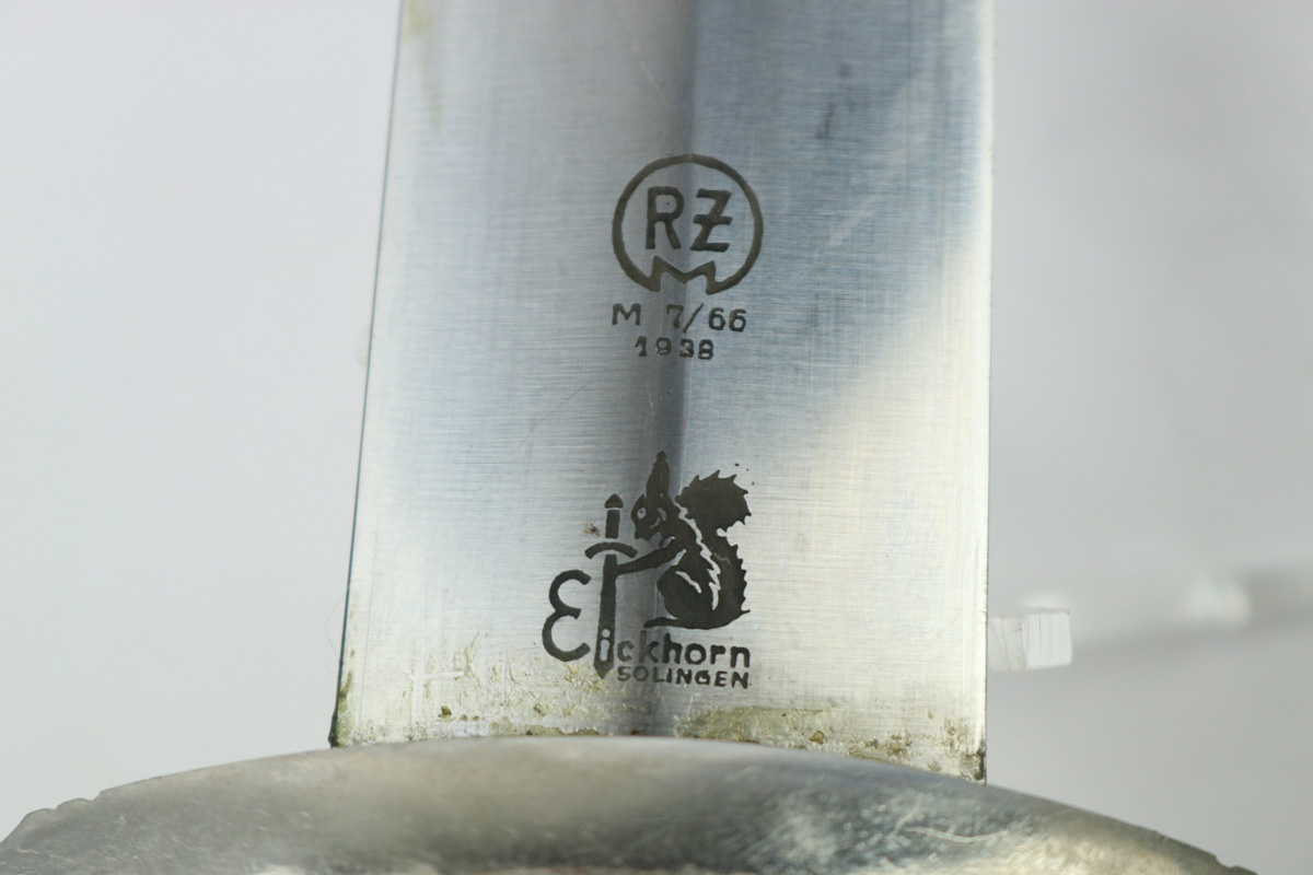 7/23/18 – This is an original WW2 production nazi SA Dagger. The dagger blade is maker stamped by Eickhorn, and also has “RZM M7/66 1938” above the maker marking. The blade is shiny with normal scabbard surface scratching and a few light oil stains. The condition is excellent overall though as there is very little signs of oxidation or patina. The handle is also excellent with no cracks or chips. The scabbard also appears to be original paint – almost completely in tact with no dents. There is a hanger included as well, which is also RZM stamped. The RZM code is M5/71 with an “oLc” maker stamp. Guaranteed all original and authentic.