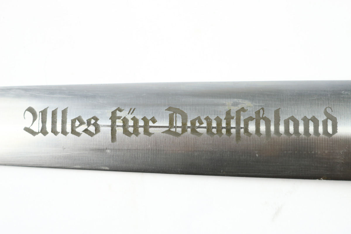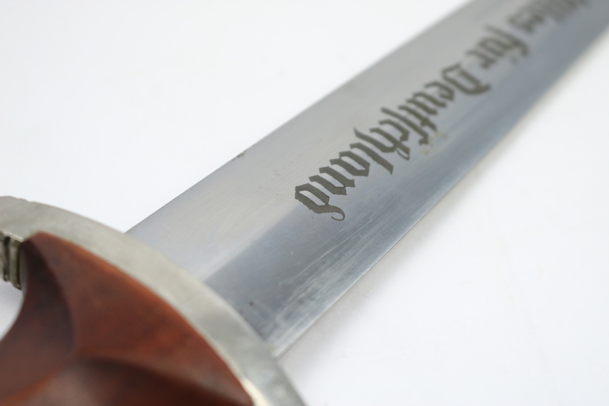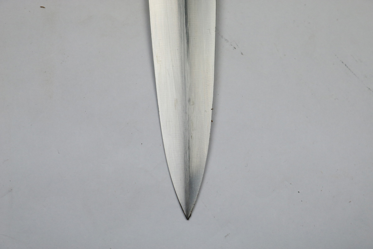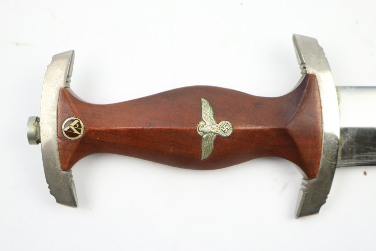 7/23/18 – This is an original WW2 production nazi SA Dagger. The dagger blade is maker stamped by Eickhorn, and also has “RZM M7/66 1938” above the maker marking. The blade is shiny with normal scabbard surface scratching and a few light oil stains. The condition is excellent overall though as there is very little signs of oxidation or patina. The handle is also excellent with no cracks or chips. The scabbard also appears to be original paint – almost completely in tact with no dents. There is a hanger included as well, which is also RZM stamped. The RZM code is M5/71 with an “oLc” maker stamp. Guaranteed all original and authentic.