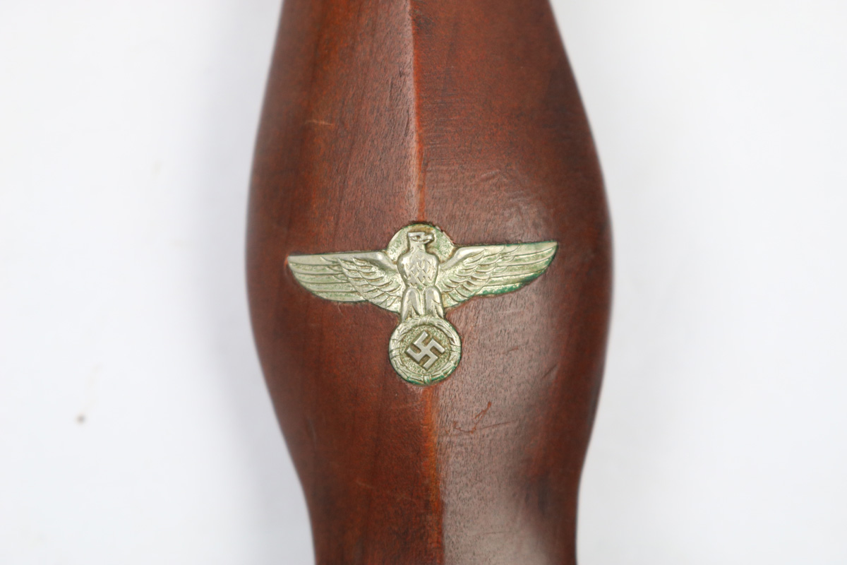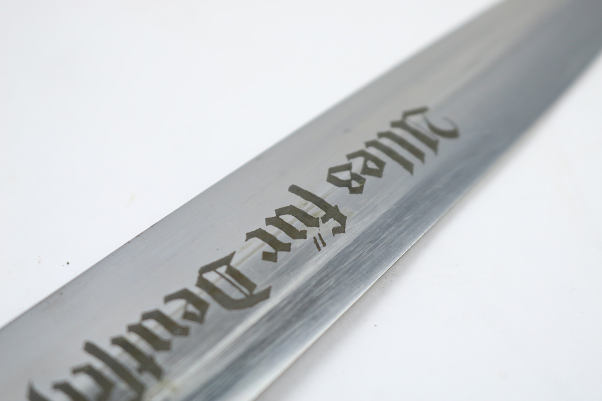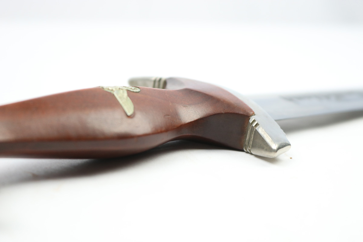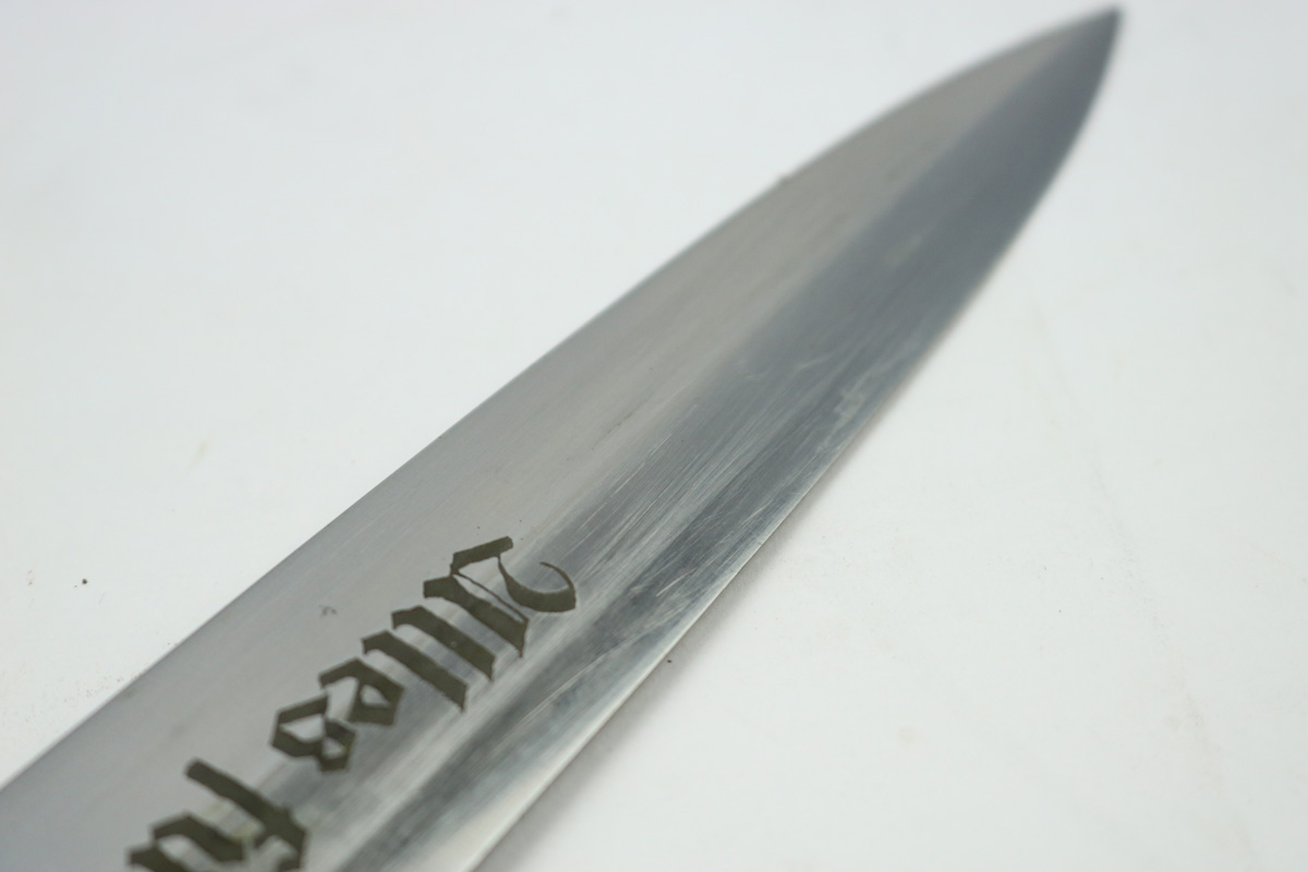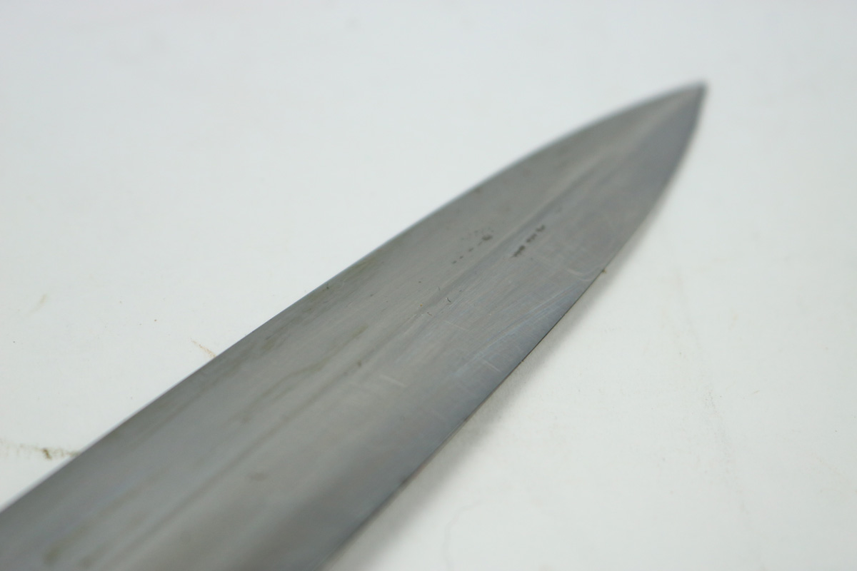 7/23/18 – This is an original WW2 production nazi SA Dagger. The dagger blade is maker stamped by Eickhorn, and also has “RZM M7/66 1938” above the maker marking. The blade is shiny with normal scabbard surface scratching and a few light oil stains. The condition is excellent overall though as there is very little signs of oxidation or patina. The handle is also excellent with no cracks or chips. The scabbard also appears to be original paint – almost completely in tact with no dents. There is a hanger included as well, which is also RZM stamped. The RZM code is M5/71 with an “oLc” maker stamp. Guaranteed all original and authentic.
