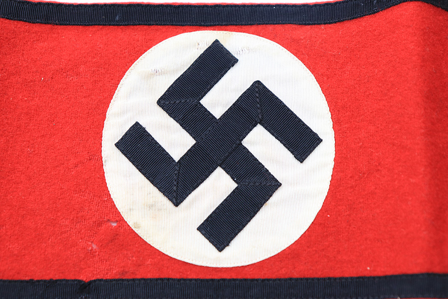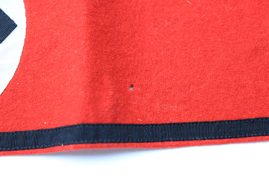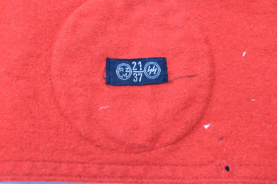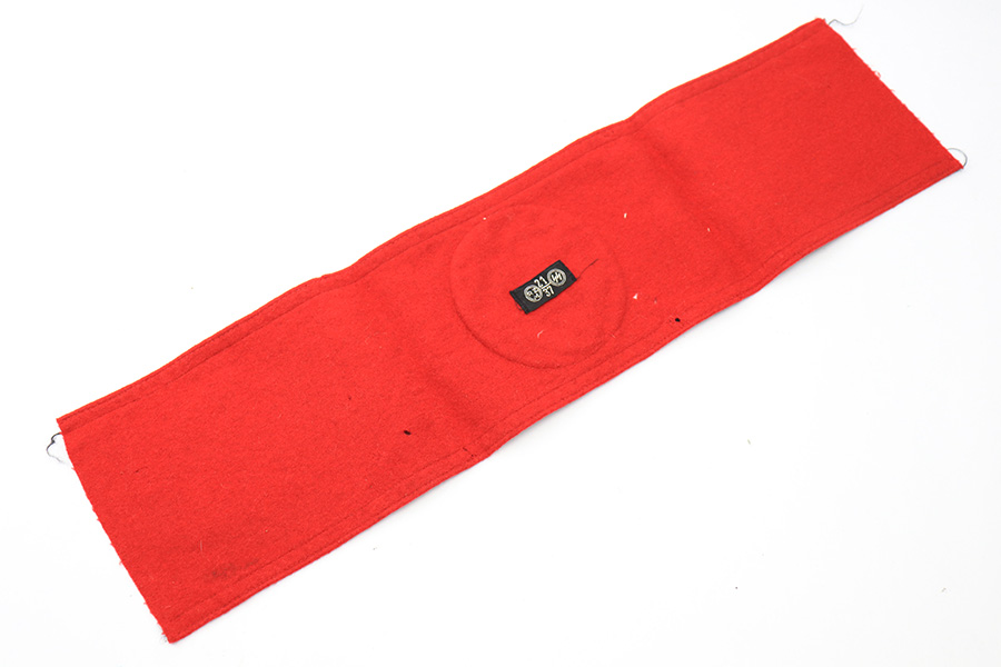 5/31/22 – This is a SS uniform arm band from WW2. The armband features a sewn on swastika logo within a sewn on white circle in the center of the armband. The edges are lined with black edging as shown. There are a few small moth holes in the wool, and some mild staining on the white circle but no major issues. Great overall condition with a sewn RZM tag on the interior.