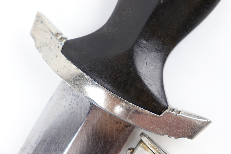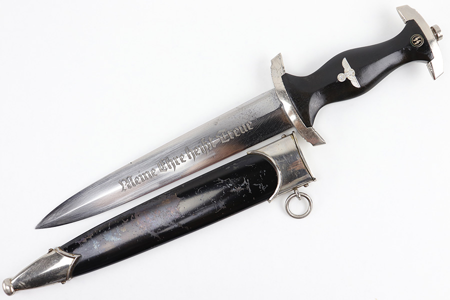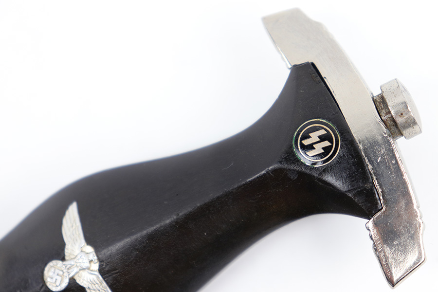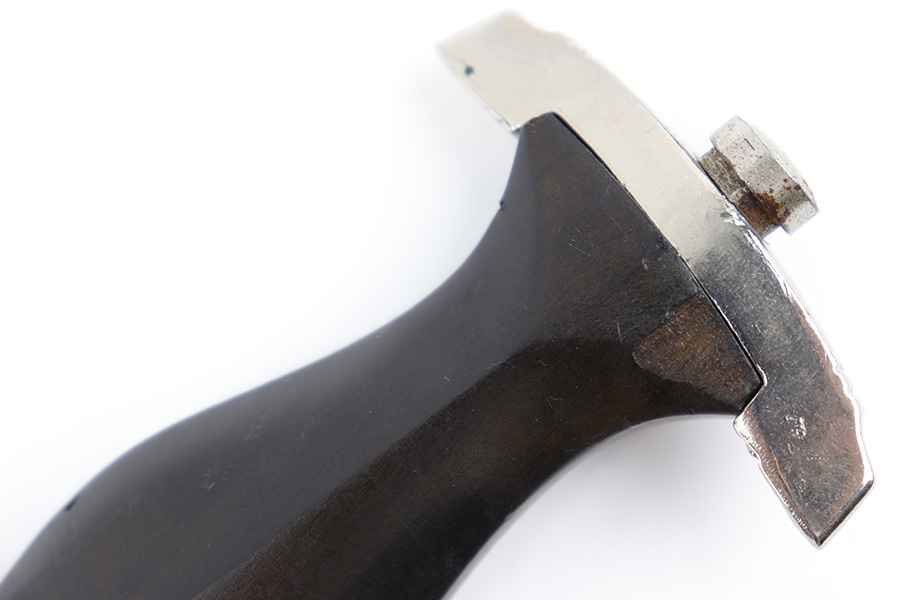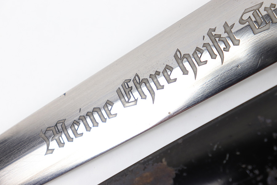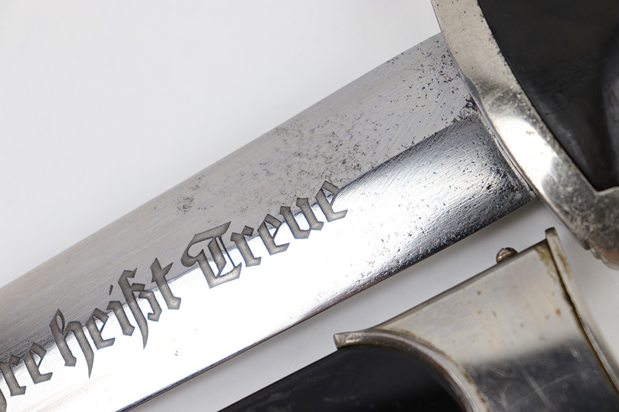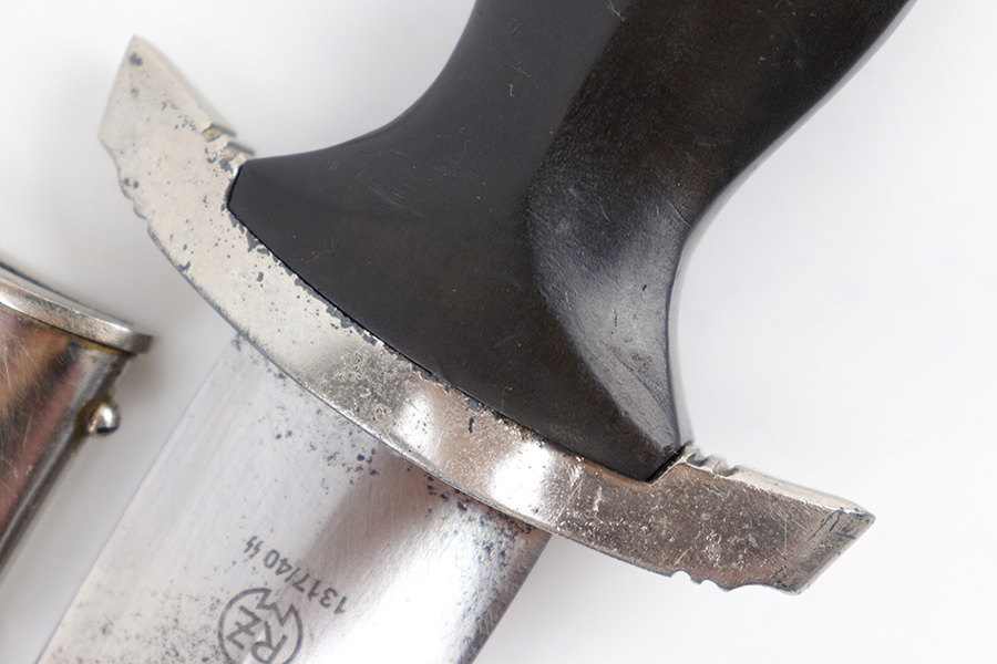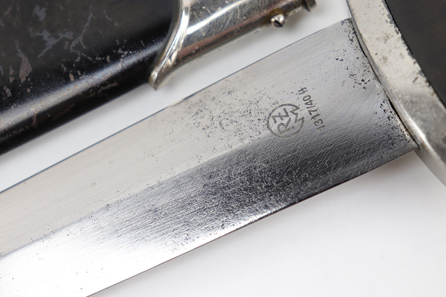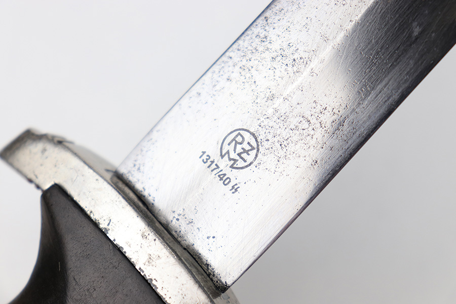 5/18/23 – This is an original WW2 production SS Dagger. The dagger is a later wartime production with nickel plated crossguards, and an RZM marked blade. The blade is maker code stamped “1317/40 SS” which is an unknown (but correct WW2) maker. The blade is also inscribed with the proper Meine Ehre Heisst Treue inscription on the side opposite the maker. There’s spotty oxidation and dark surface patina throughout the blade, as well as light surface scratches and scabbard rub wear. The edge is unsharpened, but there is one small ding along the edge as shown. The fittings have some mild surface patina. The wood grip has a crack near the “SS” emblem where the wood meets the pommel / upper crossguard. The reverse of the grip has a chip at the top as well. The grip has slight wiggle on the blade, which most likely means the grip has been replaced at some point. However, all parts / components of this example are original. The scabbard is painted black with steel fittings, and has light surface wear throughout.
