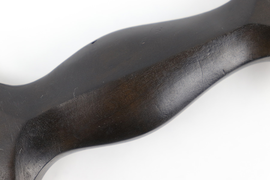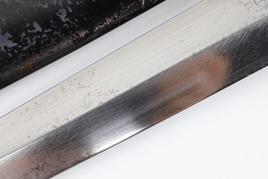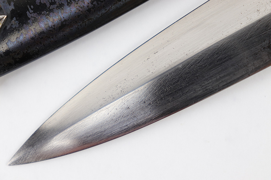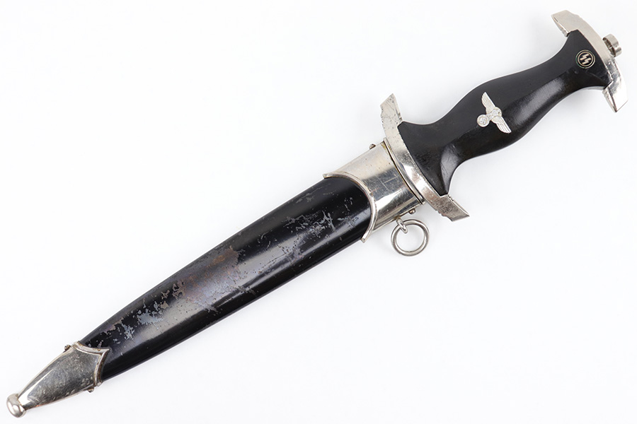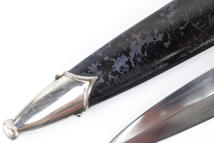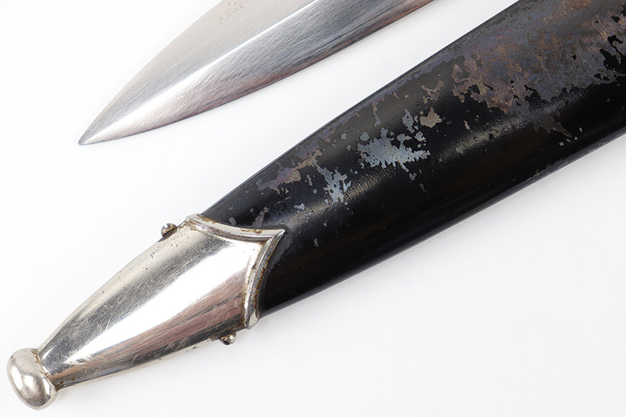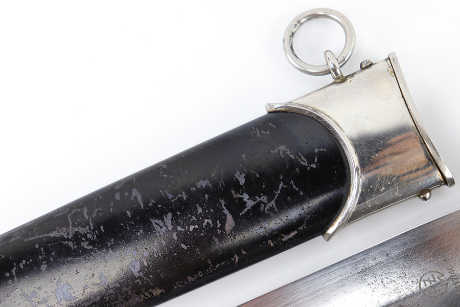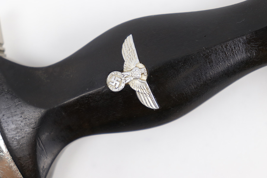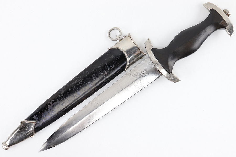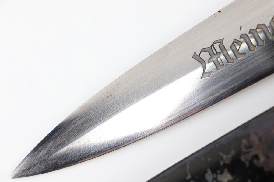 5/18/23 – This is an original WW2 production SS Dagger. The dagger is a later wartime production with nickel plated crossguards, and an RZM marked blade. The blade is maker code stamped “1317/40 SS” which is an unknown (but correct WW2) maker. The blade is also inscribed with the proper Meine Ehre Heisst Treue inscription on the side opposite the maker. There’s spotty oxidation and dark surface patina throughout the blade, as well as light surface scratches and scabbard rub wear. The edge is unsharpened, but there is one small ding along the edge as shown. The fittings have some mild surface patina. The wood grip has a crack near the “SS” emblem where the wood meets the pommel / upper crossguard. The reverse of the grip has a chip at the top as well. The grip has slight wiggle on the blade, which most likely means the grip has been replaced at some point. However, all parts / components of this example are original. The scabbard is painted black with steel fittings, and has light surface wear throughout.