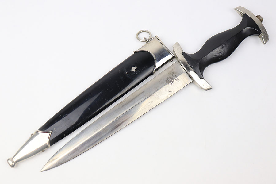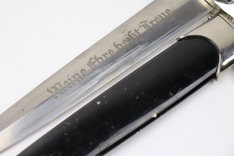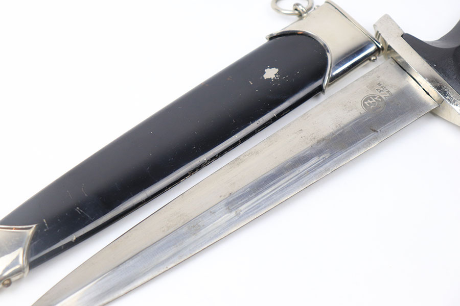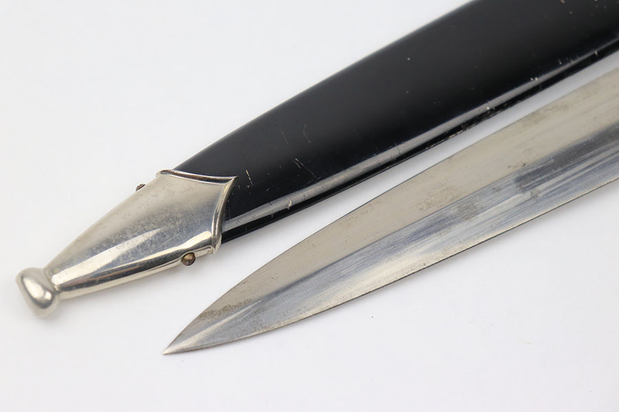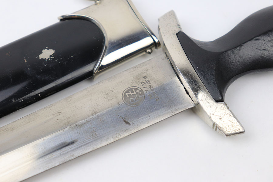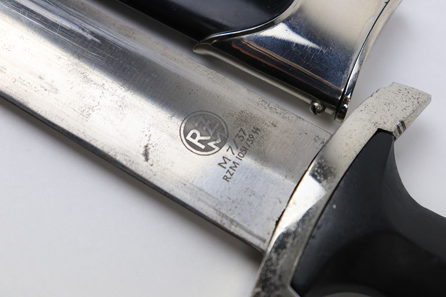 6/23/21 – This is a rare RZM SS Dagger made by Robert Klaas. The dagger comes with an original scabbard, and both are in great collector condition. The blade is unsharpened with subtle cross-graining and typical scabbard rub marks / surface scratches. There are some small spots of dark discoloration throughout but no major issues. RZM maker code stamped by Robert Klaas. The handle has no major cracks or chips, but there are two very small nicks in the wood. one is on the front near the hand guard, and the other on the reverse in the top left corner. The scabbard has a small dent and crack on the tip, and some mild paint loss.