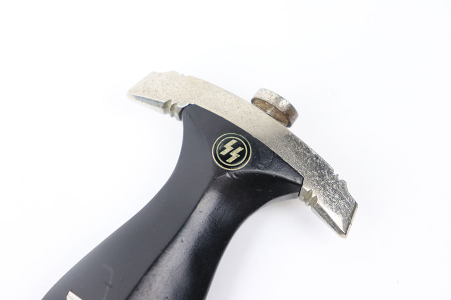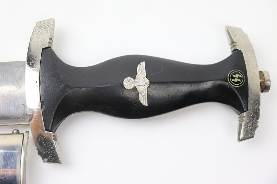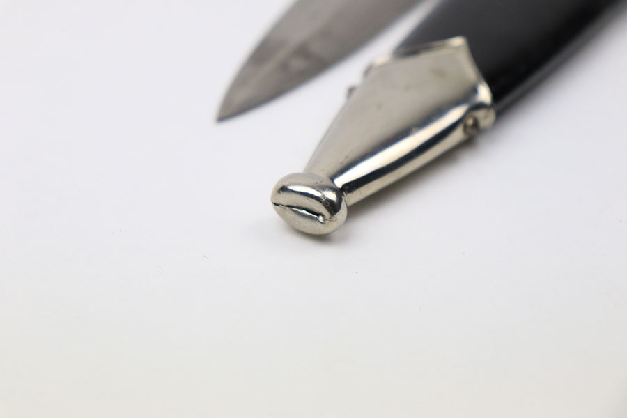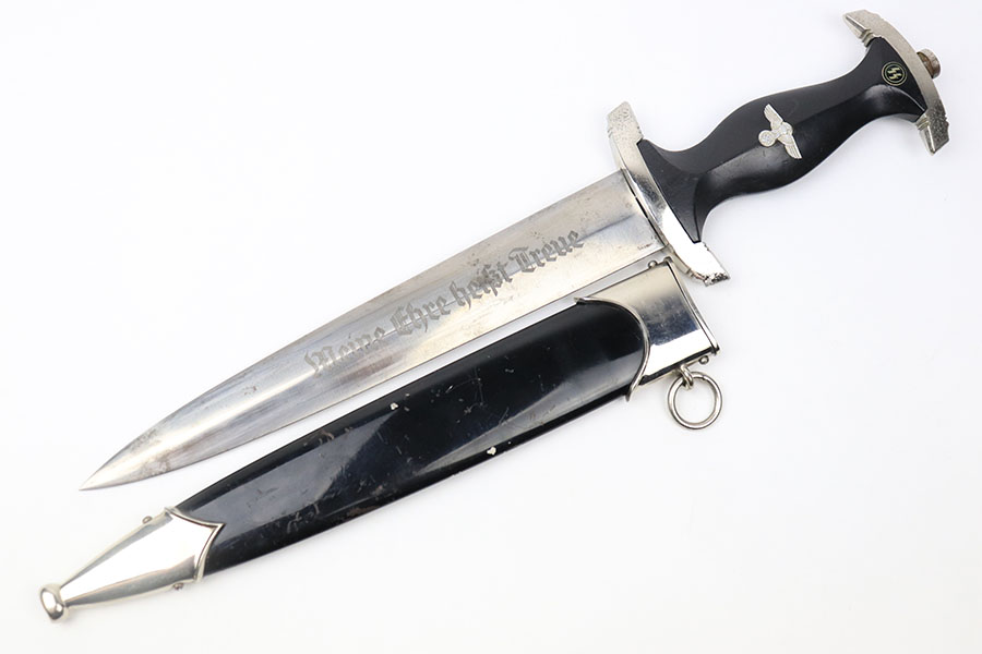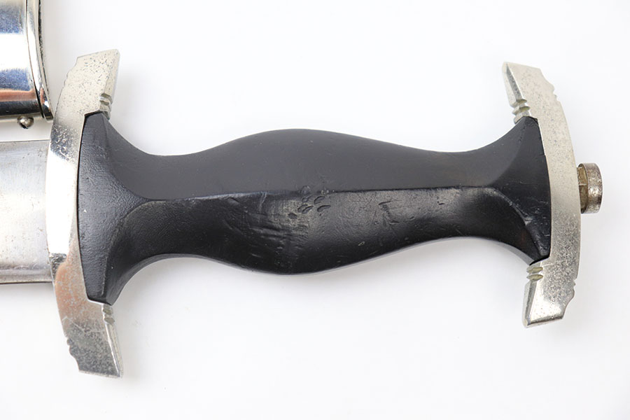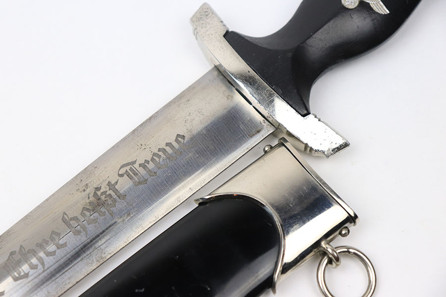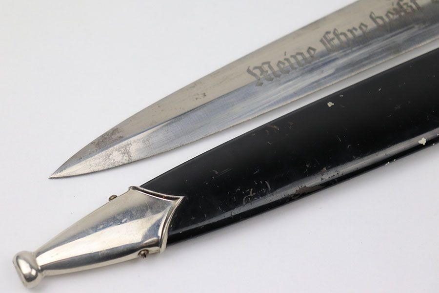 6/23/21 – This is a rare RZM SS Dagger made by Robert Klaas. The dagger comes with an original scabbard, and both are in great collector condition. The blade is unsharpened with subtle cross-graining and typical scabbard rub marks / surface scratches. There are some small spots of dark discoloration throughout but no major issues. RZM maker code stamped by Robert Klaas. The handle has no major cracks or chips, but there are two very small nicks in the wood. one is on the front near the hand guard, and the other on the reverse in the top left corner. The scabbard has a small dent and crack on the tip, and some mild paint loss.