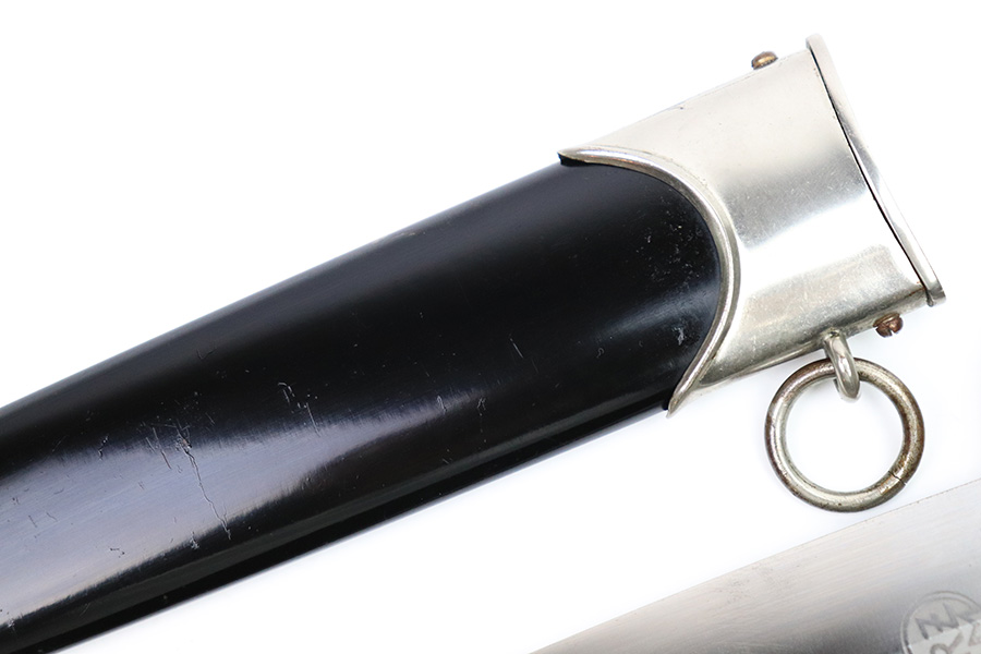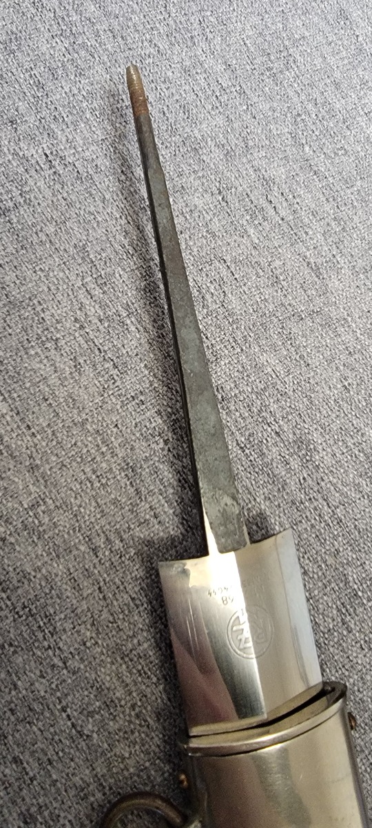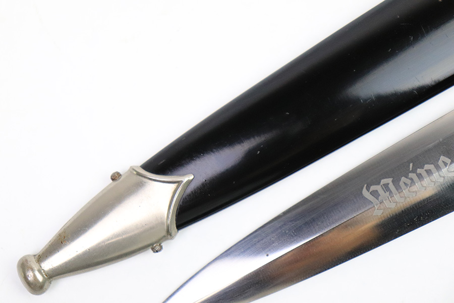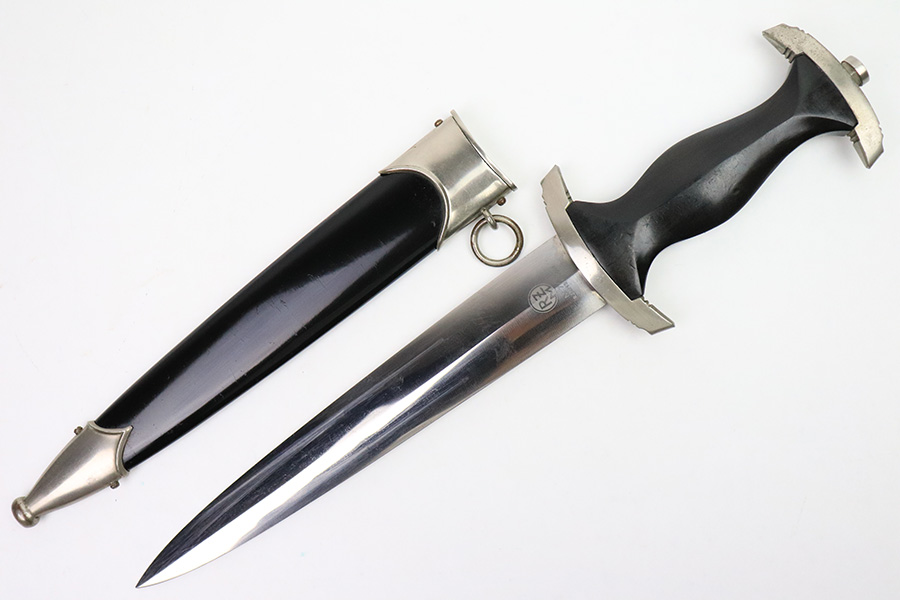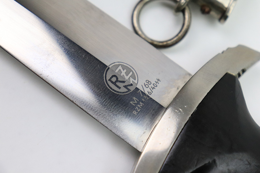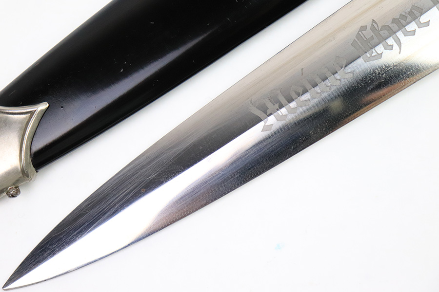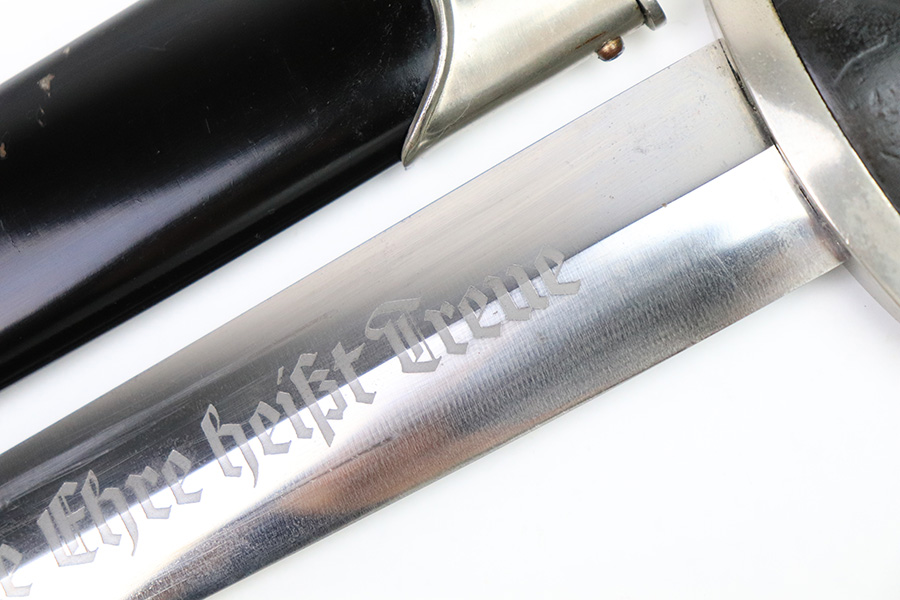 3/5/24 – This is an original SS Dagger with a RZM maker marking and contract number. The blade on this example is very clean and excellent overall with some mild surface scratching and scabbard wear. There’s a few small specks of discoloration, but this is very mild. The cross graining is visible throughout the blade. One side of the blade shows the SS motto, and the reverse is RZM maker and contract numbered. First is M7/68 for Lauterjung & Co. Underneath this is “RZM 1316/40SS” for contract number 1316 in 1940. The contracts go up to 1317, so this is likely a late 1940 production. The fittings are nickel with some mild surface patina and typical signs of aging. The wood grip is excellent with no chips or cracks. Comes with an excellent scabbard that has minimal paint loss and no dents.