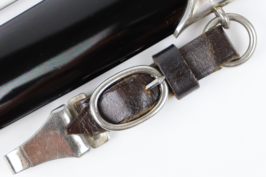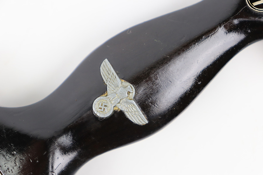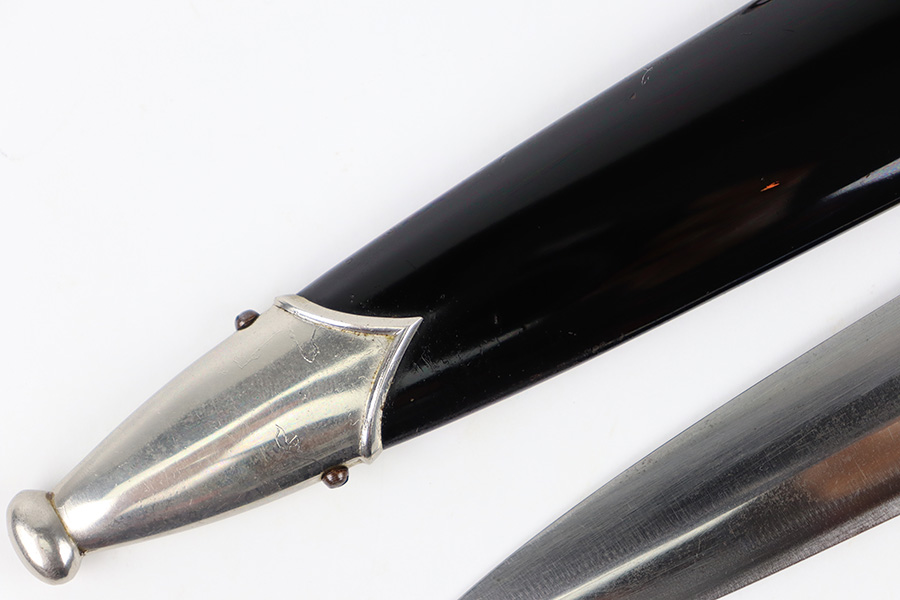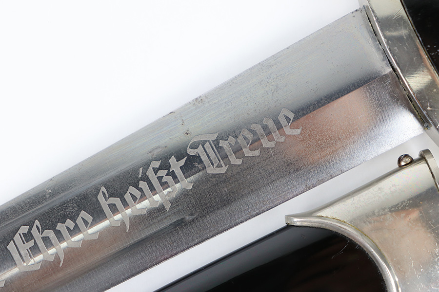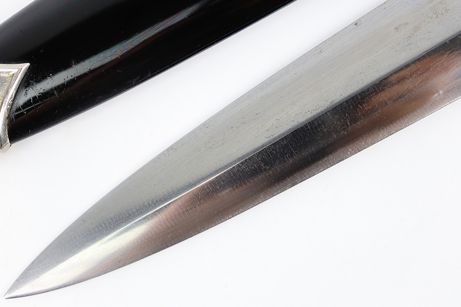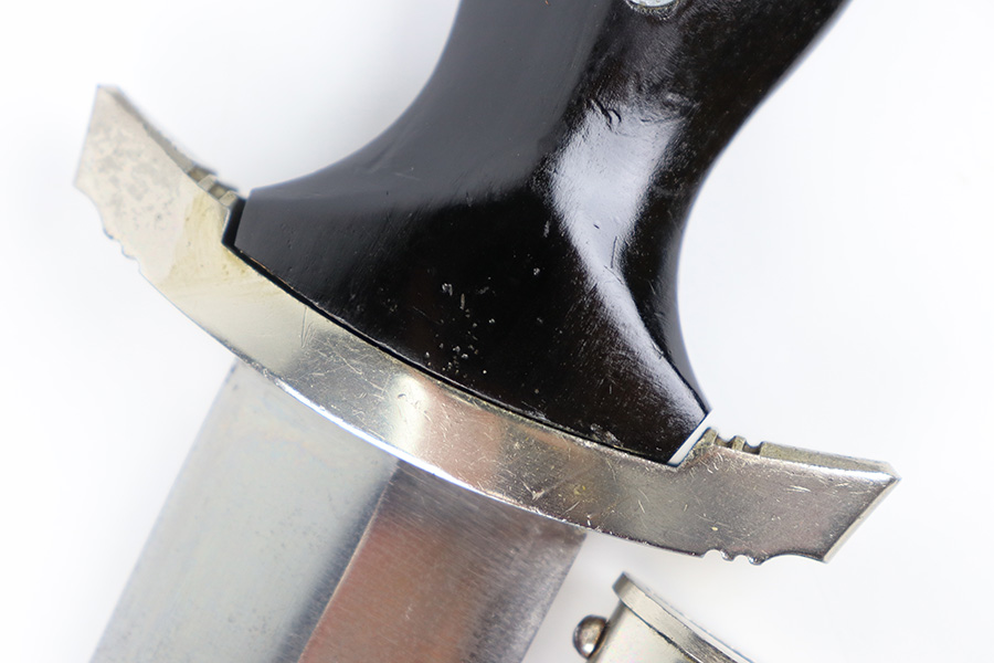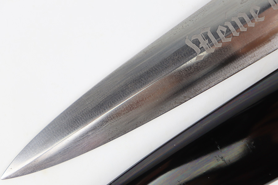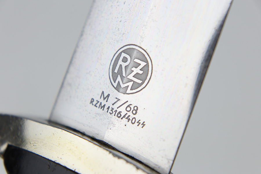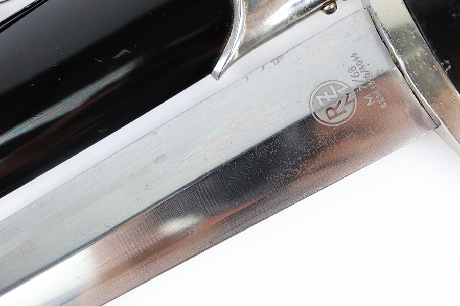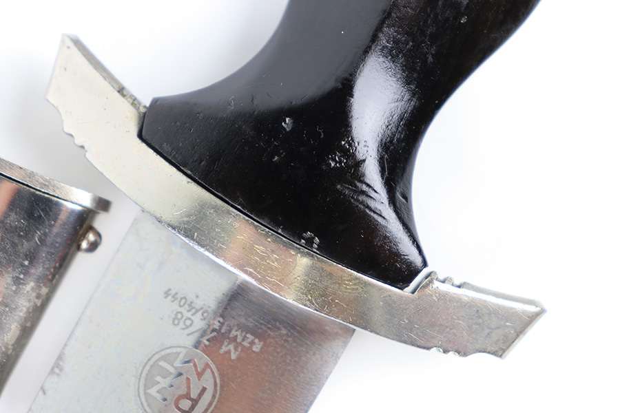 11/2/23 – This is an original WW2 production RZM SS Enlisted Man’s Dagger. The base of the blade is RZM stamped with a M7/68 code for the maker Tiger. The blade is shiny with visible cross-graining and some mild speckling patina throughout each side, along with typical scabbard rub wear and micro-scratches. No major issues and a clean, unsharpened edge. The cross guards are nickel plated with some natural patina around the edges and corners. The wood handle is original with a hairline crack stemming from the top of the grip on each side. The emblems in the grip are original and show normal surface wear. The fittings around the handle have mild wiggle or “play” when handled. Comes with an excellent black painted scabbard and an original RZM marked hanger.