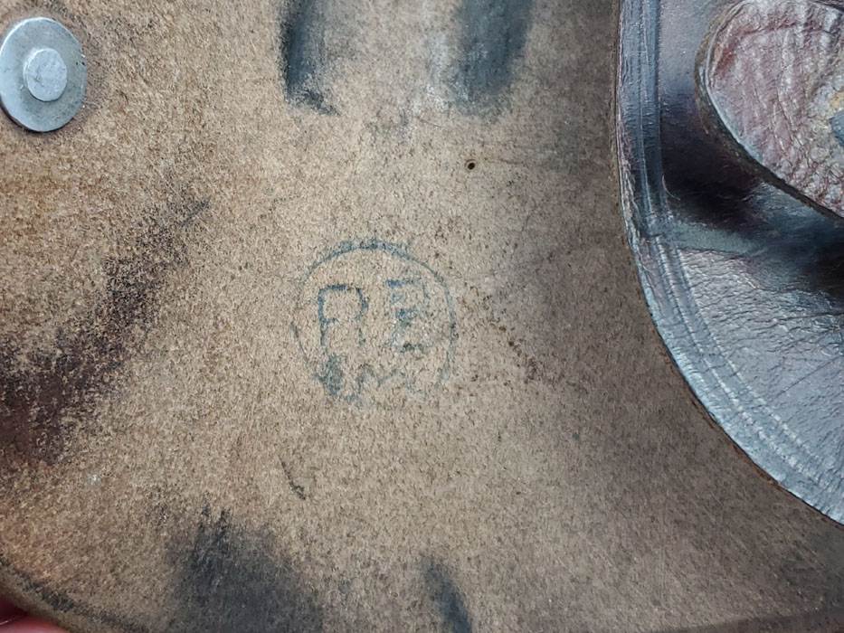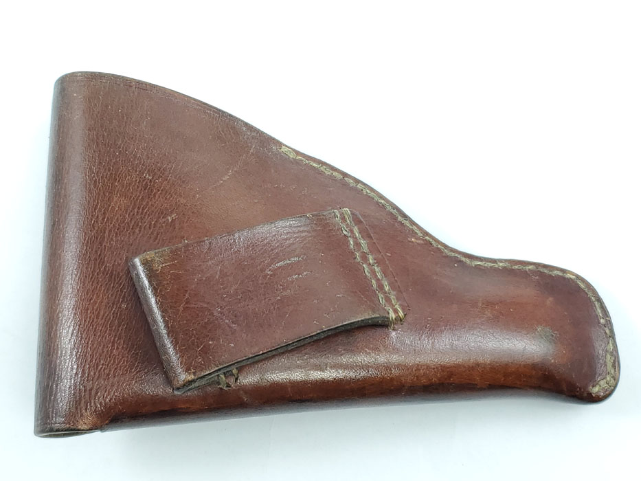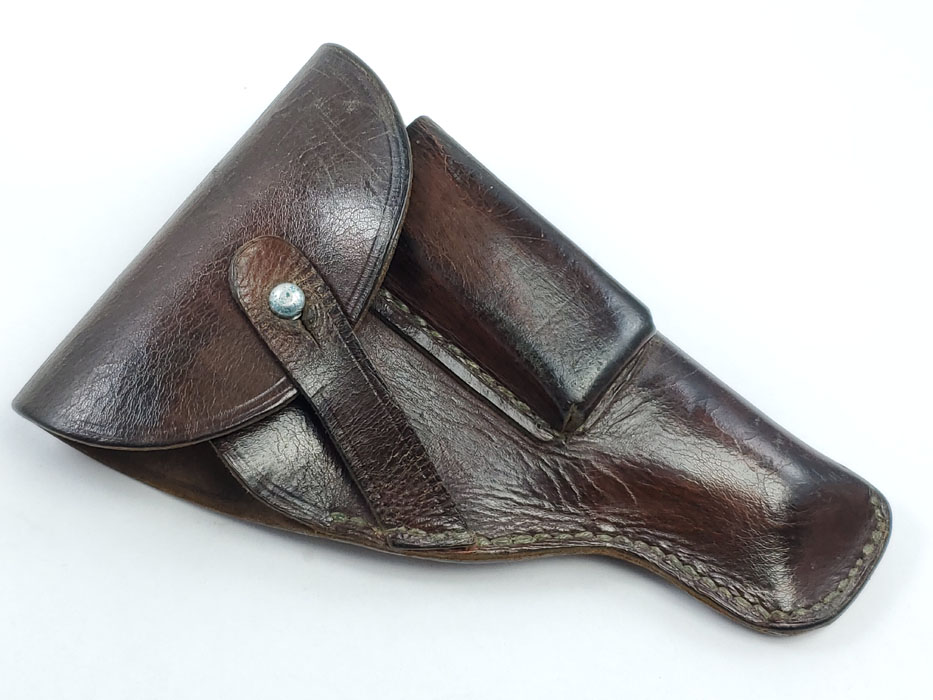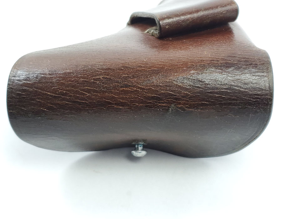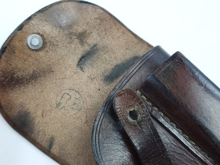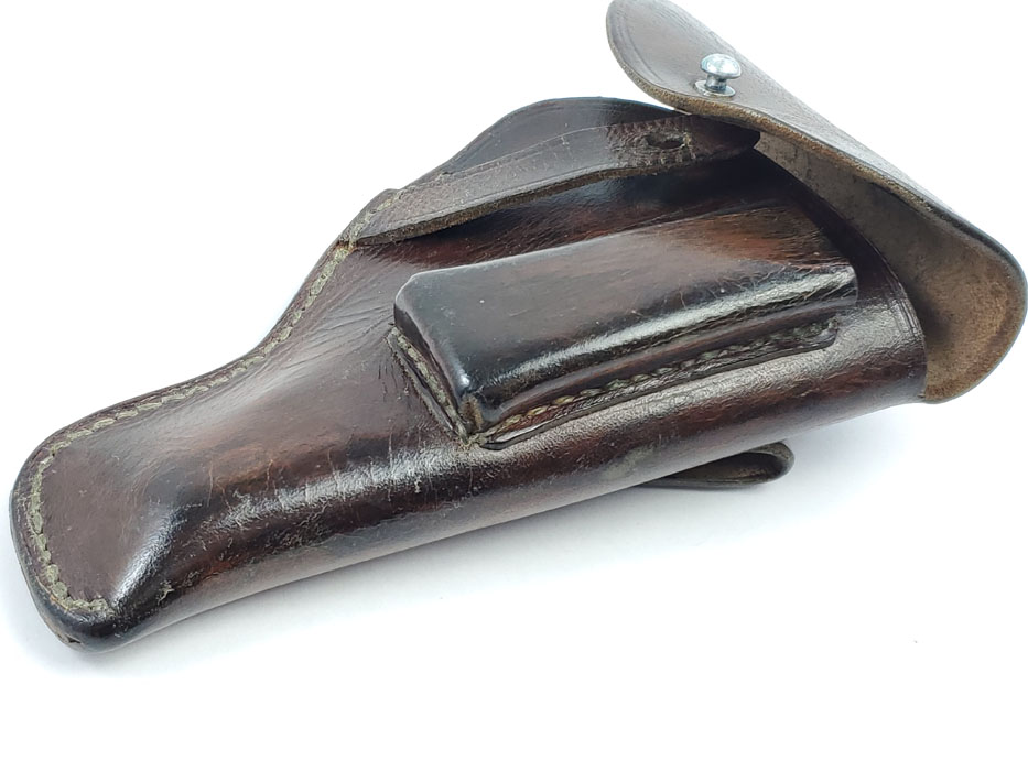 4/14/20 – This is an unusual, seldom seen style of Walther PPK holster. The holster can also fit a Walther PP, but the PP is a little too snug for comfort. The holster has strong leather with some light surface wrinkling on the top leather. The front leather appears to have once been painted or dyed black, something often seen on WW2 military holsters. The stitching is tight and all original. The interior leather has a faint RZM ink stamp. See photos.