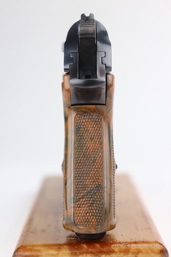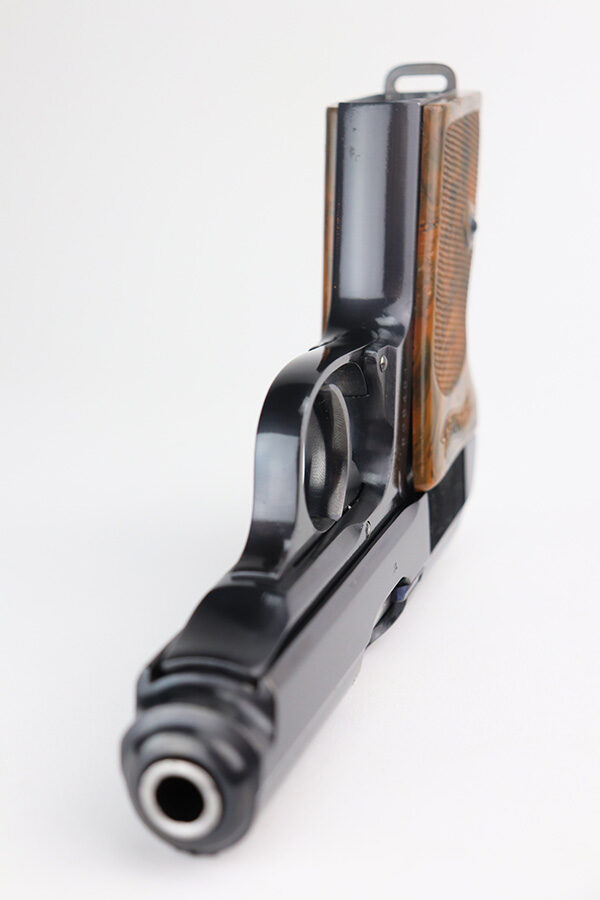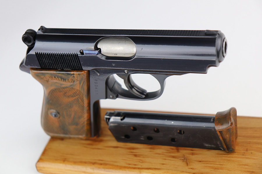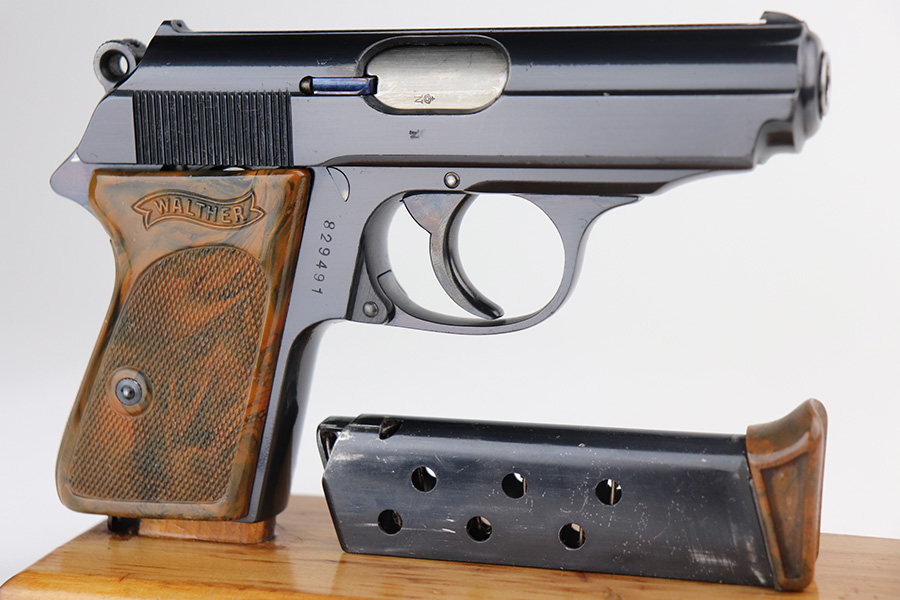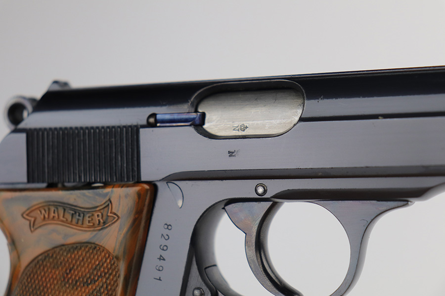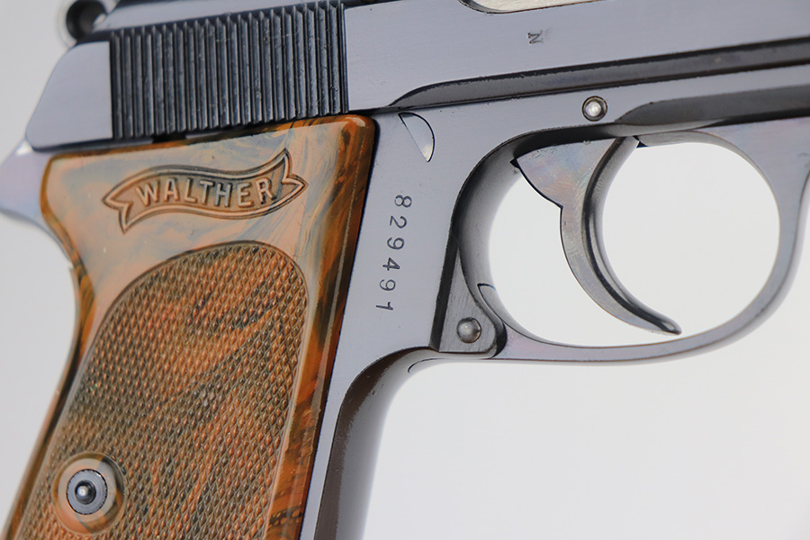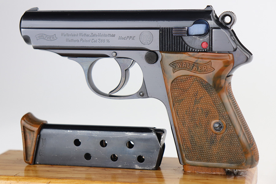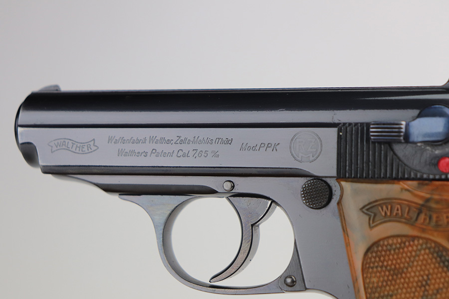 8/17/21 – This is an excellent example of an RZM-marked Walther PPK manufactured in 1935. It is all matching and has the proper “Crown N” proofs. The gun has retained about 99% of its finish, but we believe the finish was professionally restored at some point. In any case, there is just a hint of wear around the muzzle. Comes with an excellent grip – no chips or cracks. Also comes with a Walther banner brown finger extension magazine. Excellent bore – shiny with strong rifling and minor pin-pricking in the grooves.