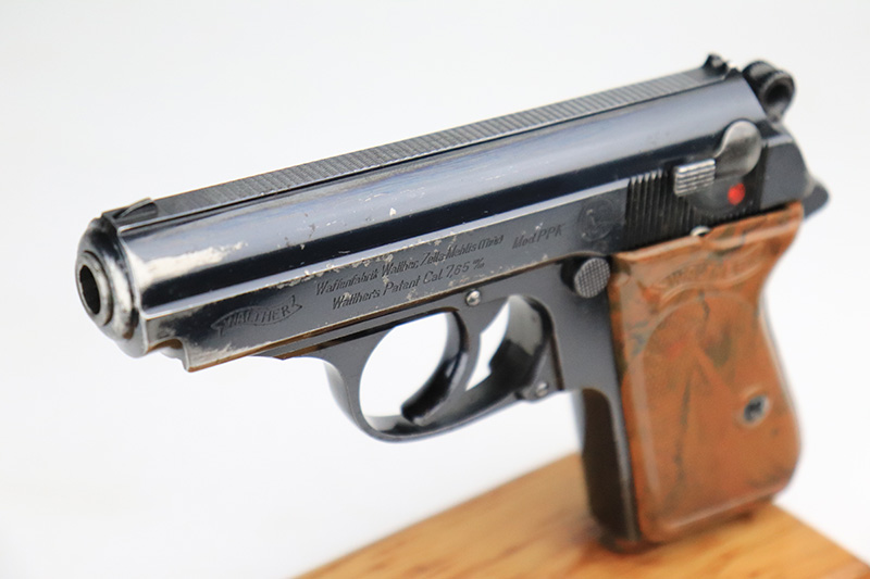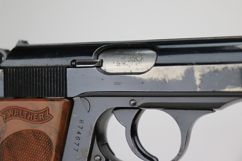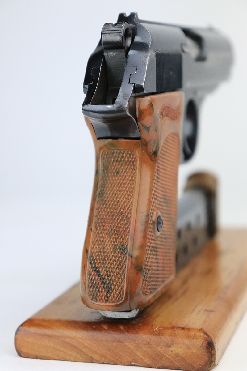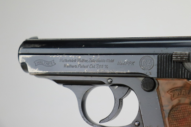 9/27/22 – This is an original and correct RZM marked Walther PPK from 1935. The RZM (Reichs Zeug Meisterei) was the equipment office of the NSDAP and was established to contract for equipment. These pistols were commonly thought to be issued to the German political leaders of the time. The bluing on this pistol rates at 90-92%. There is obvious spotty wear on both sides of the slide, mostly near the muzzle end. A few small areas of tiny pits on the front strap and right side of the frame. Comes with an excellent brown Walther grip (one tiny hairline crack on the right side) and a proper Walther banner-only finger extension magazine. The bore has great rifling with minor freckling throughout.