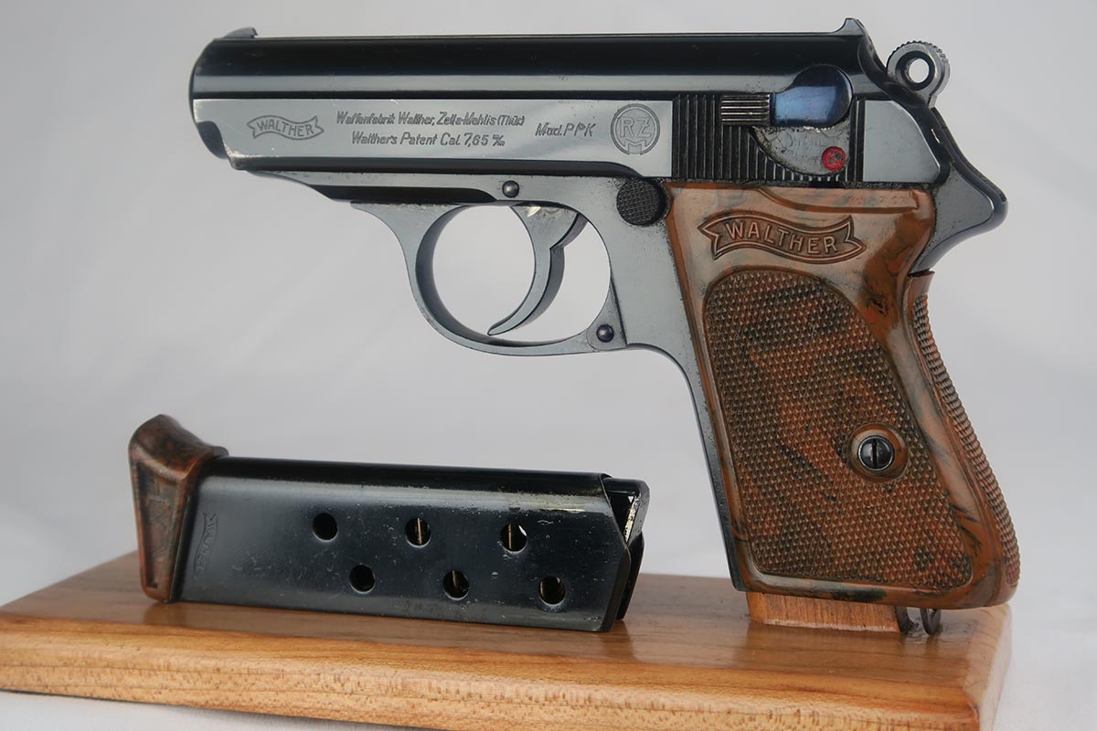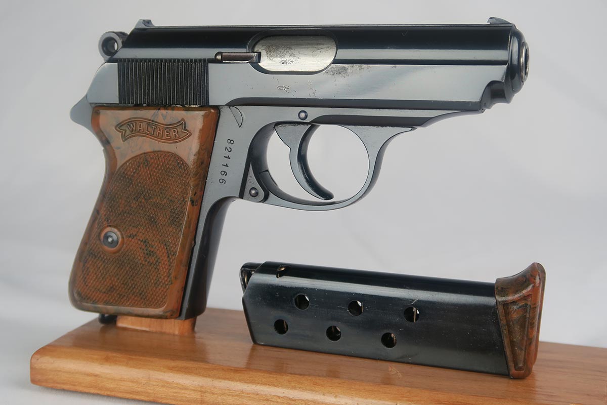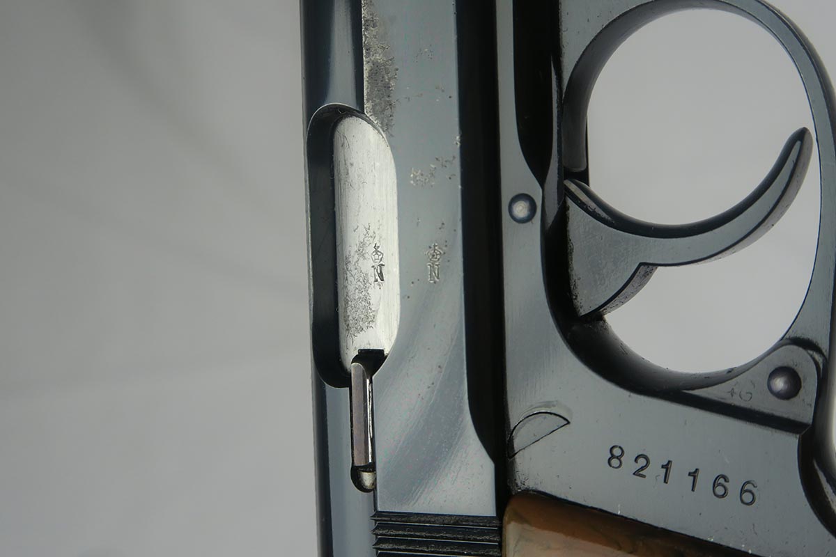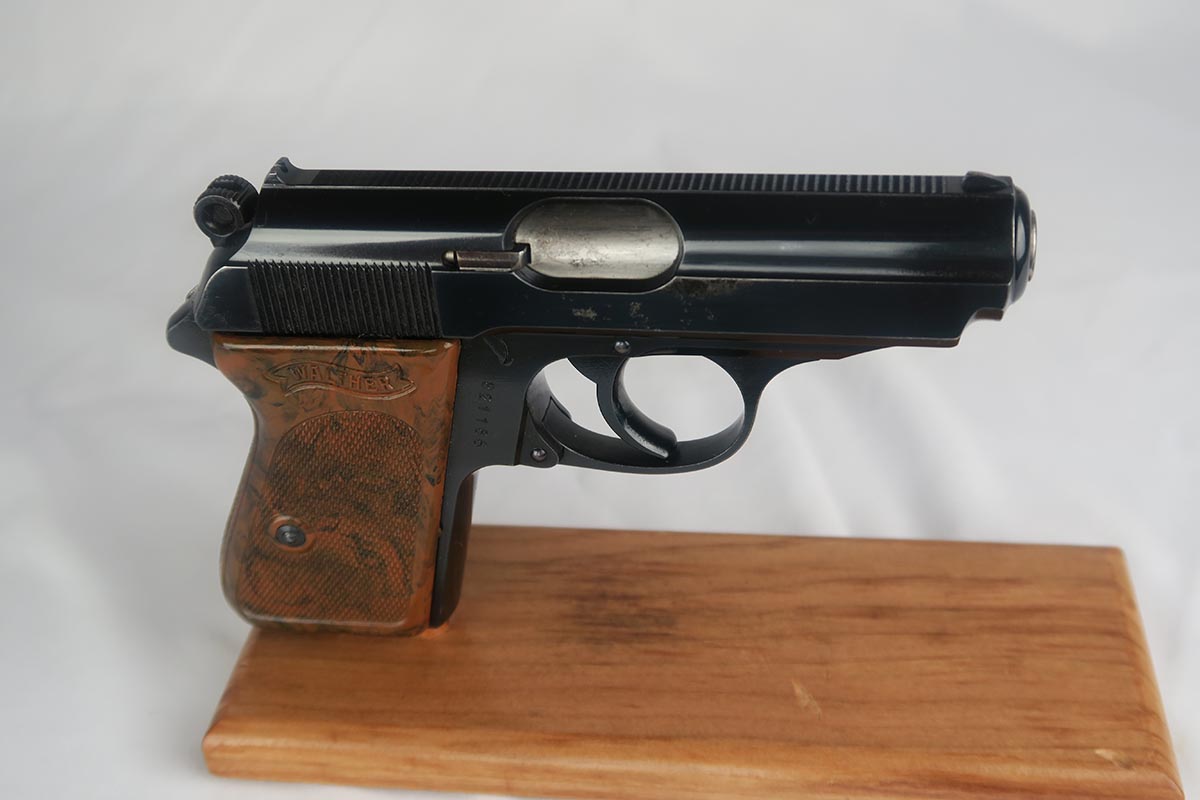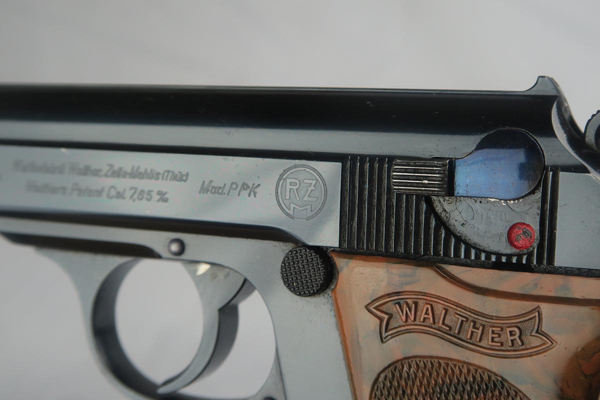 10/12/17 – This is an original RZM Walther PPK from 1934 that would’ve been issued to the German political leaders of the time.  The finish rates at 96-97% with some muzzle wear, and an area of light surface corrosion near the ejection port.  The grip and finger extension magazine are in near-mint condition.  The early 90 degree safety still shows much of the original fire blue.  Minty bore.