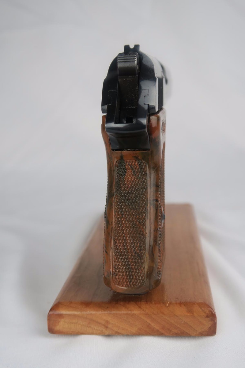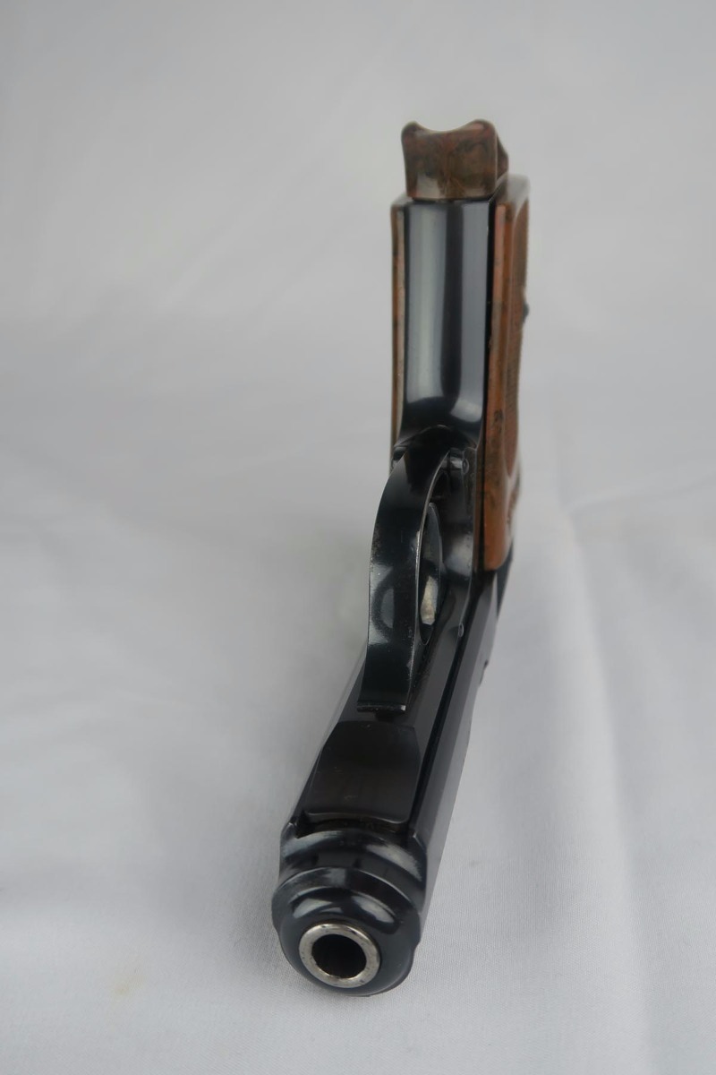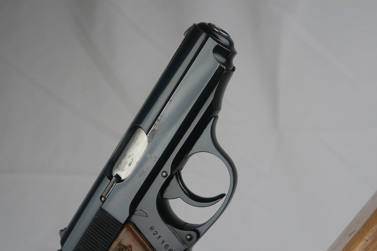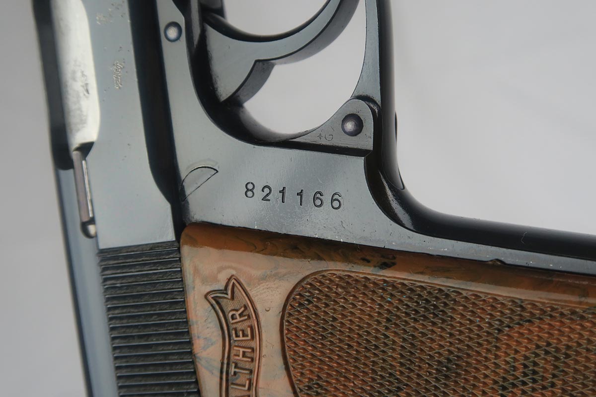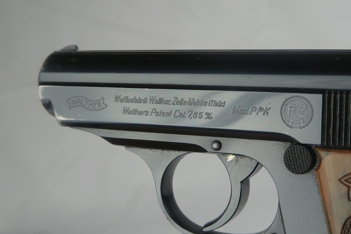 10/12/17 – This is an original RZM Walther PPK from 1934 that would’ve been issued to the German political leaders of the time.  The finish rates at 96-97% with some muzzle wear, and an area of light surface corrosion near the ejection port.  The grip and finger extension magazine are in near-mint condition.  The early 90 degree safety still shows much of the original fire blue.  Minty bore.