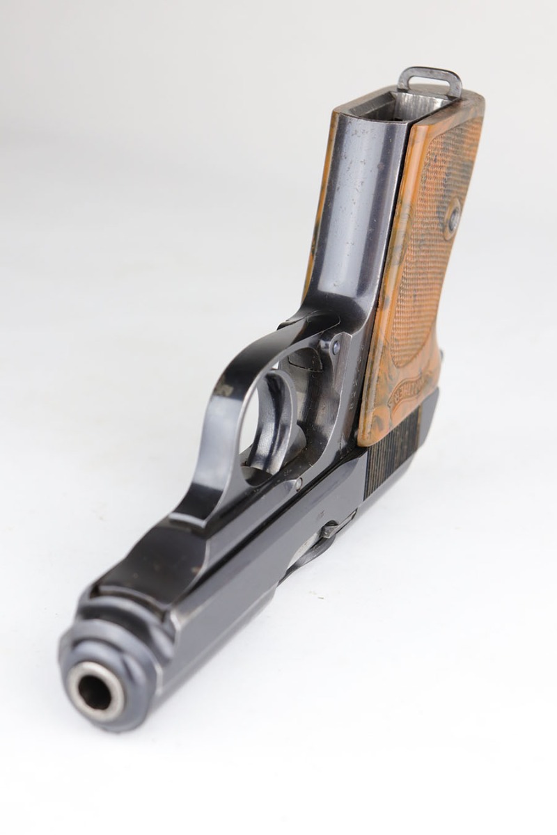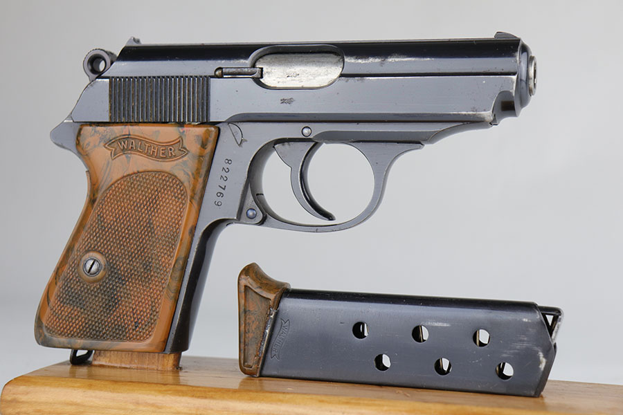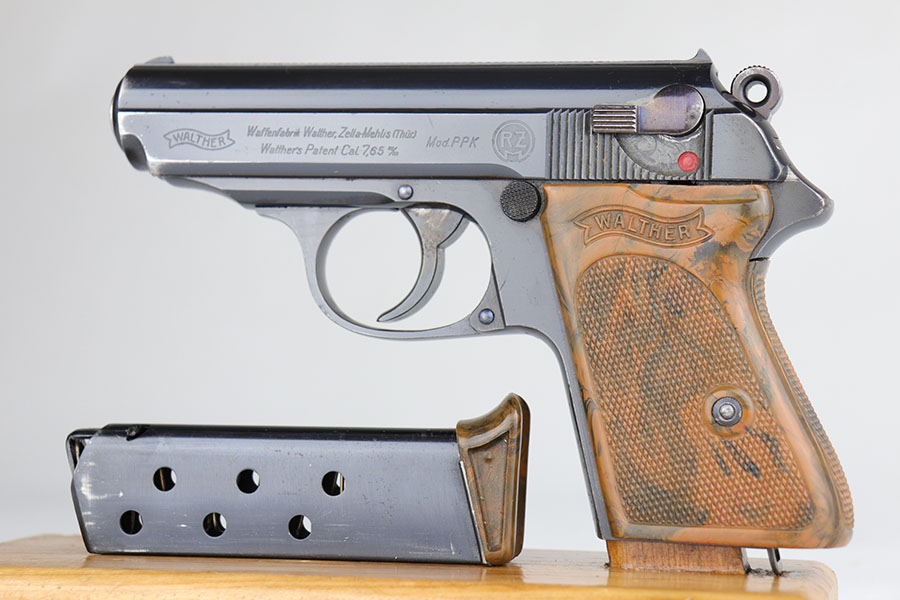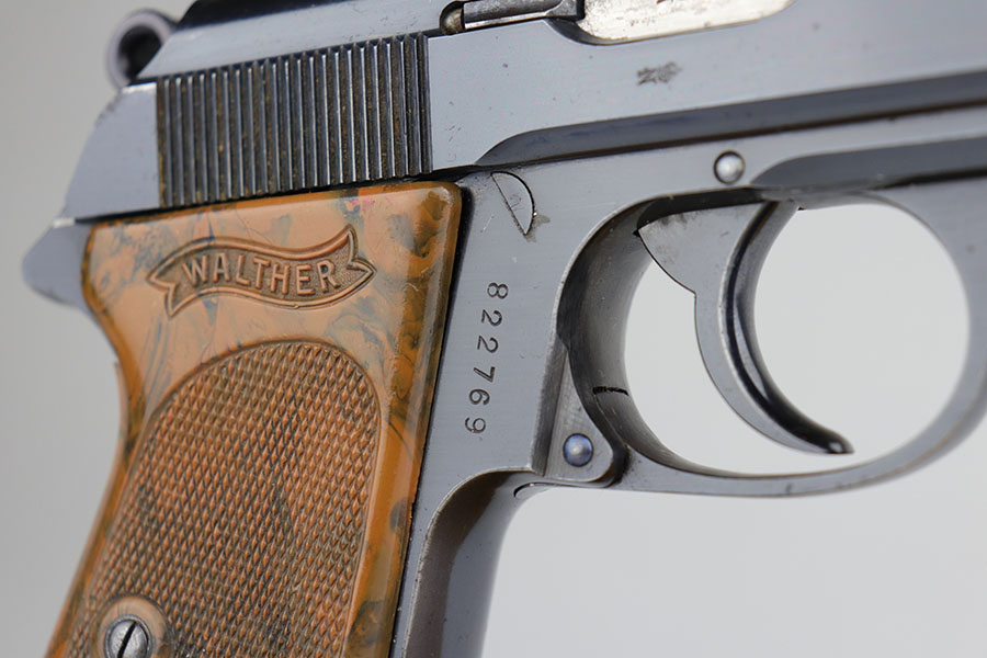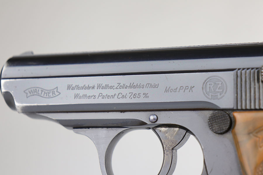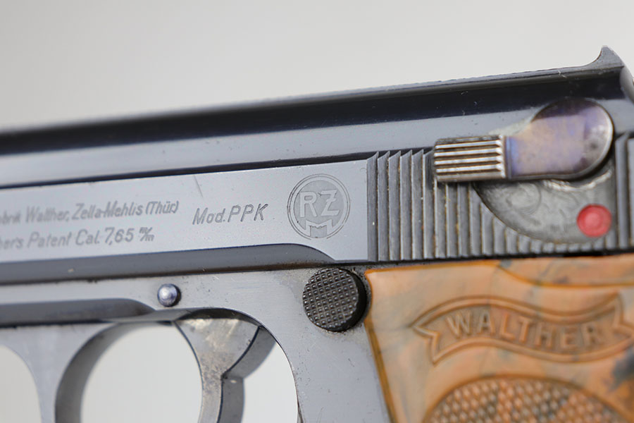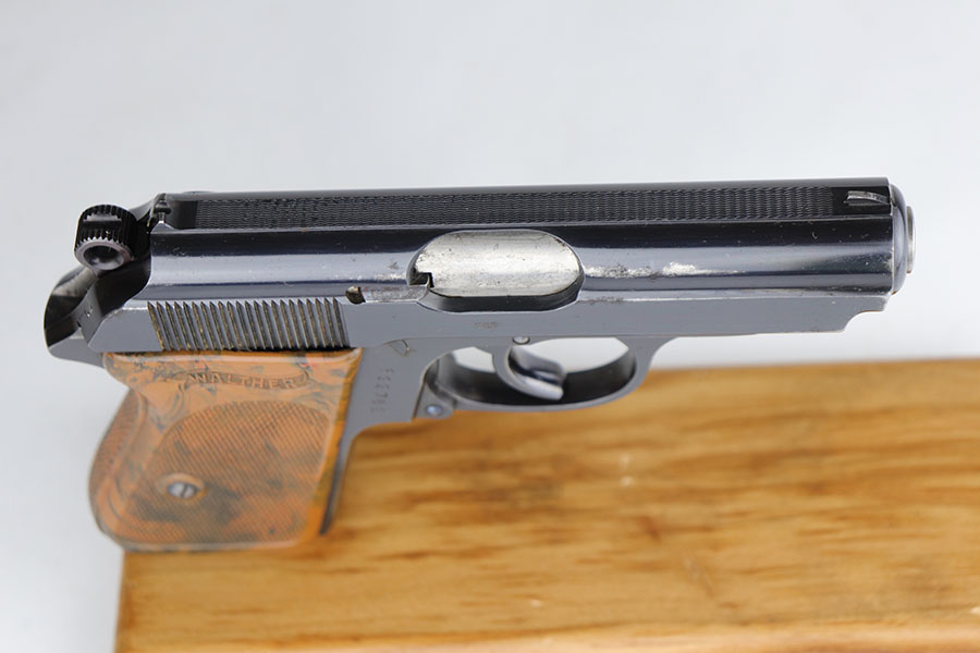 5/14/20 – This is an original and correct RZM marked Walther PPK from 1934-35 in excellent condition. The RZM (Reichs Zeug Meisterei) was the equipment office of the NSDAP and was established to contract for equipment. These pistols were commonly thought to be issued to the German political leaders of the time. The bluing on this pistol rates at about 94-95%, with minor muzzle wear on either side of the muzzle. There’s also a small area of finish loss on the trigger guard, and a more pronounced one on the right side of the slide near the ejection port.  Early 90 degree safety.  Excellent grip with no major cracks or chips. Finger extension magazine does have a chip where it slides onto the baseplate.  Minty bore.