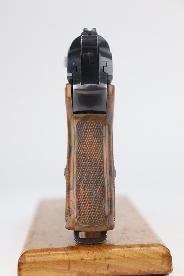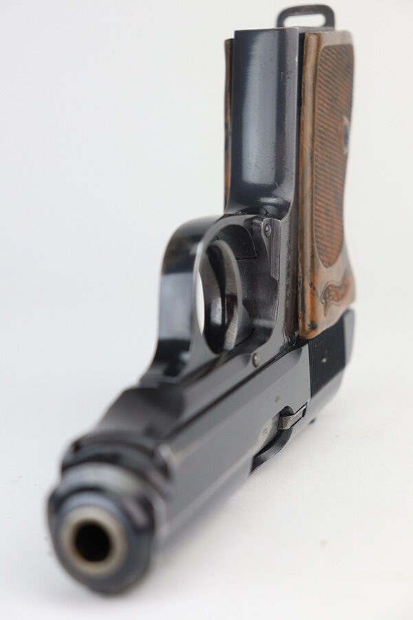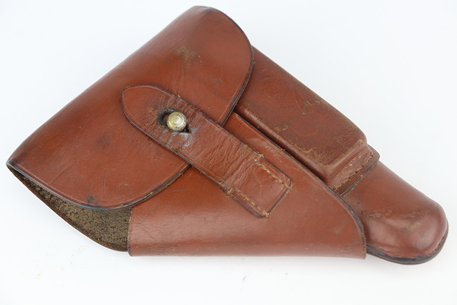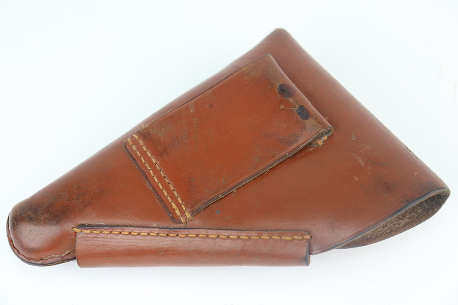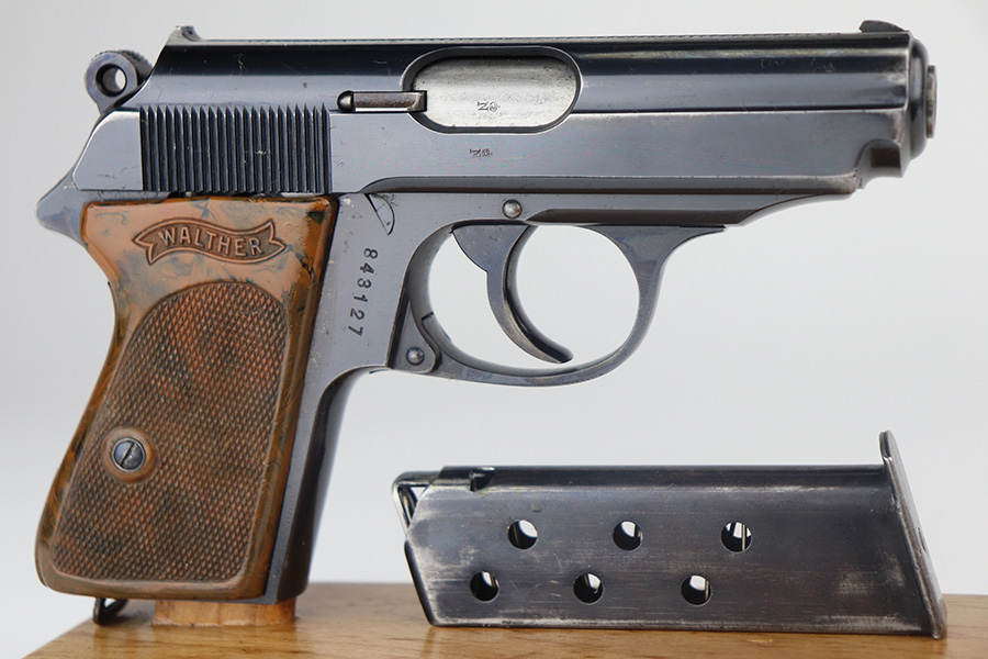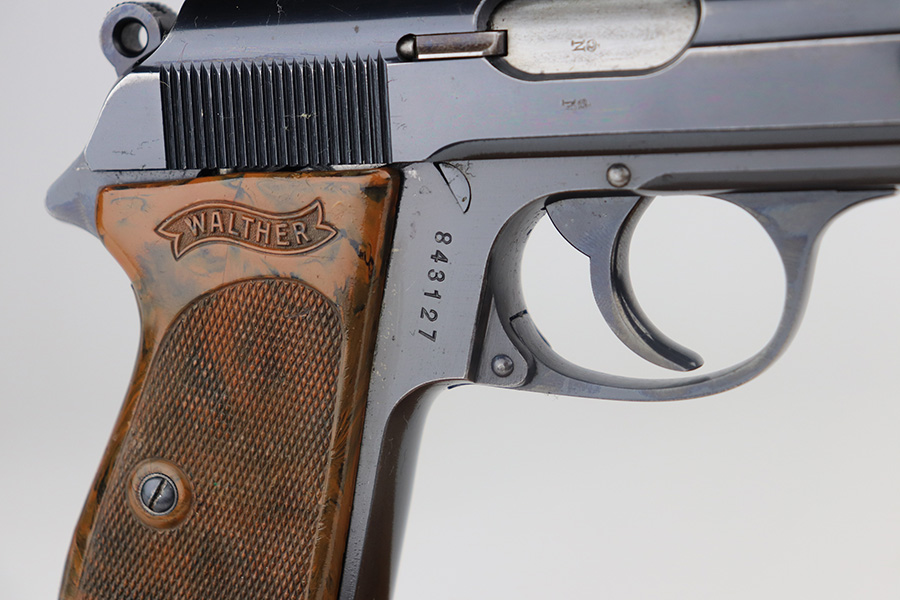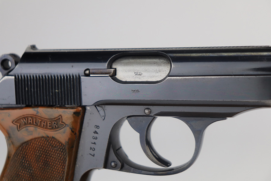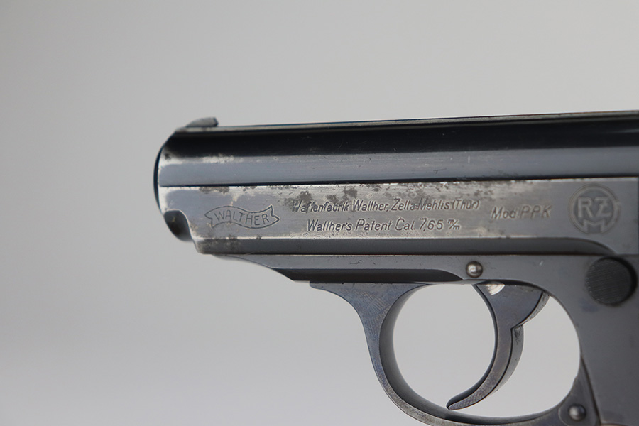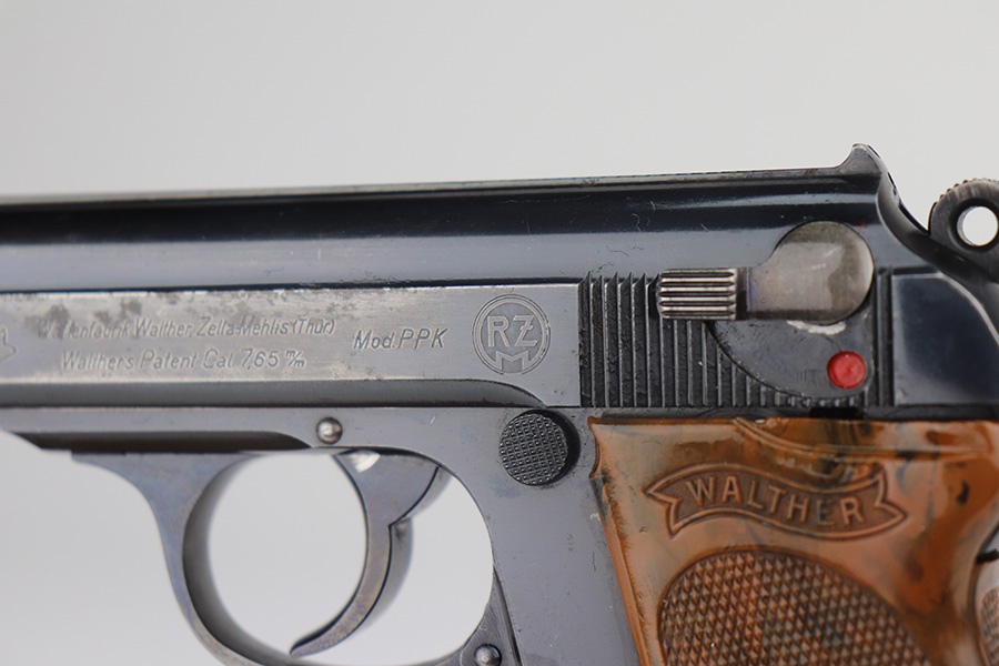 5/20/21 – This is a nice example of an RZM-marked Walther PPK manufactured in 1935. The gun is matching and has the proper “Crown N” proofs. It comes with a proper Walther banner-only magazine and an excellent RZM-marked leather holster. There is an RZM ink stamp on the inside of the bottom flap. The gun has retained roughly 75-80% of its bluing. There is spotty wear and spotty oxidation on the left side of the slide and minor wear around the muzzle. Comes with an excellent brown grip. The bore is excellent – shiny with strong rifling and some very minor freckling in the grooves.