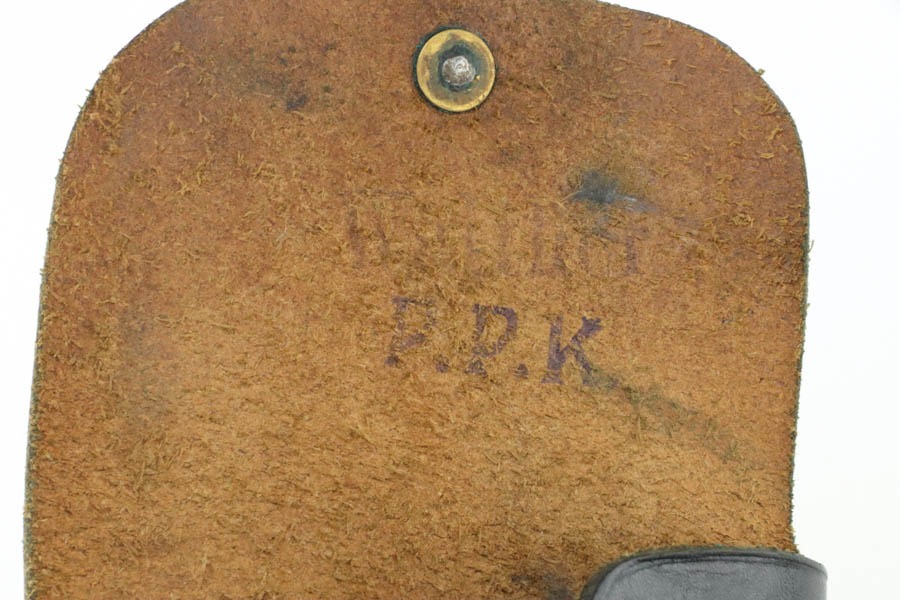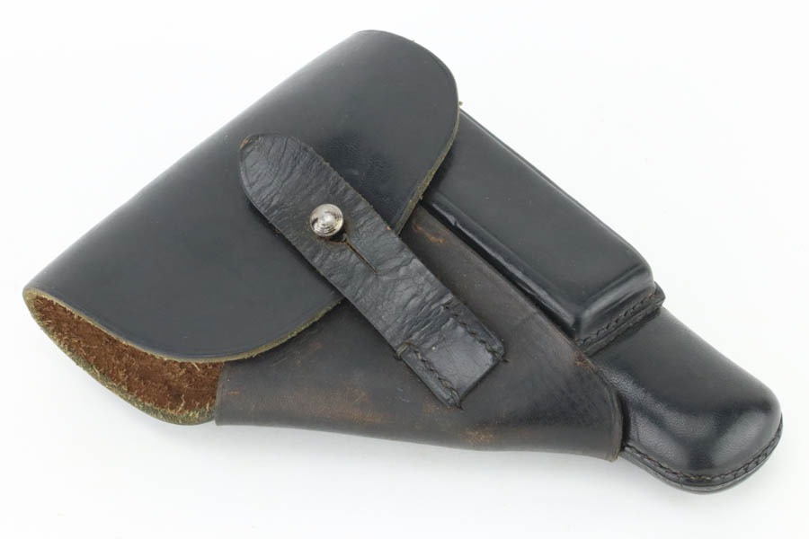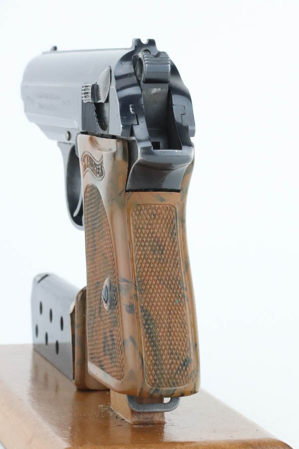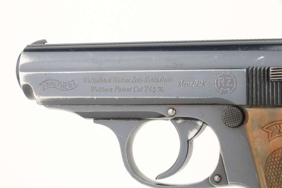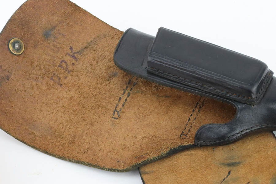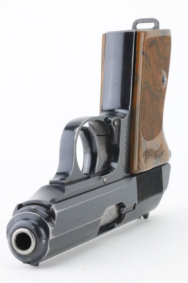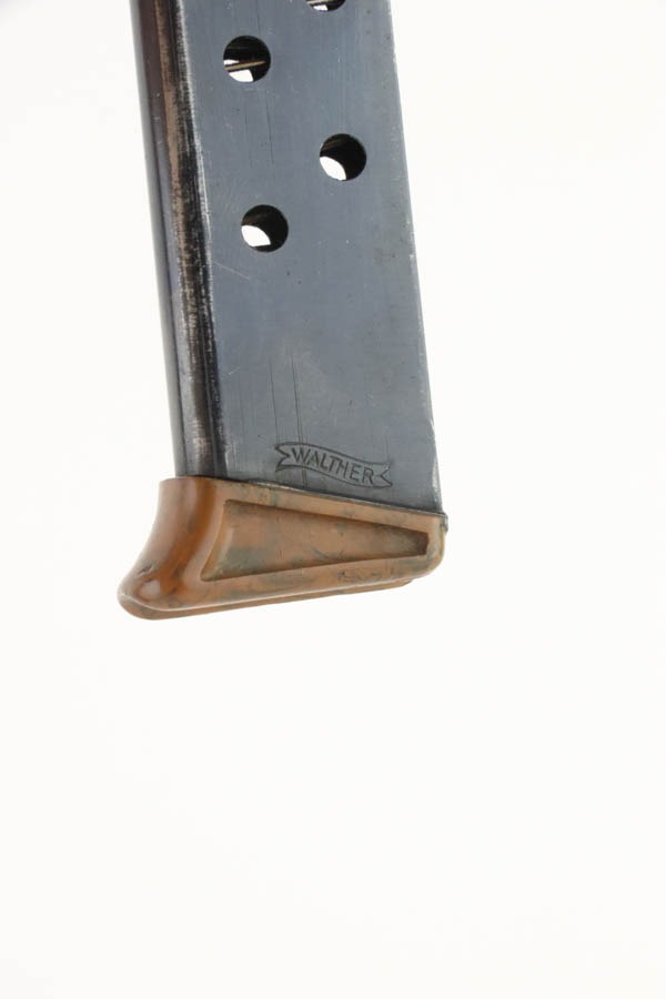 10/7/24 – This is an RZM marked Walther PPK from 1934-35. The RZM (Reichs Zeug Meisterei) was the equipment office of the NSDAP and was established to contract for equipment. These pistols were commonly thought to be issued to the German political leaders of the time. This one is all matching and has retained about 93% of its high polish finish – just general high edge wear. Fitted with an excellent brown Walther grip. Excellent bore with great rifling. It comes as a rig with an excellent black leather Akah holster and a finger extension magazine. The hold open does not work properly with this magazine.