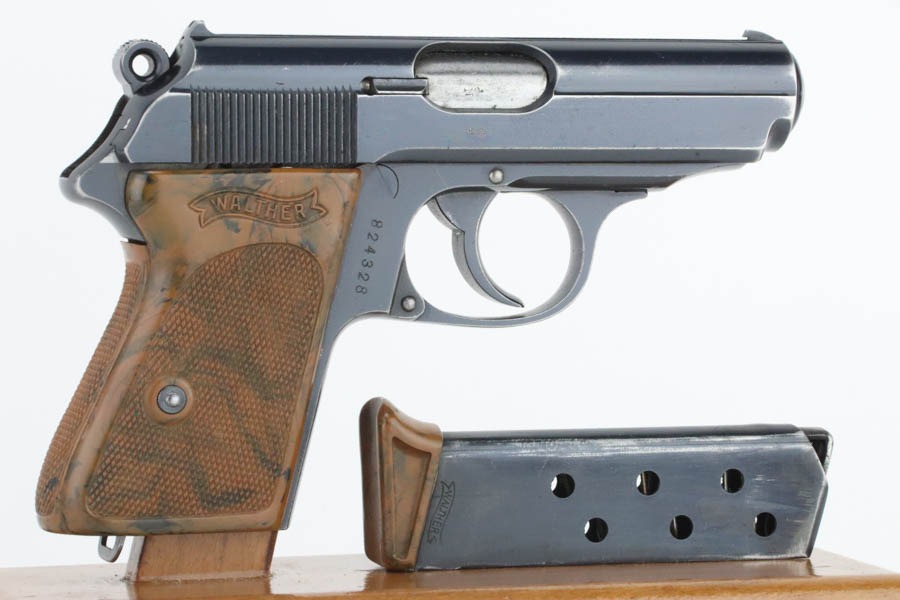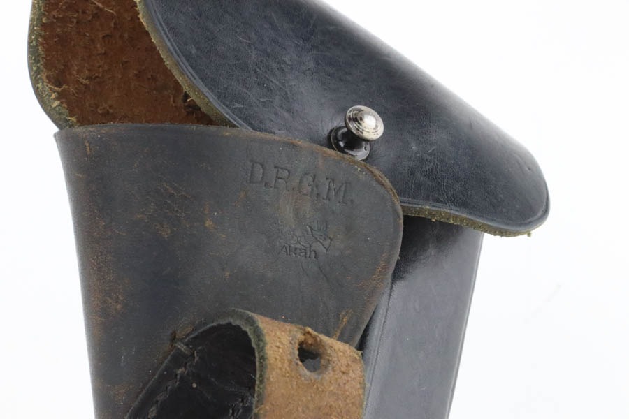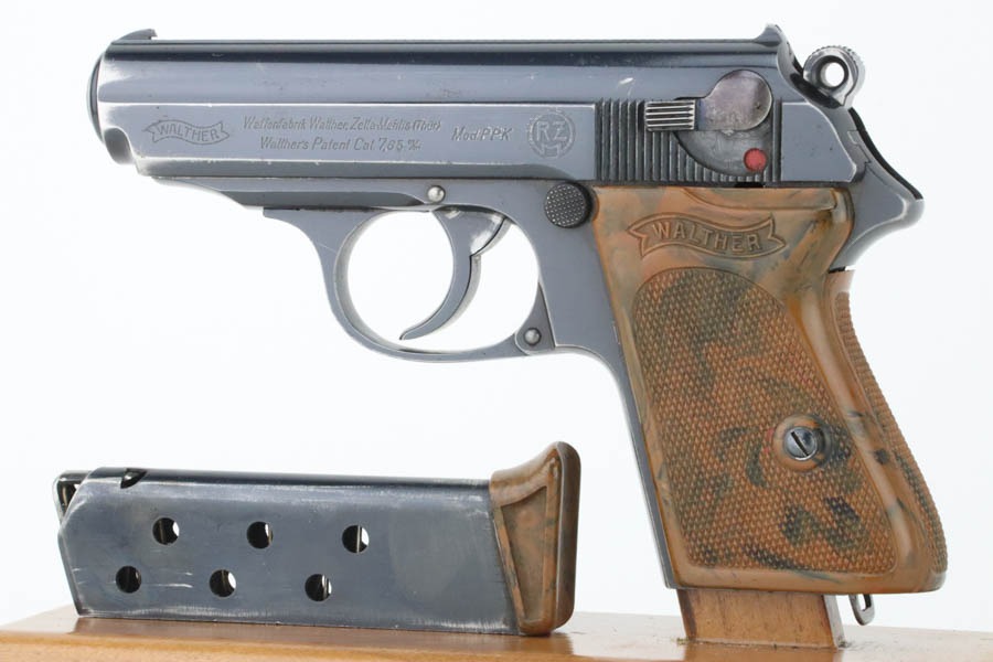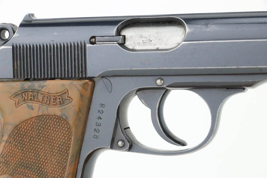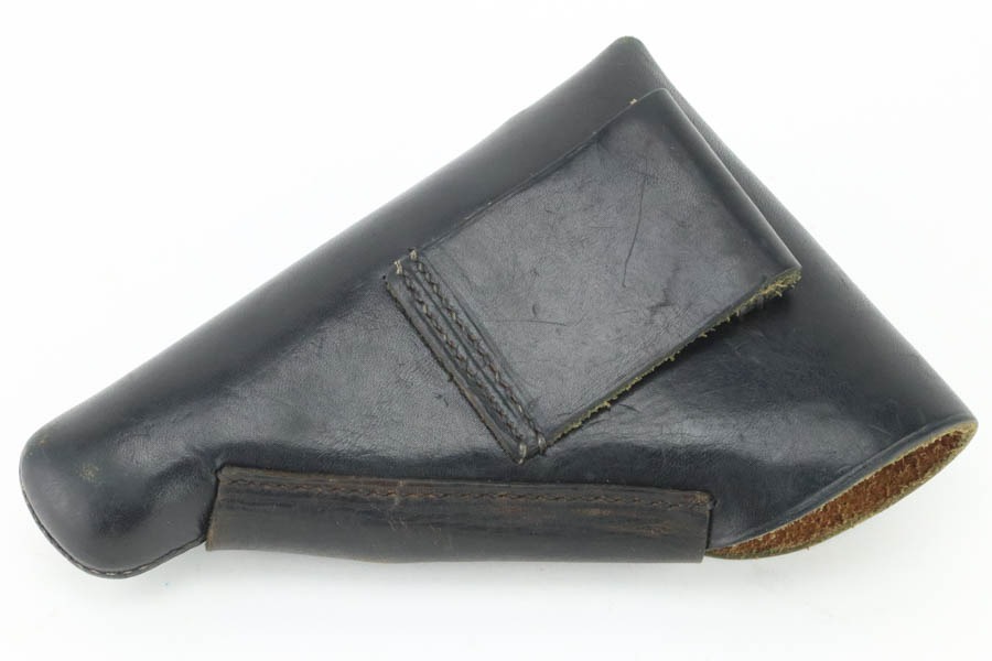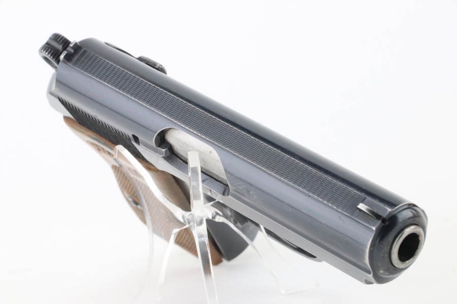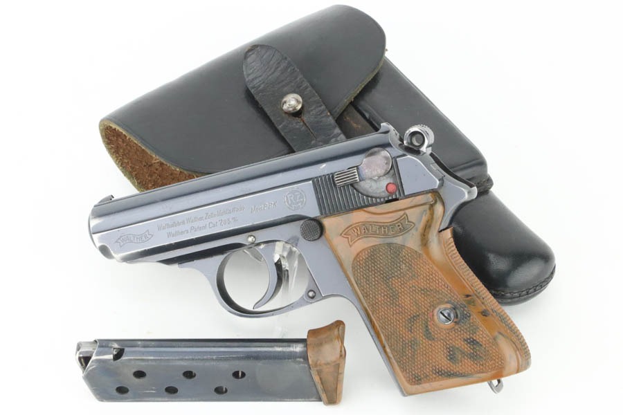 10/7/24 – This is an RZM marked Walther PPK from 1934-35. The RZM (Reichs Zeug Meisterei) was the equipment office of the NSDAP and was established to contract for equipment. These pistols were commonly thought to be issued to the German political leaders of the time. This one is all matching and has retained about 93% of its high polish finish – just general high edge wear. Fitted with an excellent brown Walther grip. Excellent bore with great rifling. It comes as a rig with an excellent black leather Akah holster and a finger extension magazine. The hold open does not work properly with this magazine.