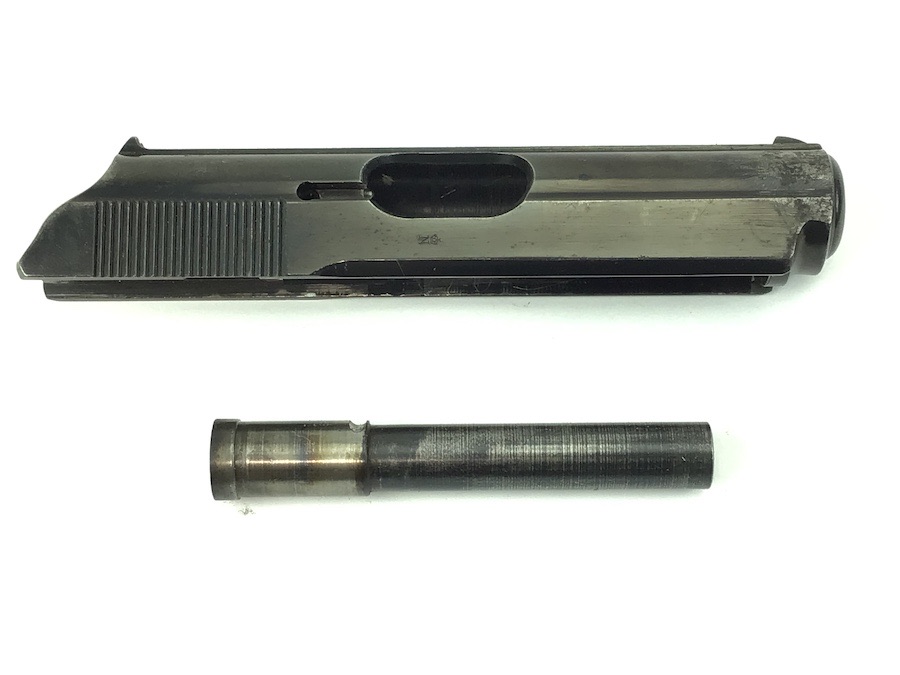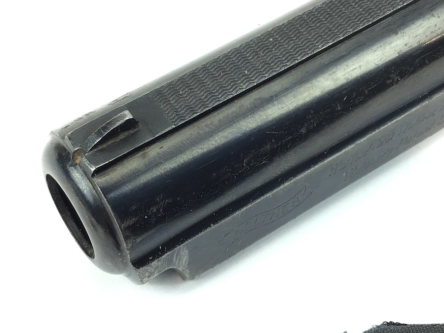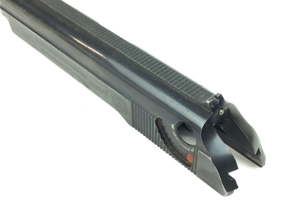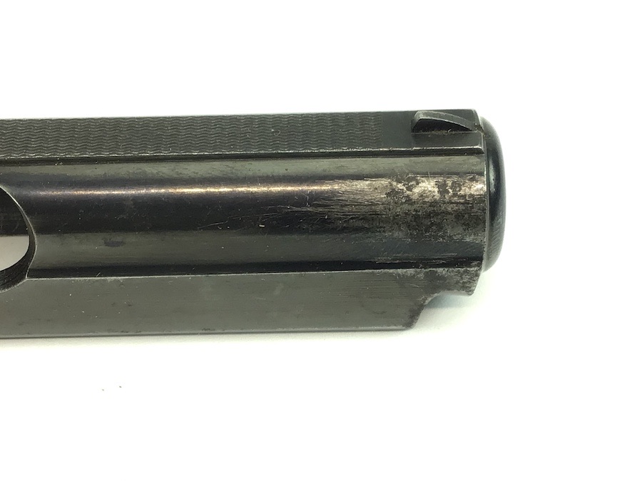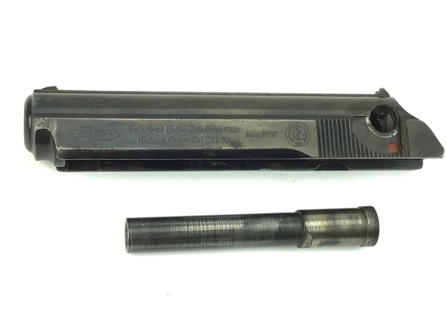 7/14/22 – Original and very good condition. RZM Walther PPK slide and barrel. The bluing rates ~85% with light wear on the high spots. Some speckling and spots of pitting on the muzzle area. Includes the indicator pin. The numerals “346” are etched on the interior of the slide. The barrel is crown N stamped. Bore is fairly clean with good rifling and rates about 8.5 of 10.