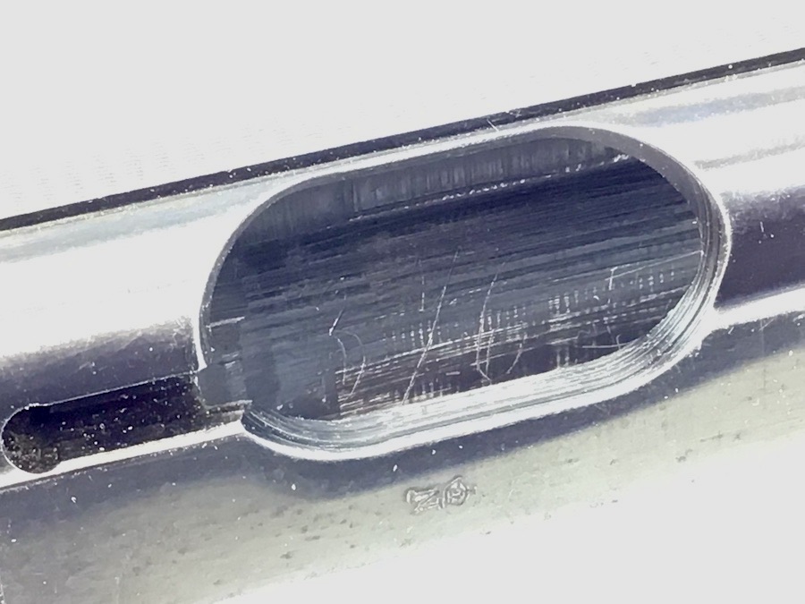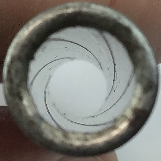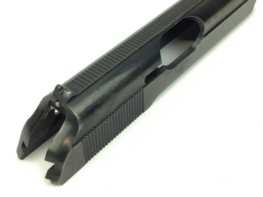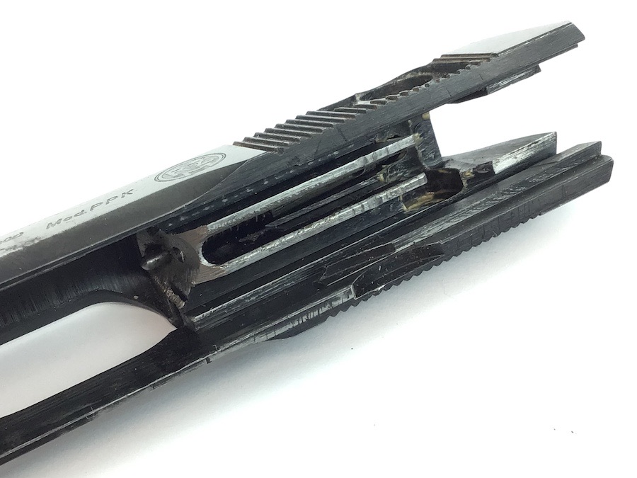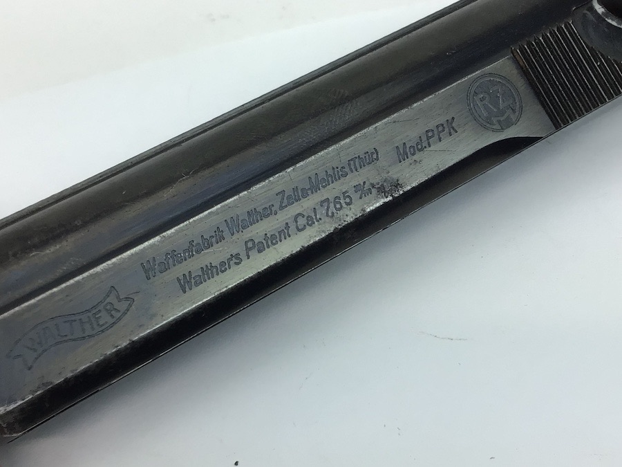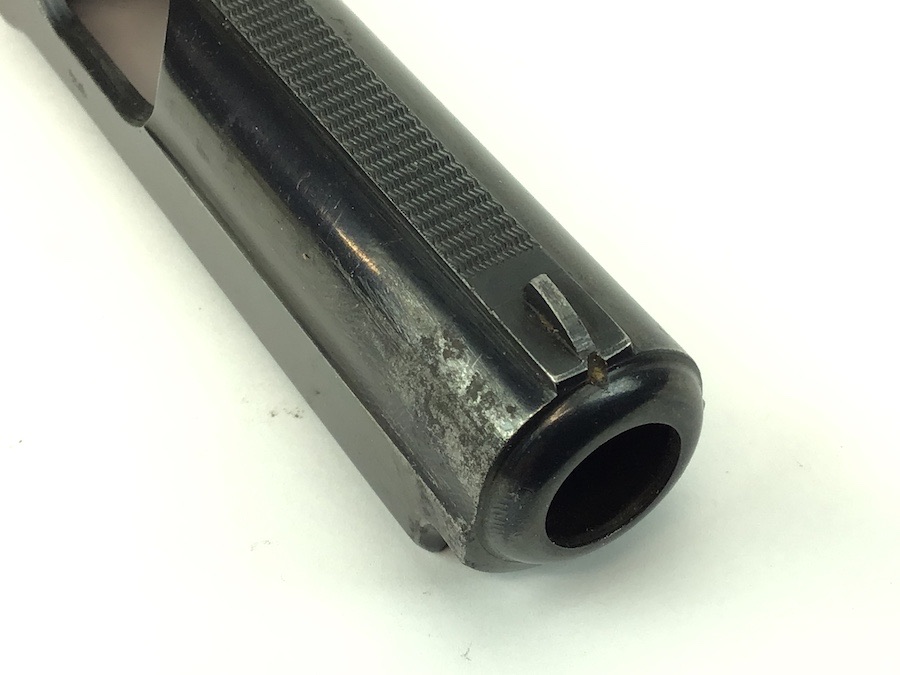 7/14/22 – Original and very good condition. RZM Walther PPK slide and barrel. The bluing rates ~85% with light wear on the high spots. Some speckling and spots of pitting on the muzzle area. Includes the indicator pin. The numerals “346” are etched on the interior of the slide. The barrel is crown N stamped. Bore is fairly clean with good rifling and rates about 8.5 of 10.
