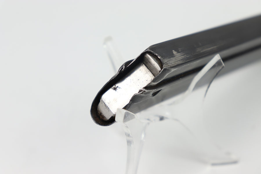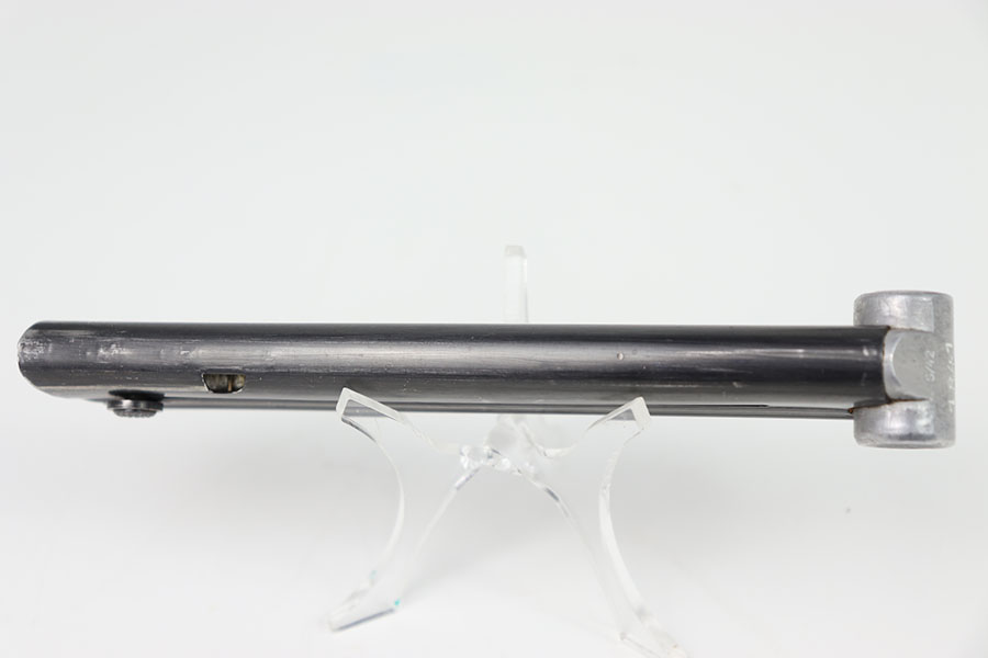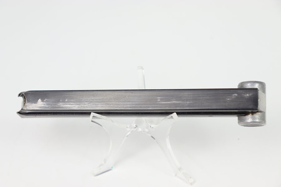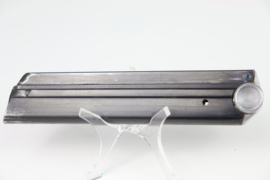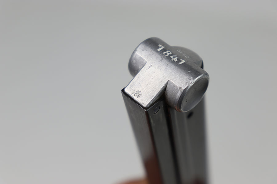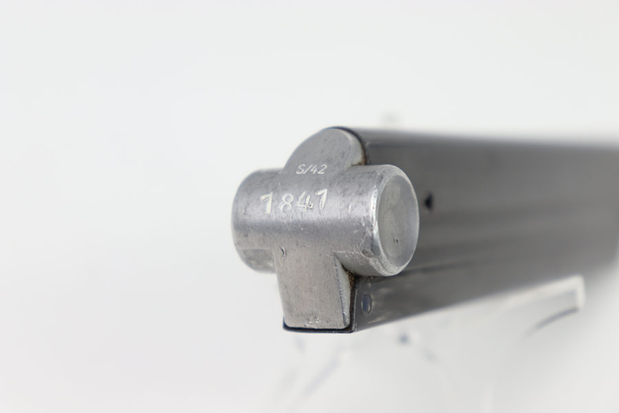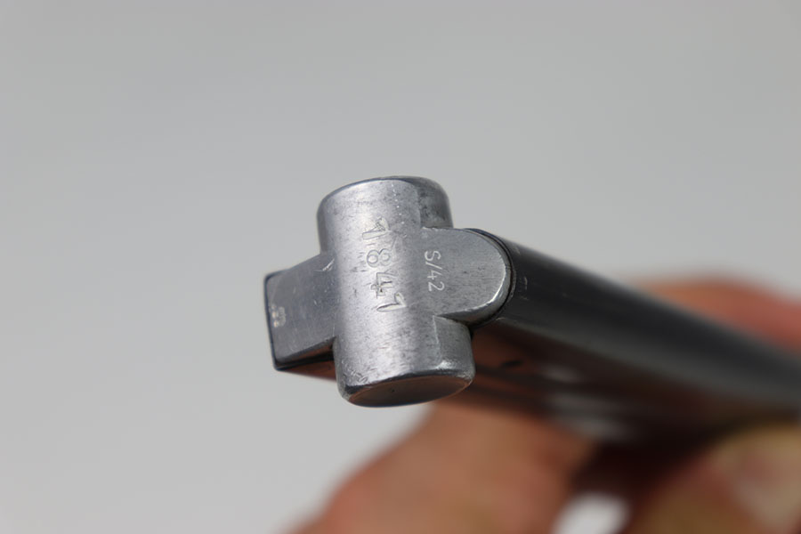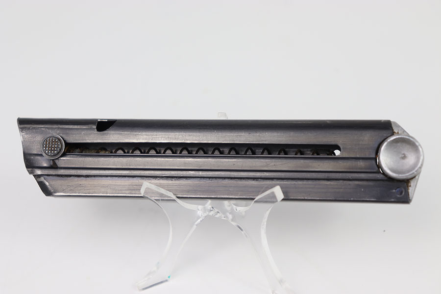 8/7/24 – This is a rare variation, early field replacement Luger magazine from WW2. The magazine has a blued tube and aluminum base. The base is stamped “S/42” and has a droop winged eagle 63 proof stamp. There is a serial number, which was likely added to match a gun. The blued tube has mild finish loss mainly on the spine. The spring is strong and smooth with no issues.