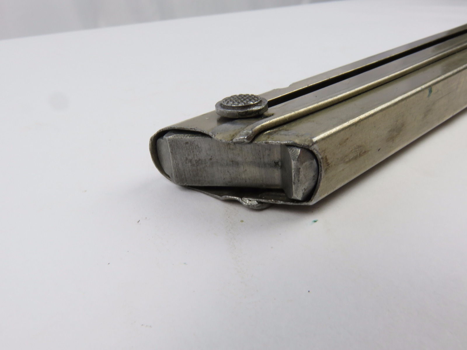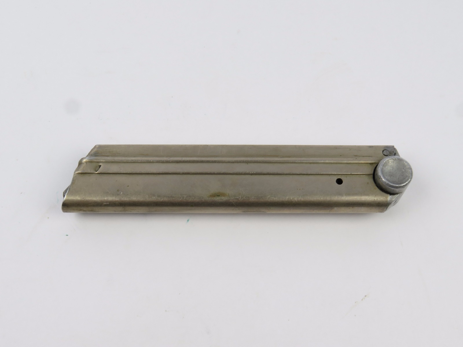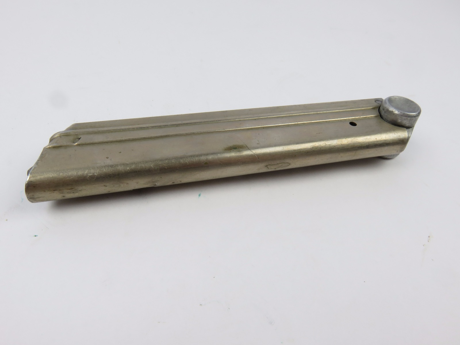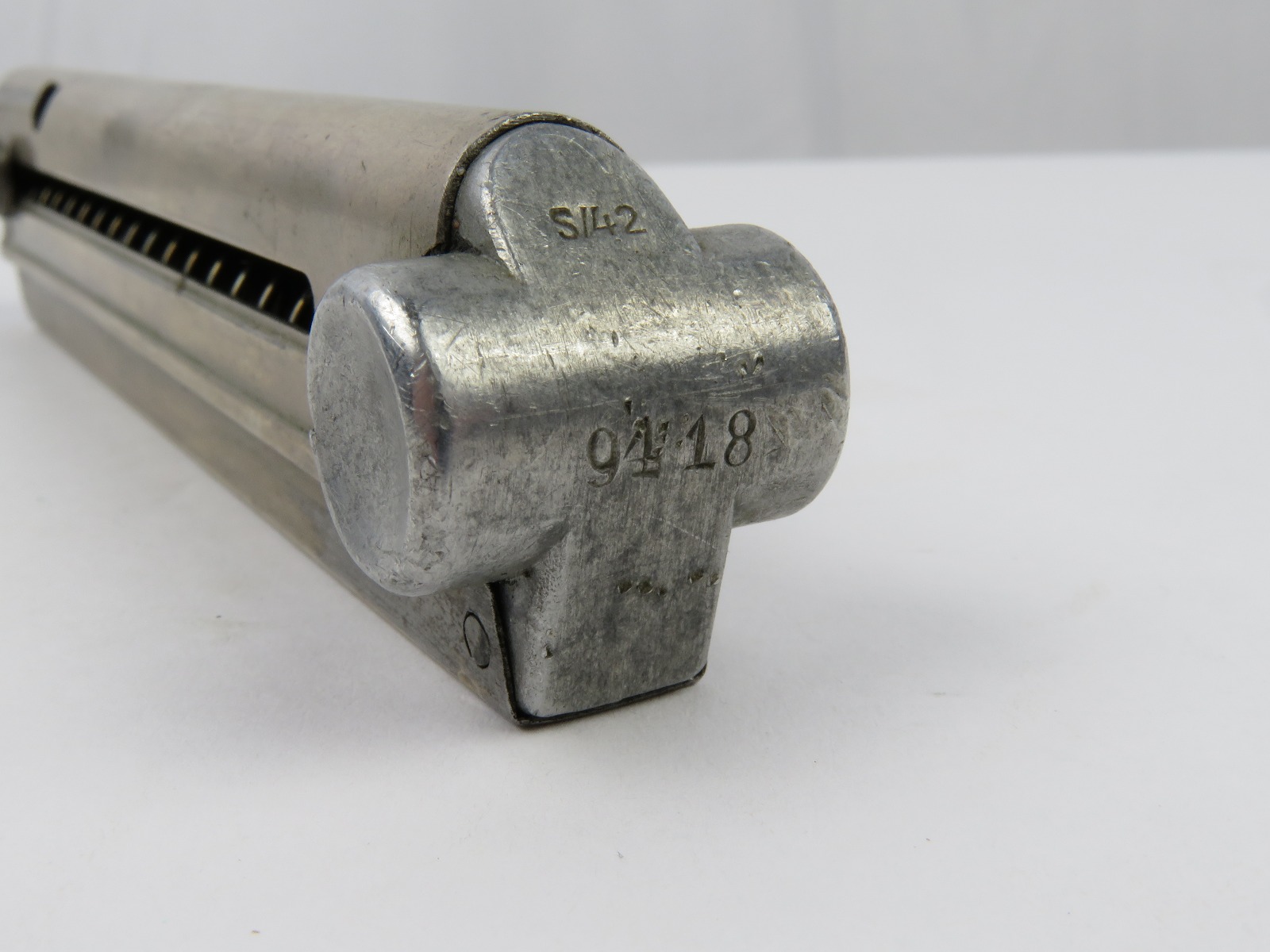 7/18/17 – This is an original WW2 Mauser S/42 stamped Luger magazine. The magazine has an aluminum frame that was never blued (earlier variation), and an aluminum base that is stamped “S/42” as well as serial numbered “9418”. The magazine frame has some minor discoloration throughout, but this is all normal wear. There is no rust or pitting. The spring is firm, and pushes down with strong resistance, but should still function properly especially after a little oiling. The base is in excellent condition. Guaranteed original.