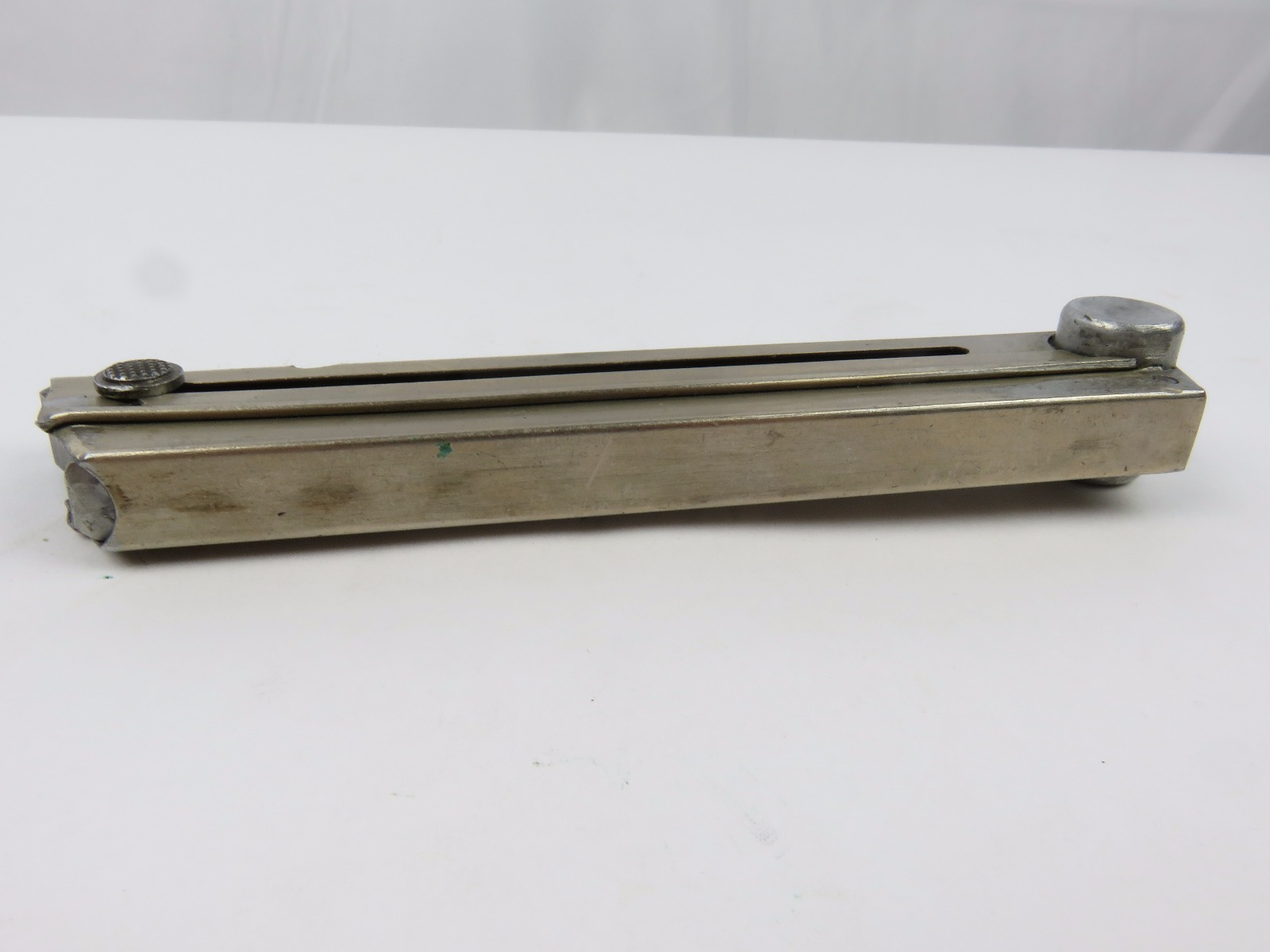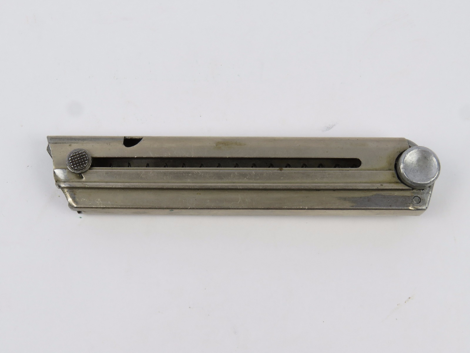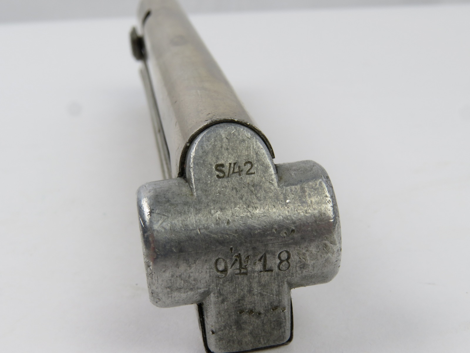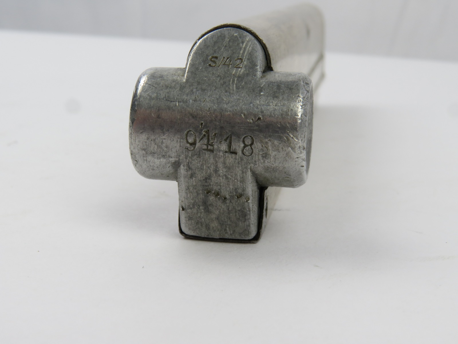 7/18/17 – This is an original WW2 Mauser S/42 stamped Luger magazine. The magazine has an aluminum frame that was never blued (earlier variation), and an aluminum base that is stamped “S/42” as well as serial numbered “9418”. The magazine frame has some minor discoloration throughout, but this is all normal wear. There is no rust or pitting. The spring is firm, and pushes down with strong resistance, but should still function properly especially after a little oiling. The base is in excellent condition. Guaranteed original.