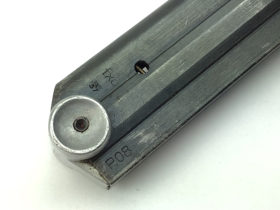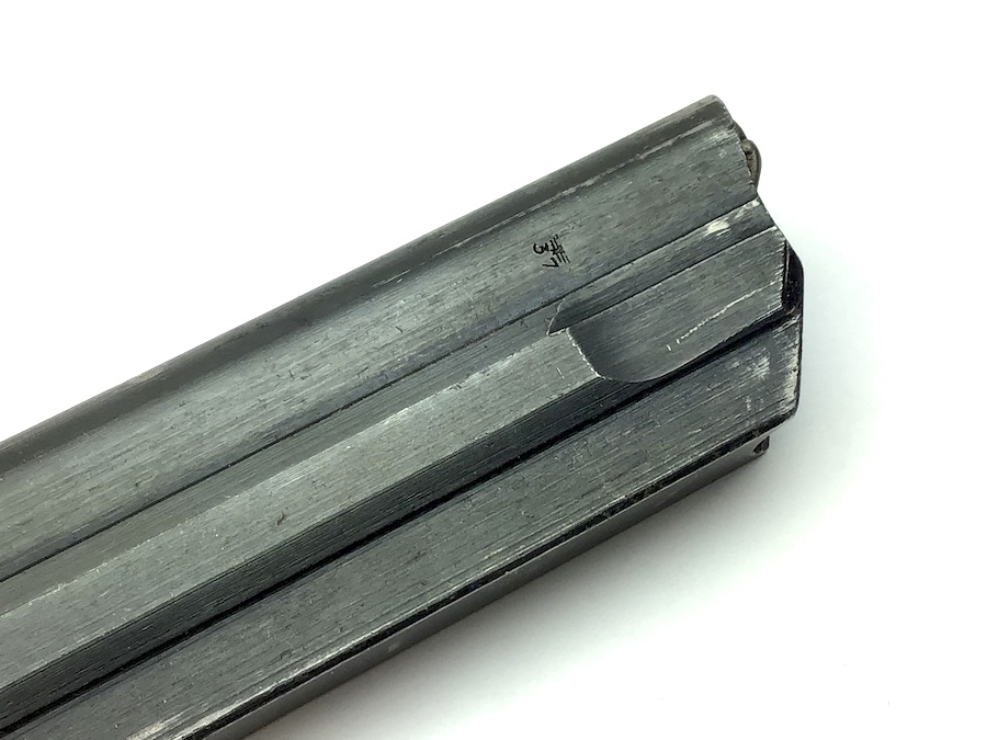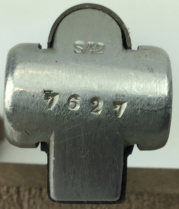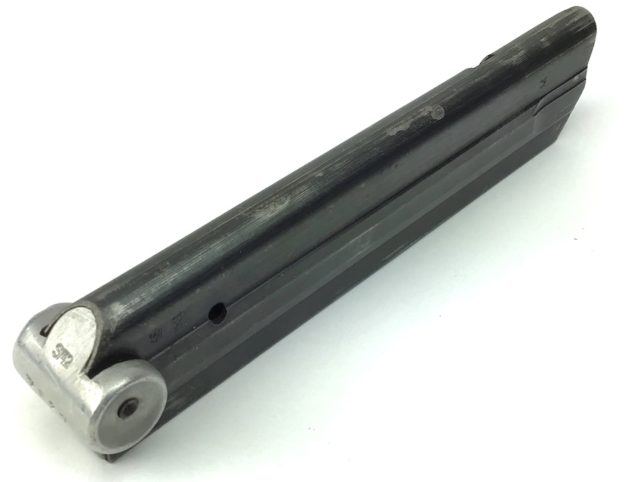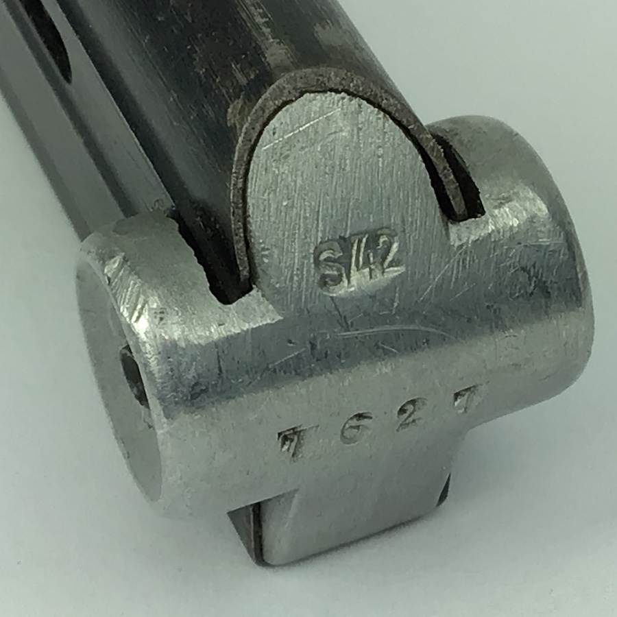 1/25/21 – Original and great condition S/42 replacement Luger Magazine. FXO maker stamped along with Eagle / 37 on the tube. Serial number “7627” stamped on the base as well as A distinct “S/42”. The S/42 area appears to have been ground prior to being stamped. However, the stamp appears authentic. Strong functional spring.