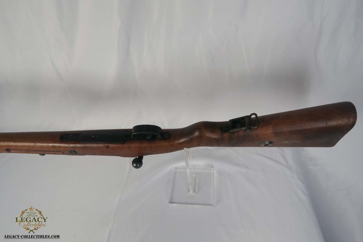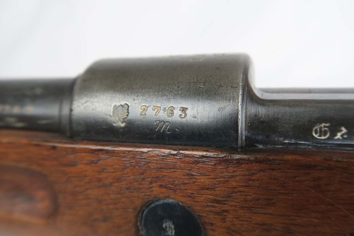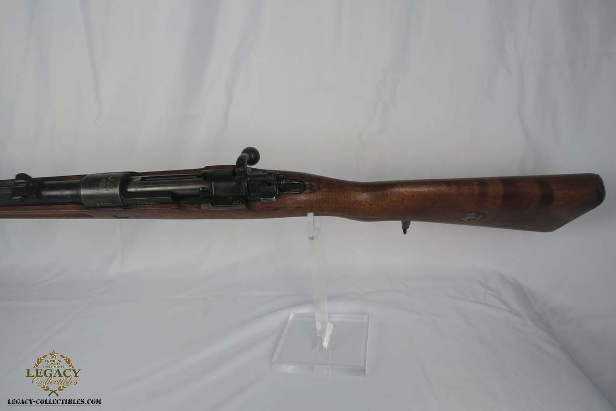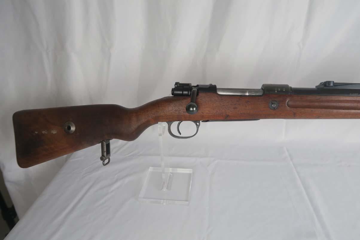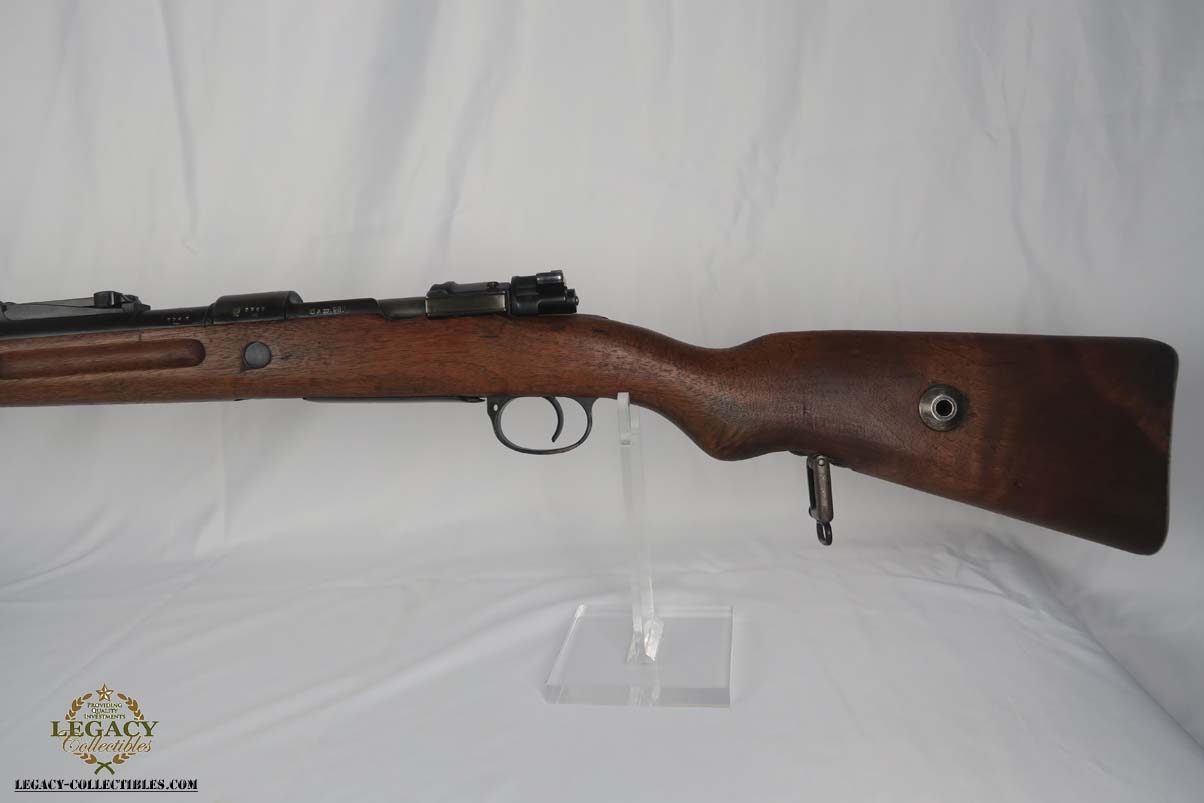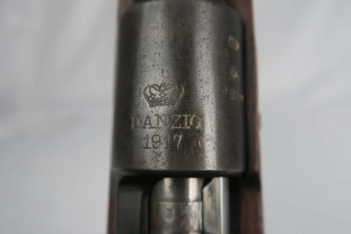 5/5/17 – This is an original WW2 rework of a WW1 production Gewehr rifle. The receiver is stamped with imperial proof markings along with a large crown and “DANZIG 1917” underneath. The right side of the rifle receiver is stamped “S/42K” with early 1930s proof stamps. Some of the parts, like the bolt safety, are not matching in serial number, but this is due to the reworking of the rifle after WW1. The bolt, receiver, and magazine base plate are all matching serial numbered. The rifle is in great shape with no areas of rust or pitting, but there is some surface wear throughout the blued portions of the rifle. The worst wear is on the receiver where most of the bluing is worn. The magazine base plate and barrel are in great shape though with minimal wear. The bore is rated at 5/10 with residue throughout the interior of the bore. This is the original bore though, and could probably clean out nicely. The wooden stock appears unsanded with highlighted imperial proof stamps on the right side. Guaranteed original.
