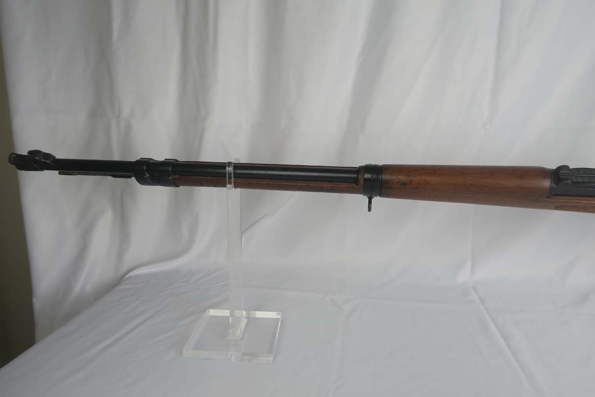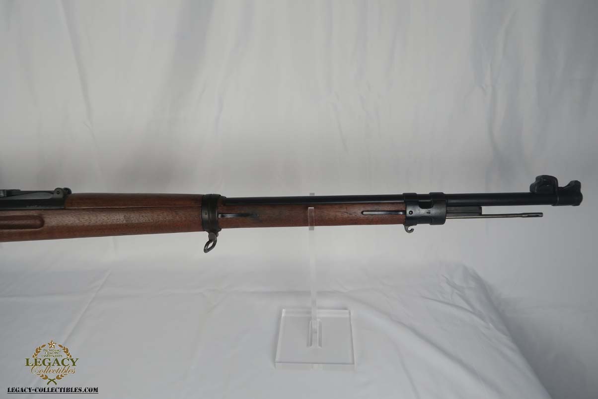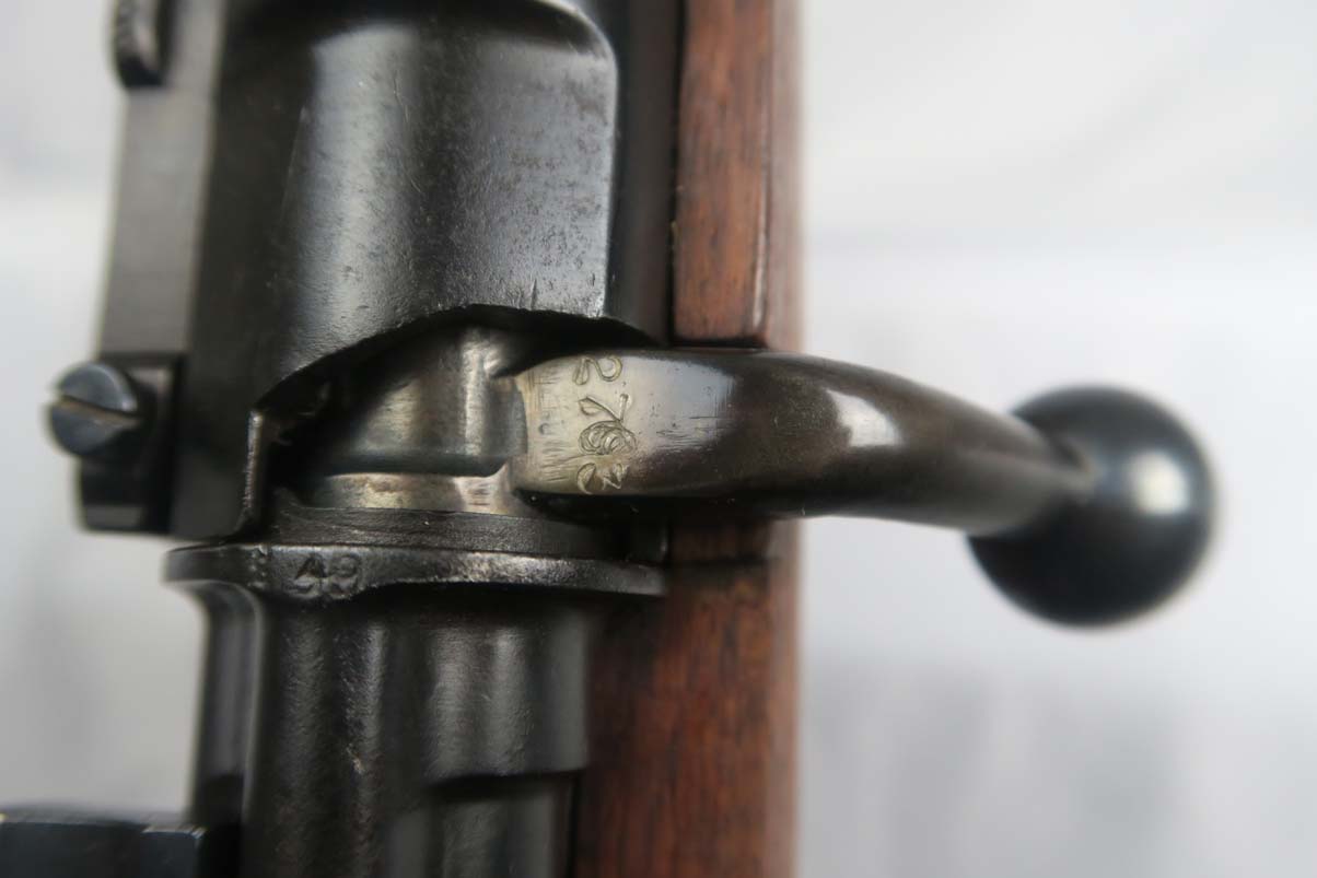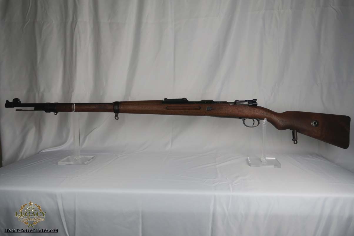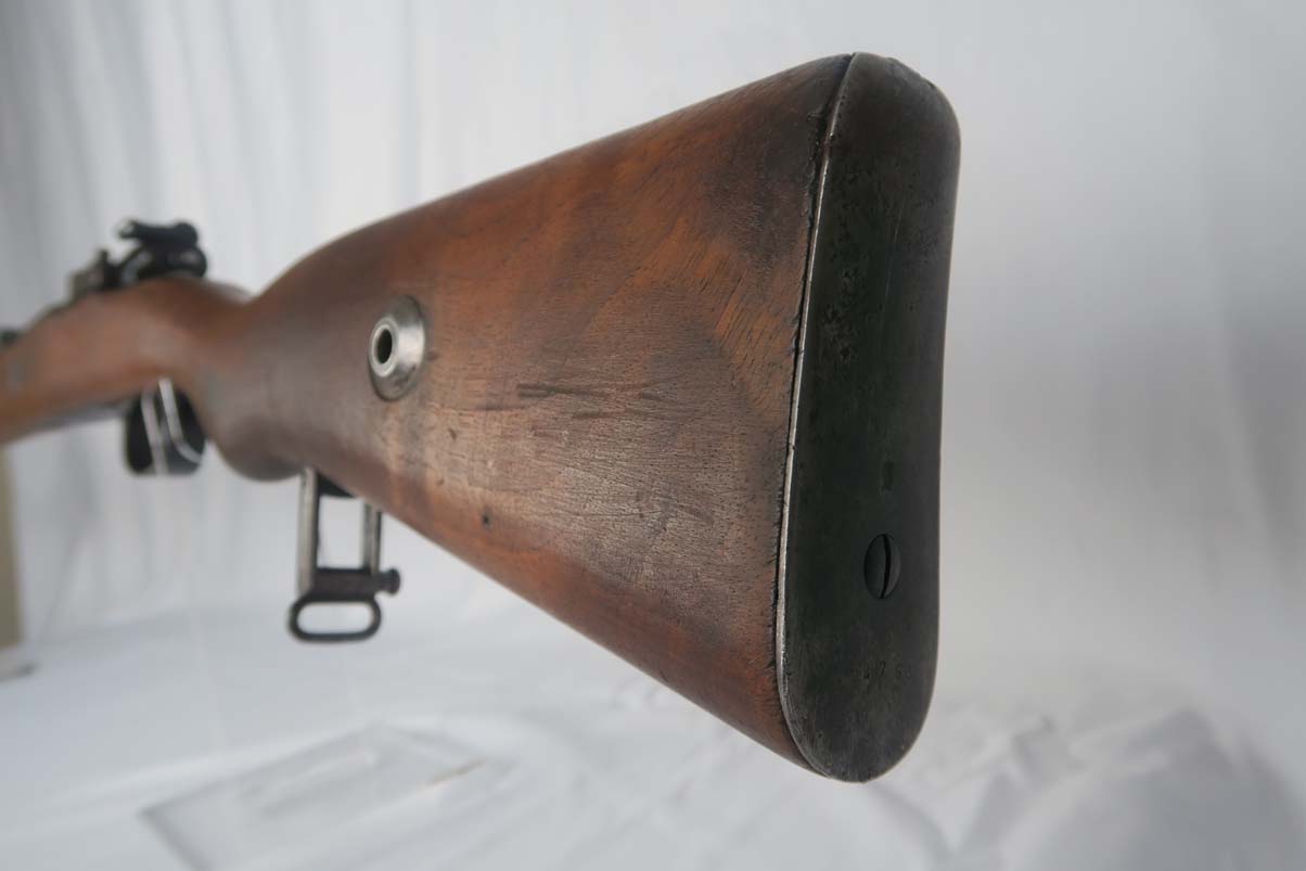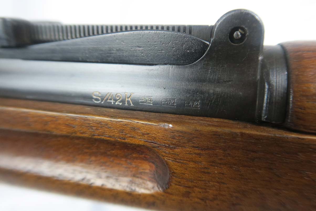 5/5/17 – This is an original WW2 rework of a WW1 production Gewehr rifle. The receiver is stamped with imperial proof markings along with a large crown and “DANZIG 1917” underneath. The right side of the rifle receiver is stamped “S/42K” with early 1930s proof stamps. Some of the parts, like the bolt safety, are not matching in serial number, but this is due to the reworking of the rifle after WW1. The bolt, receiver, and magazine base plate are all matching serial numbered. The rifle is in great shape with no areas of rust or pitting, but there is some surface wear throughout the blued portions of the rifle. The worst wear is on the receiver where most of the bluing is worn. The magazine base plate and barrel are in great shape though with minimal wear. The bore is rated at 5/10 with residue throughout the interior of the bore. This is the original bore though, and could probably clean out nicely. The wooden stock appears unsanded with highlighted imperial proof stamps on the right side. Guaranteed original.