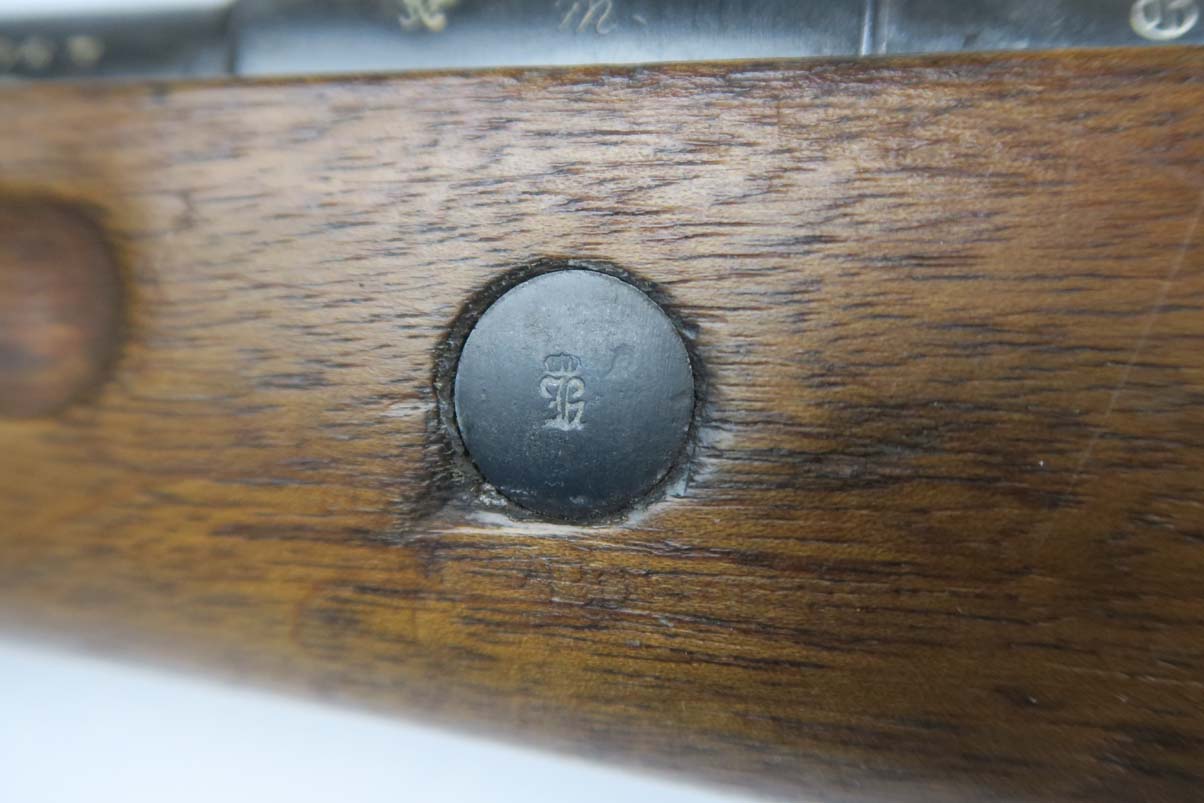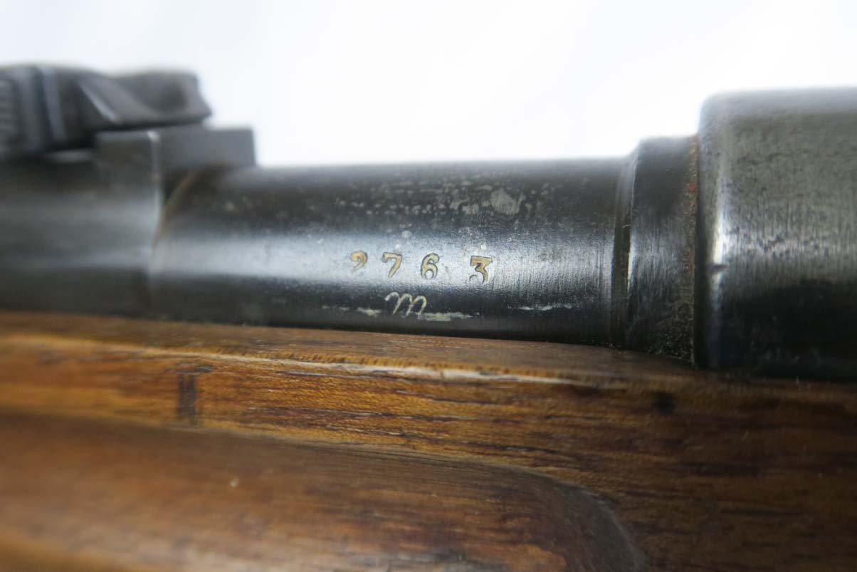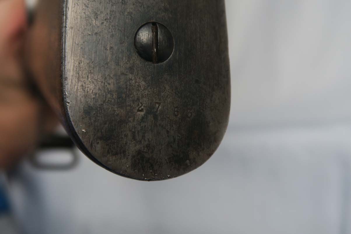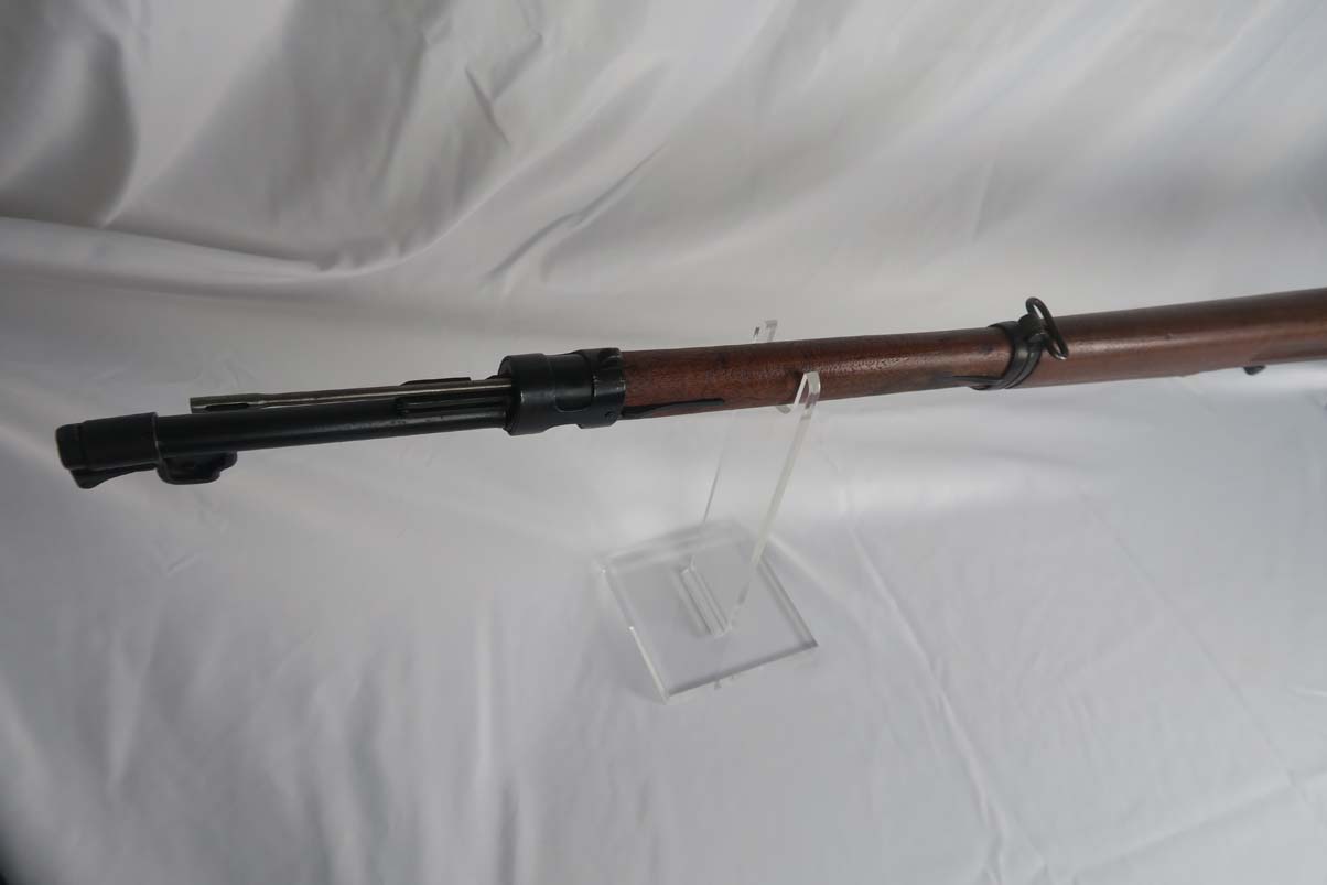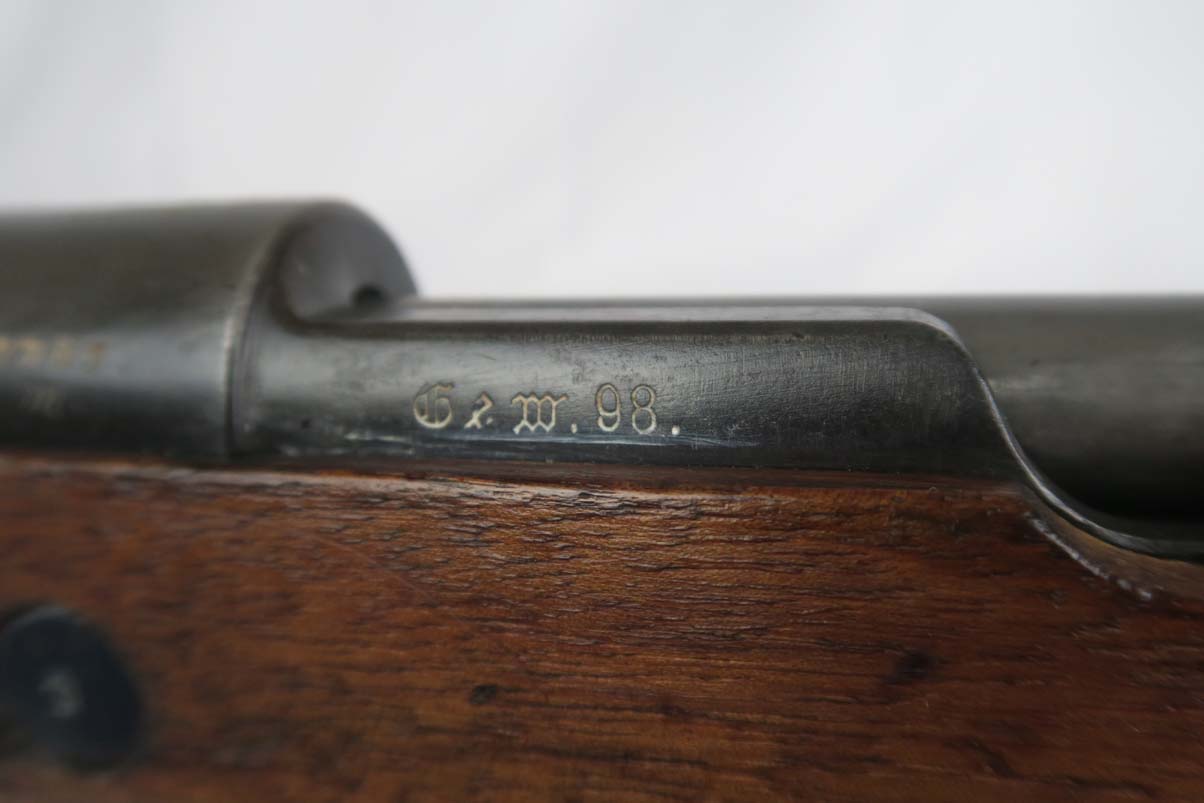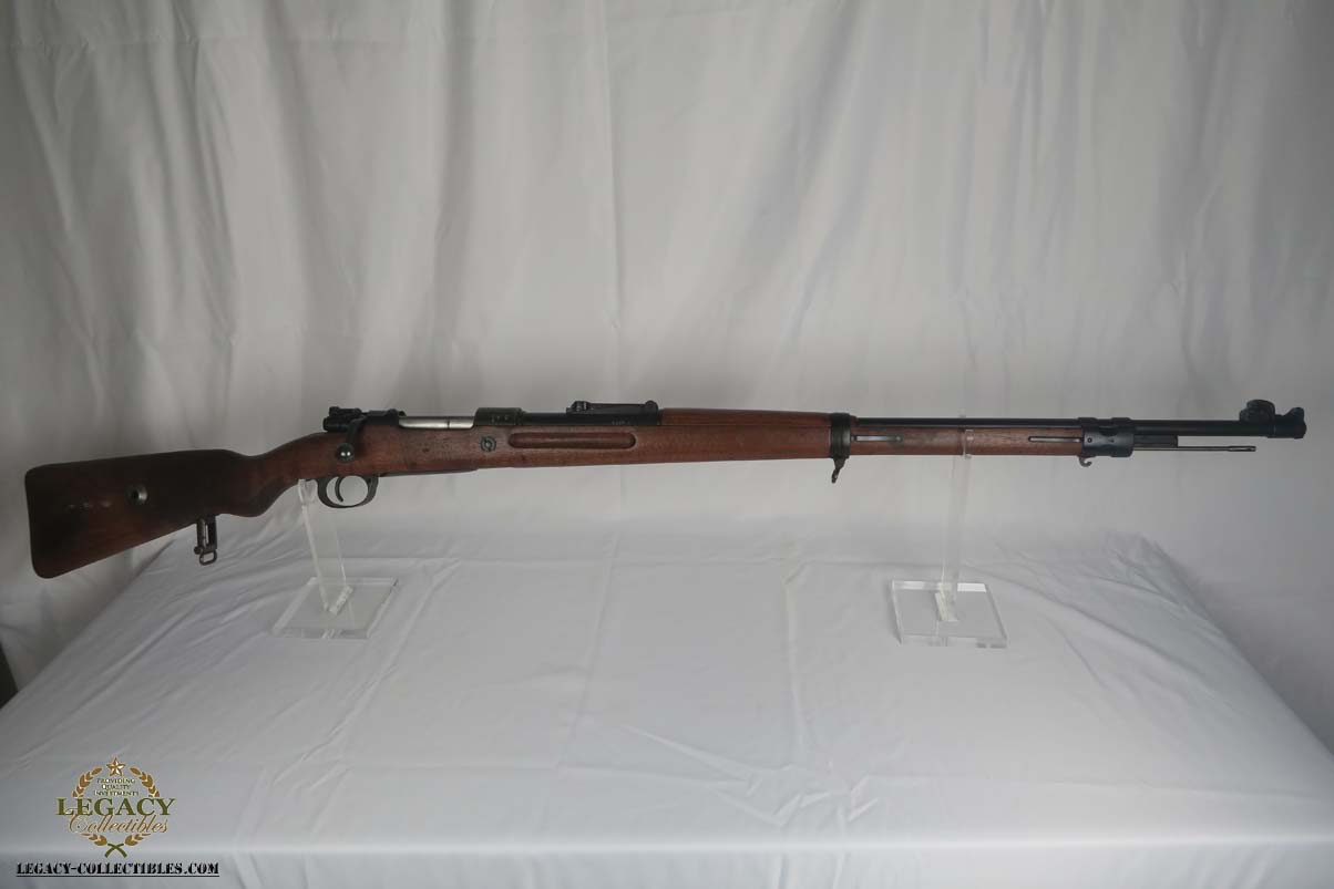 5/5/17 – This is an original WW2 rework of a WW1 production Gewehr rifle. The receiver is stamped with imperial proof markings along with a large crown and “DANZIG 1917” underneath. The right side of the rifle receiver is stamped “S/42K” with early 1930s proof stamps. Some of the parts, like the bolt safety, are not matching in serial number, but this is due to the reworking of the rifle after WW1. The bolt, receiver, and magazine base plate are all matching serial numbered. The rifle is in great shape with no areas of rust or pitting, but there is some surface wear throughout the blued portions of the rifle. The worst wear is on the receiver where most of the bluing is worn. The magazine base plate and barrel are in great shape though with minimal wear. The bore is rated at 5/10 with residue throughout the interior of the bore. This is the original bore though, and could probably clean out nicely. The wooden stock appears unsanded with highlighted imperial proof stamps on the right side. Guaranteed original.