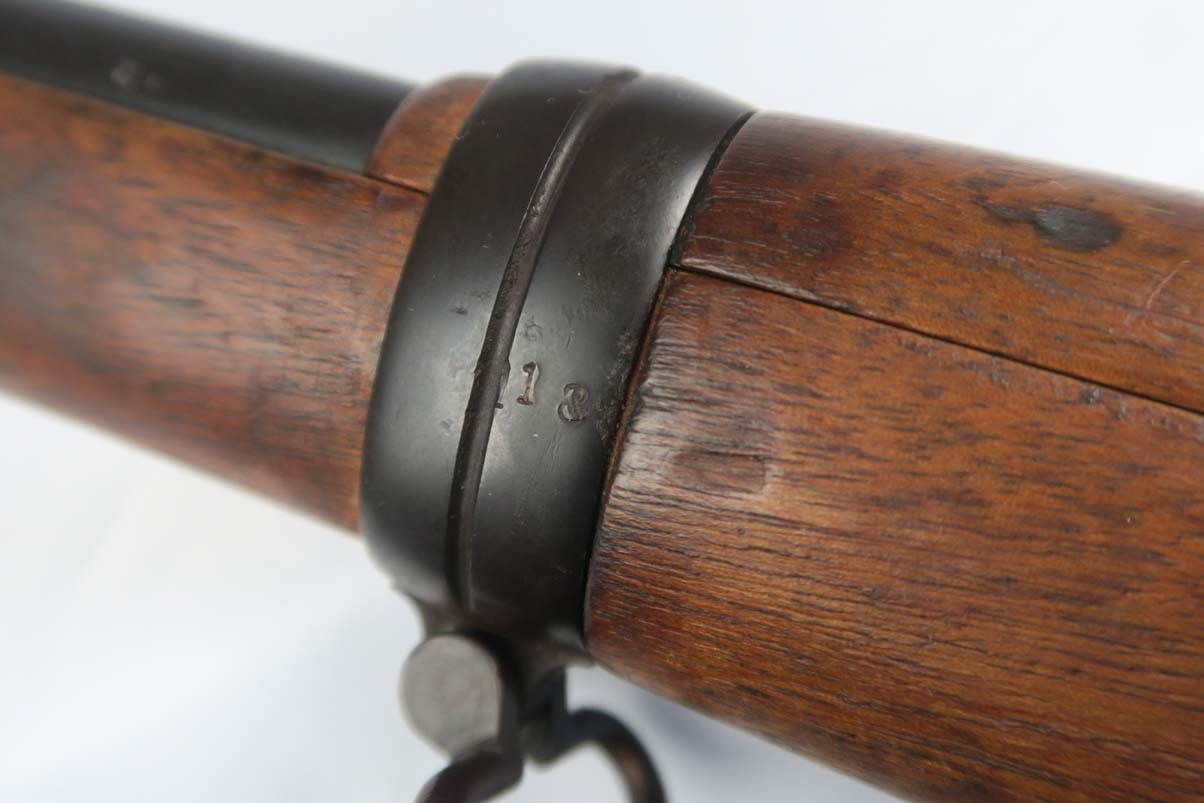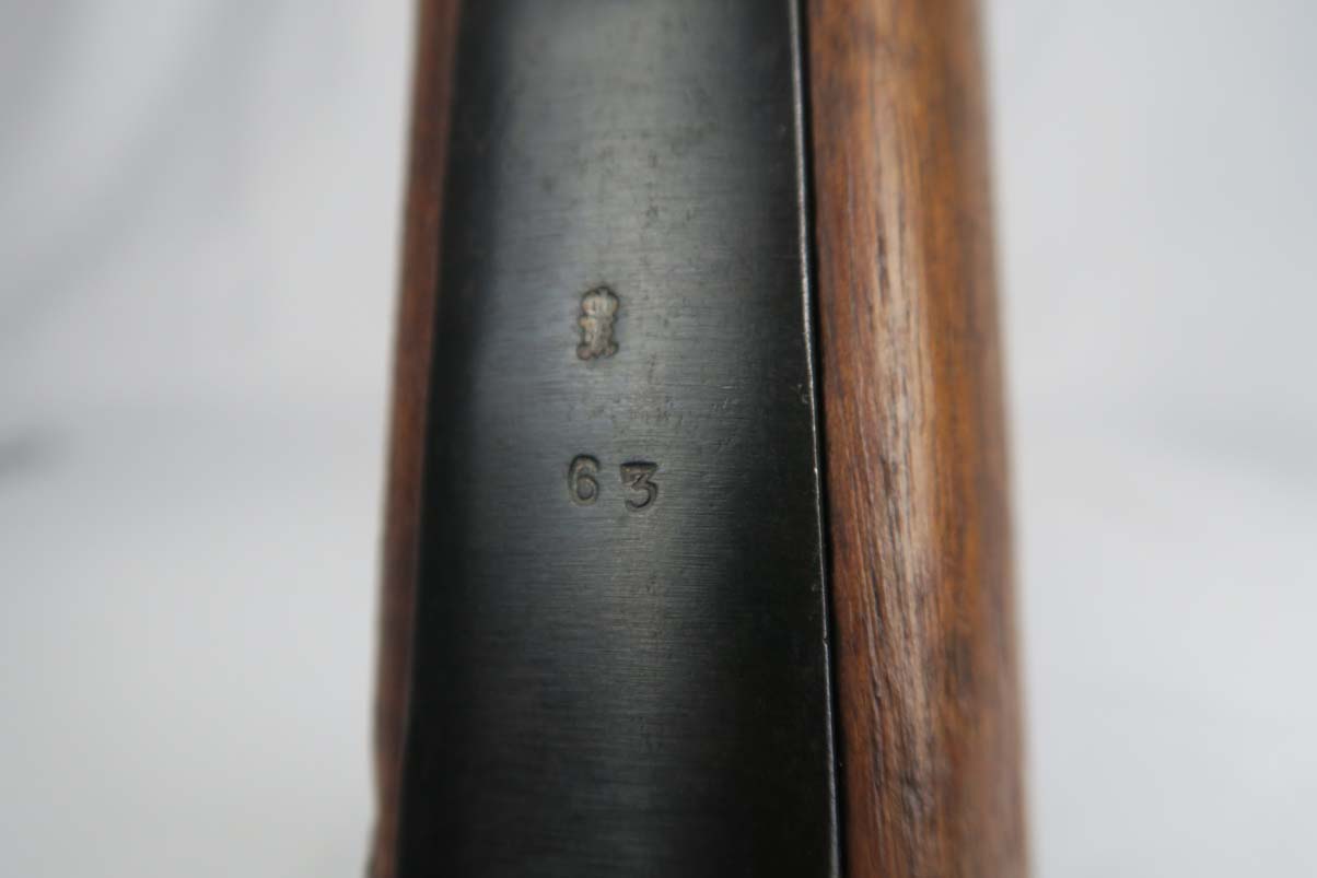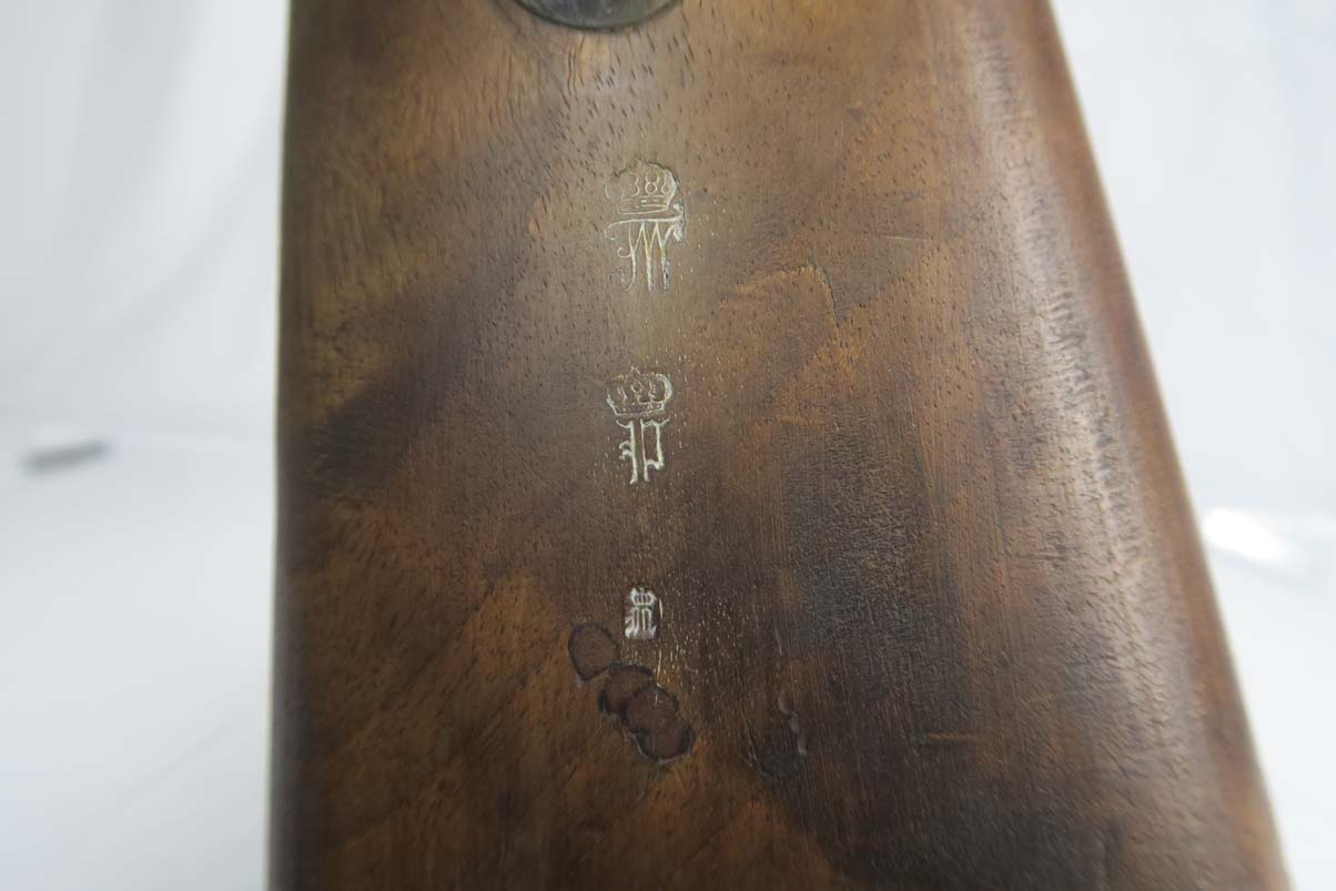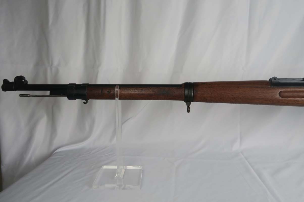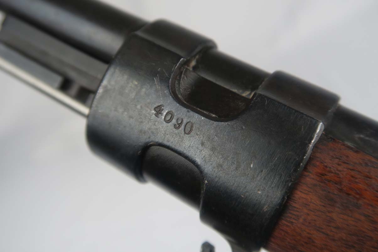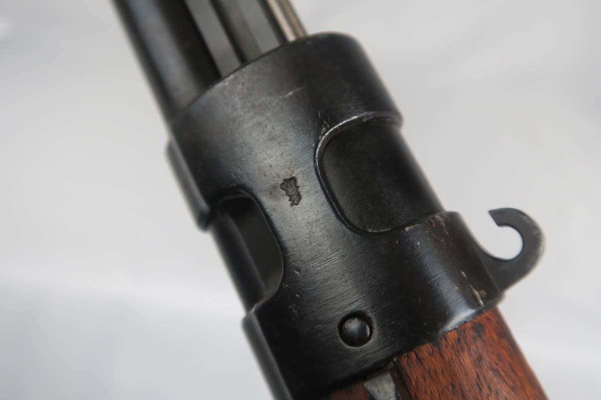 5/5/17 – This is an original WW2 rework of a WW1 production Gewehr rifle. The receiver is stamped with imperial proof markings along with a large crown and “DANZIG 1917” underneath. The right side of the rifle receiver is stamped “S/42K” with early 1930s proof stamps. Some of the parts, like the bolt safety, are not matching in serial number, but this is due to the reworking of the rifle after WW1. The bolt, receiver, and magazine base plate are all matching serial numbered. The rifle is in great shape with no areas of rust or pitting, but there is some surface wear throughout the blued portions of the rifle. The worst wear is on the receiver where most of the bluing is worn. The magazine base plate and barrel are in great shape though with minimal wear. The bore is rated at 5/10 with residue throughout the interior of the bore. This is the original bore though, and could probably clean out nicely. The wooden stock appears unsanded with highlighted imperial proof stamps on the right side. Guaranteed original.