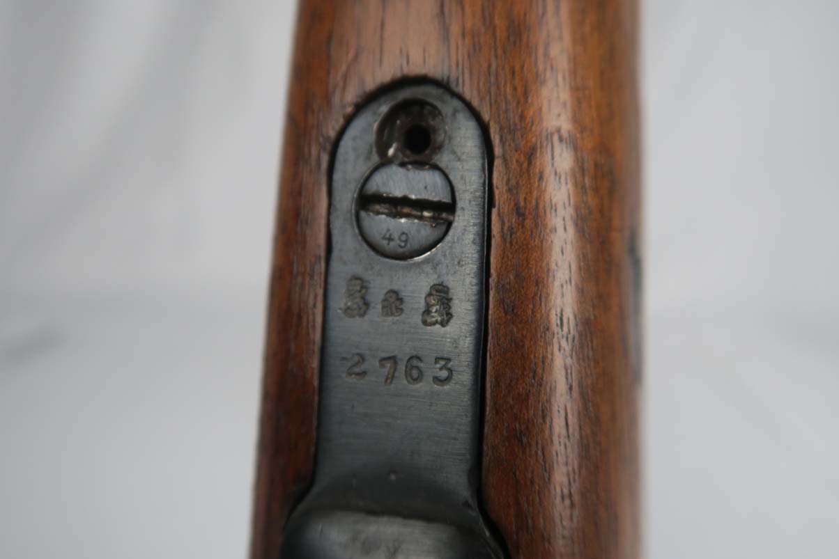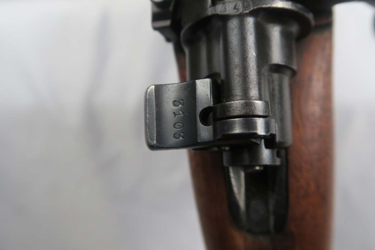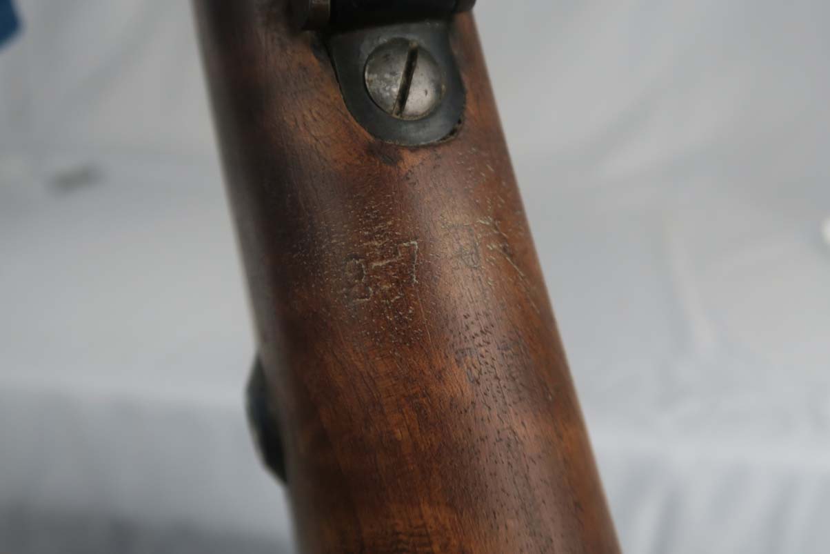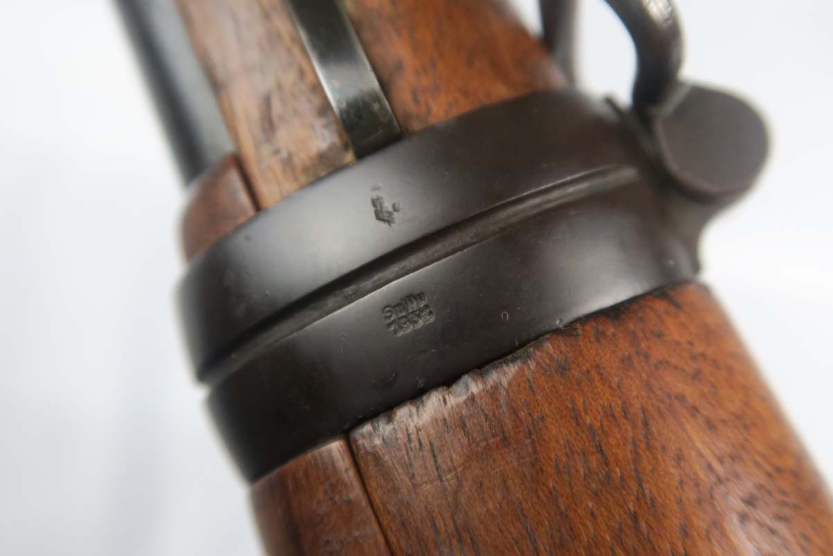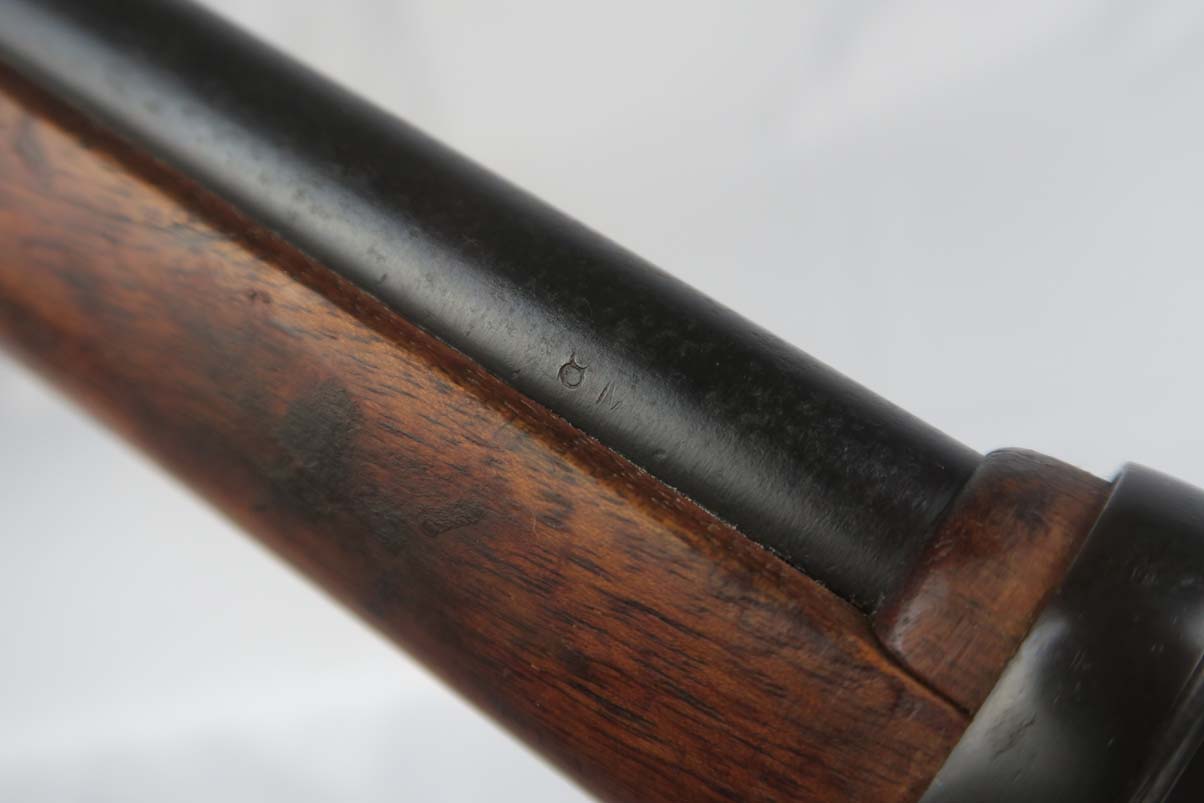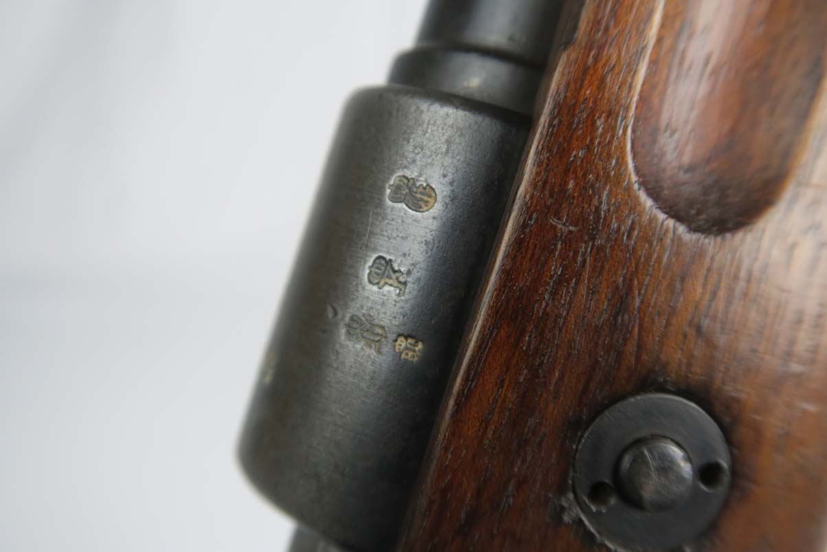 5/5/17 – This is an original WW2 rework of a WW1 production Gewehr rifle. The receiver is stamped with imperial proof markings along with a large crown and “DANZIG 1917” underneath. The right side of the rifle receiver is stamped “S/42K” with early 1930s proof stamps. Some of the parts, like the bolt safety, are not matching in serial number, but this is due to the reworking of the rifle after WW1. The bolt, receiver, and magazine base plate are all matching serial numbered. The rifle is in great shape with no areas of rust or pitting, but there is some surface wear throughout the blued portions of the rifle. The worst wear is on the receiver where most of the bluing is worn. The magazine base plate and barrel are in great shape though with minimal wear. The bore is rated at 5/10 with residue throughout the interior of the bore. This is the original bore though, and could probably clean out nicely. The wooden stock appears unsanded with highlighted imperial proof stamps on the right side. Guaranteed original.