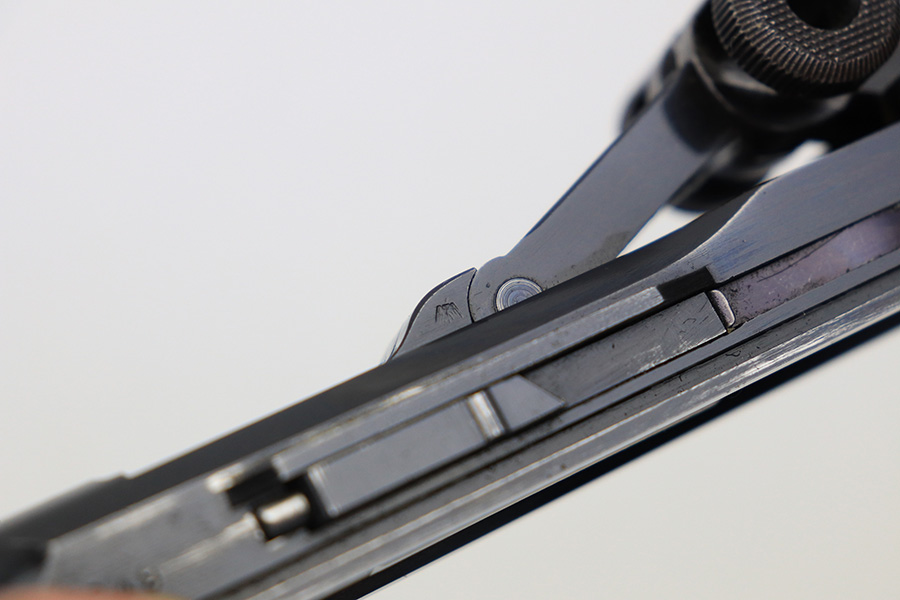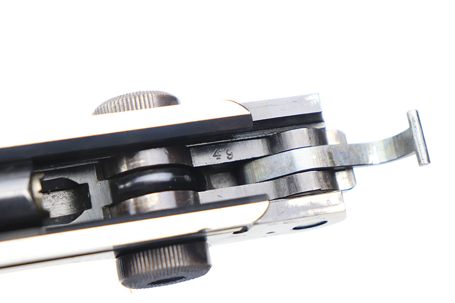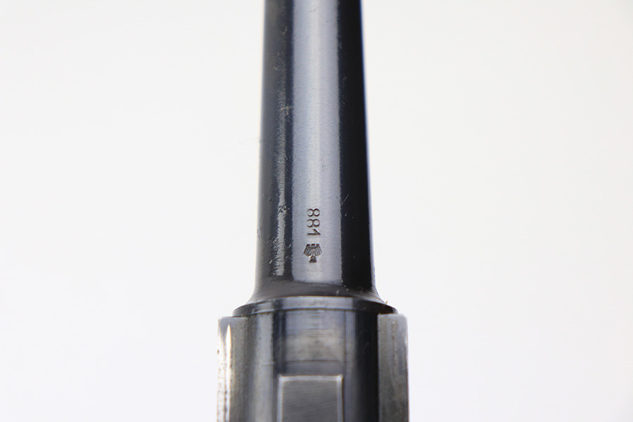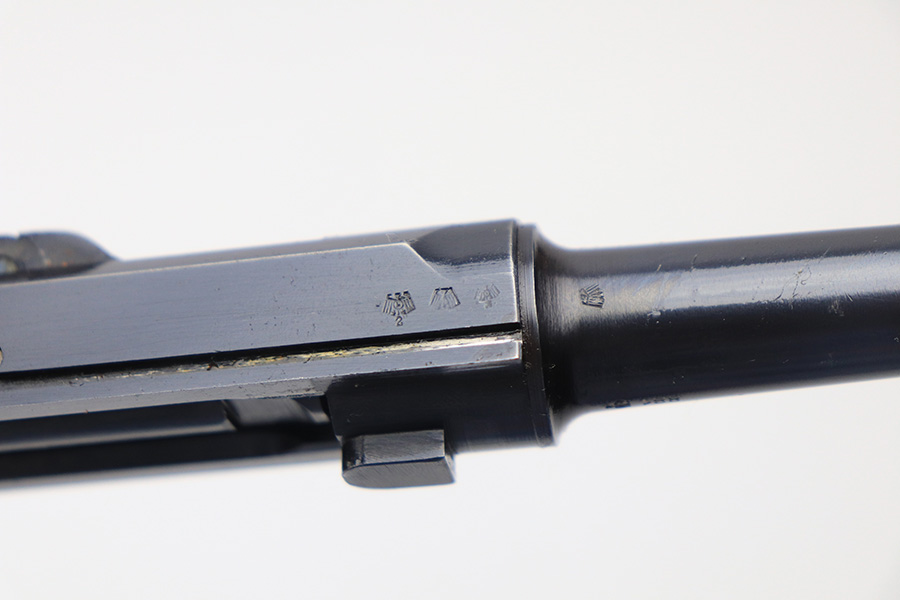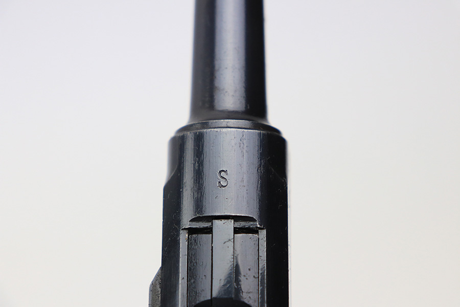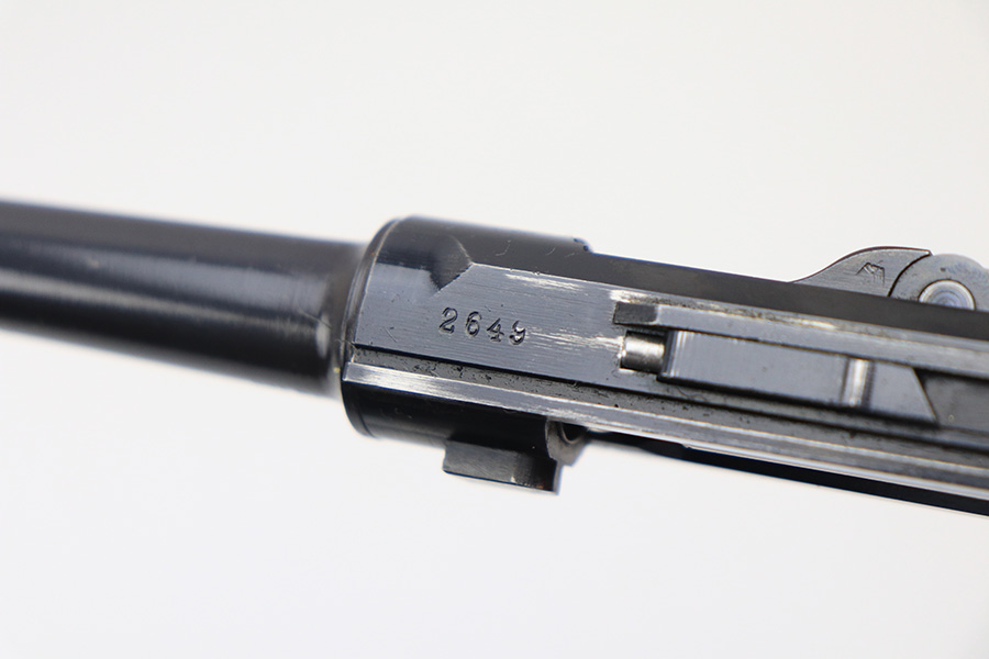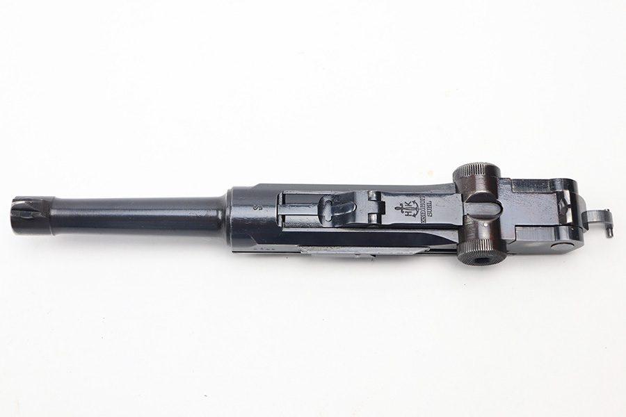 1/5/22 – This is an original, complete Krieghoff Upper assembly for a P.08 pistol. The assembly is complete, meaning all small parts are included such as the firing pin, coupling link, toggle pin, and sear bar. The blued finish throughout the upper is in great shape. There is mild finish loss around the muzzle, and typical rub wear around the edges of the slide and other moving parts. The firing pin and toggle pin are both non-numbered. The firing pin is Krieghoff proof stamped (correct). See photos. Fully functional with a bore that rates 9/10.