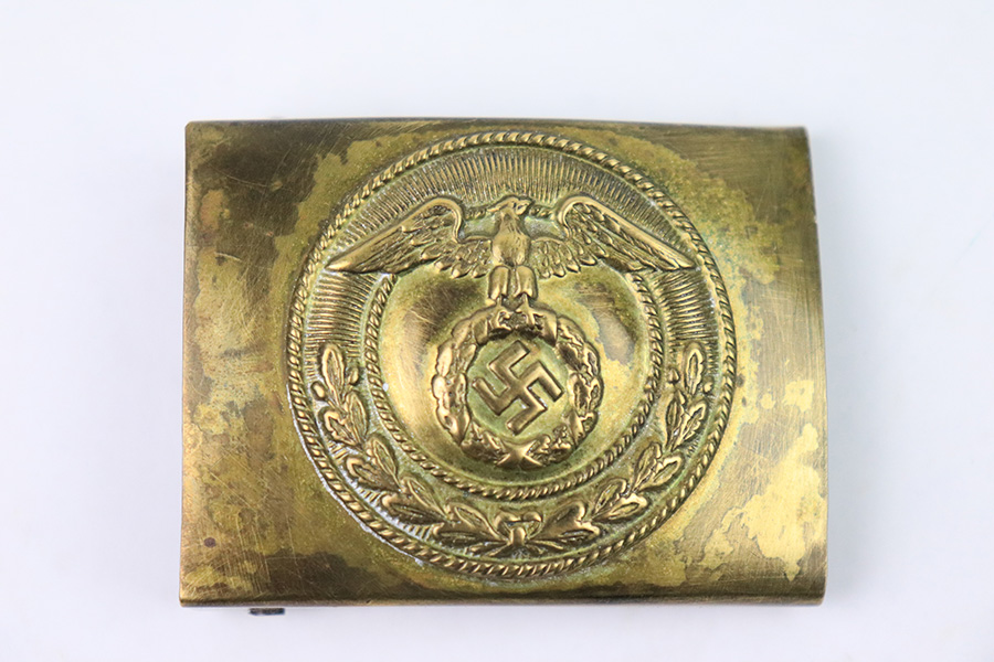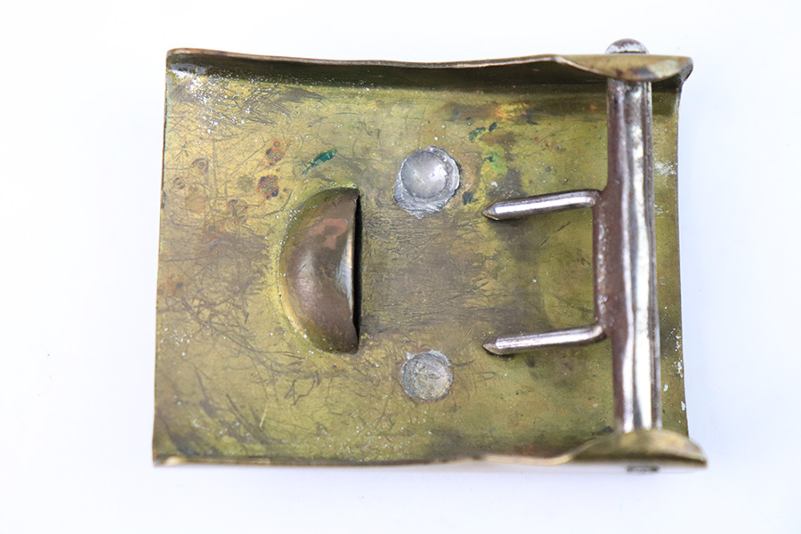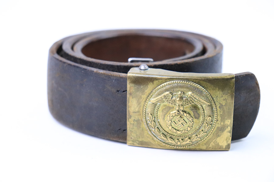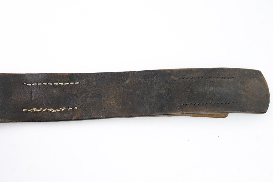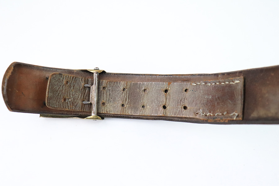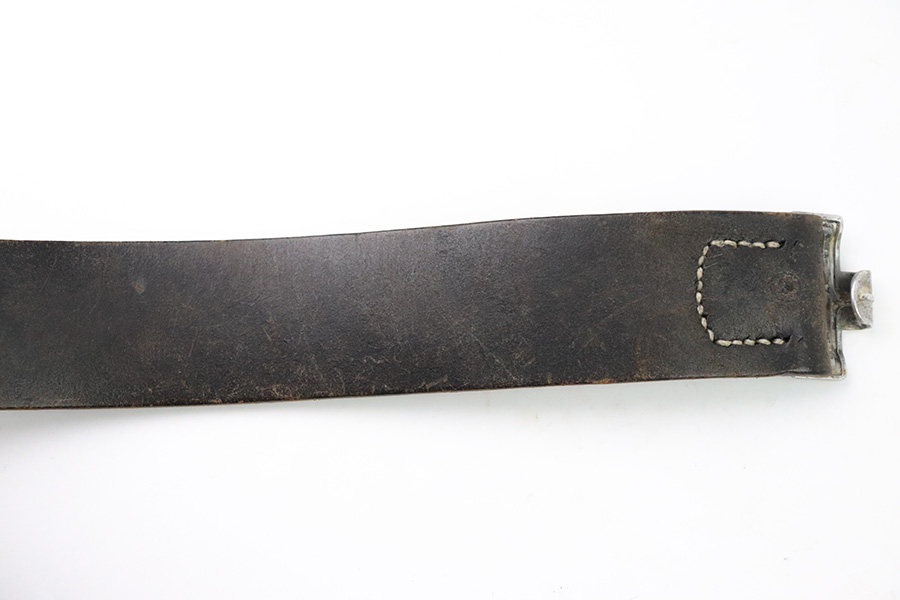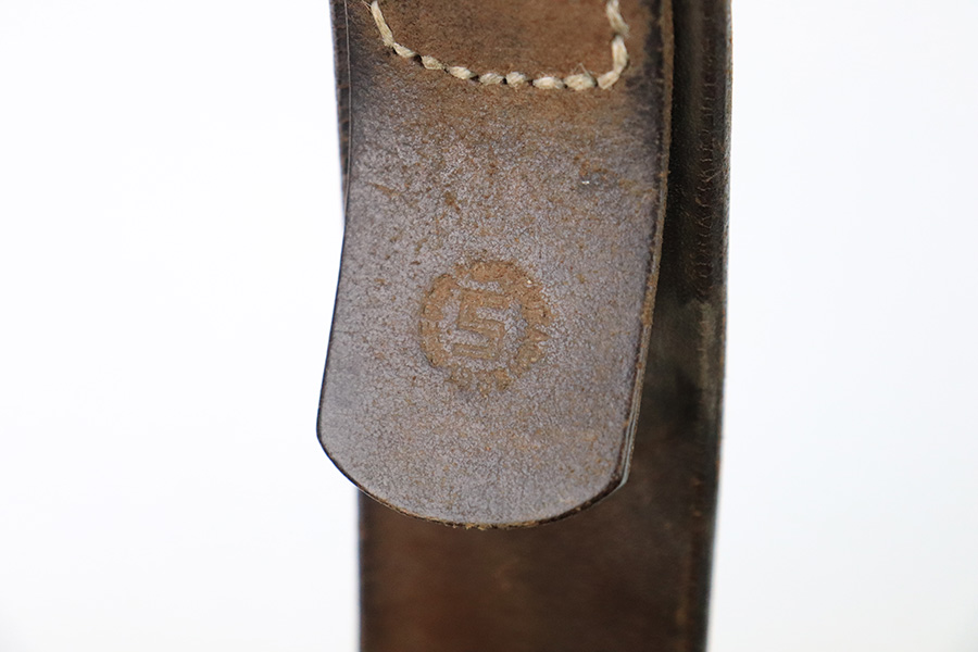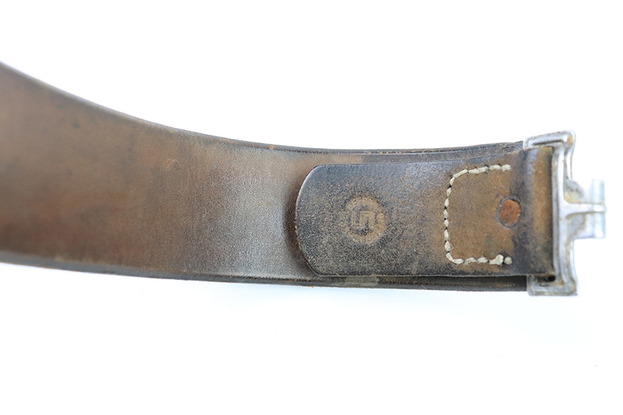12/22/22 – This is an original WW2 SA Belt and buckle. The buckle is in very good condition with some exterior surface patina and mild discoloration. The reverse of the buckle has no maker marking or stamps. 1930s style WW2 interior hook. The leather belt is in very good condition with mild surface wear throughout. The stitching on the belt has been replaced (not original stitching). Near the hooked-end of the belt is a maker stamp as shown.